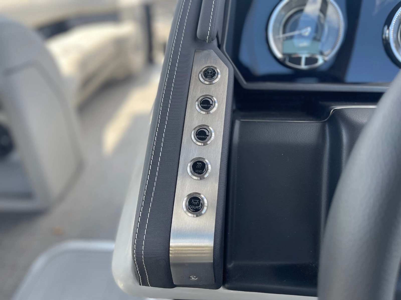The 2025 Barletta Lusso L25UCA is loaded with special features that enhance both comfort and style. The adjustable pedestal on the captain's chair allows for personalized comfort, ensuring the captain enjoys every moment at the helm. The double bimini arch models provide ample shade, making long days on the water more enjoyable and protecting you from the sun’s rays. The exterior lighting, including white underdeck and underwater lights, creates a captivating ambiance during evening cruises and adds a layer of safety and visibility. The Metal Jacket Protectant on the exterior ensures your boat maintains its pristine appearance, offering added durability against the elements. The Blue Sapphire accent color further elevates the boat’s visual appeal, making it a true head-turner on any lake or river.