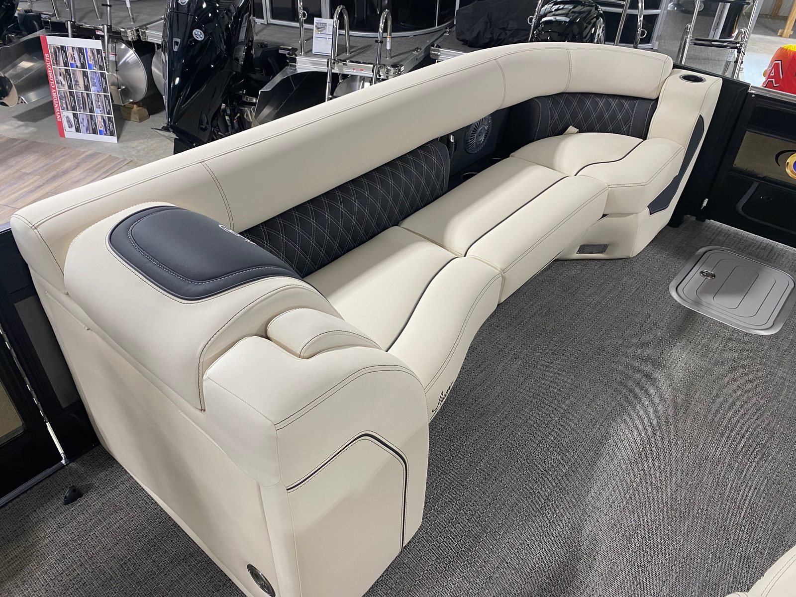 Step aboard the Lusso L25UCA and you’ll immediately notice its attention to detail and premium finishes. The Blackout Package Lusso railskin adds a touch of sophistication, while the furniture in Linen with Onyx creates a welcoming and stylish atmosphere. The flooring, finished in Amore Gray, is both elegant and practical, providing comfort underfoot and easy maintenance. Exterior lighting, including white underdeck and underwater lights, enhances the ambiance for evening cruises and adds a layer of safety when navigating after sunset.The Lusso L25UCA is designed for those who appreciate the finer things in life. Every element, from the color scheme to the furniture selection, has been chosen to create a harmonious and luxurious environment. The spacious deck layout allows for flexible seating arrangements, perfect for socializing, sunbathing, or enjoying a meal with loved ones. The pontoon’s sturdy construction and high-quality materials ensure durability and longevity, so you can enjoy your investment for years to come.