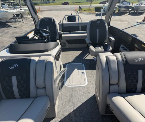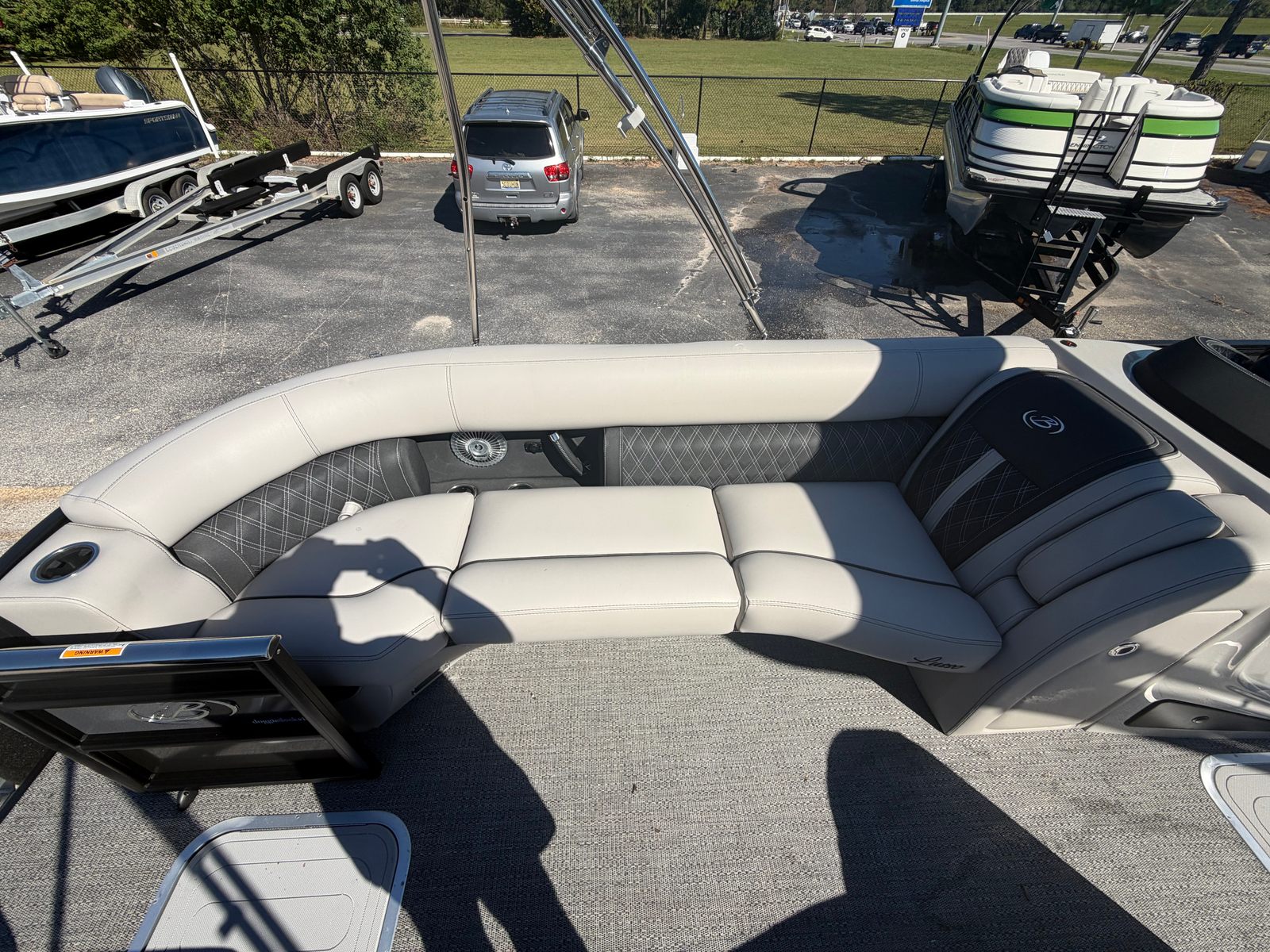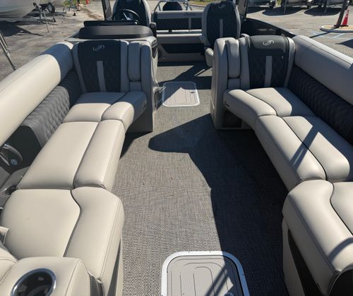 Step aboard the 2026 Barletta Lusso L25UCA and experience the next level of pontoon boating. Measuring an impressive 27.5 feet in length, this pontoon offers ample space for guests, gear, and activities. The Lusso series is renowned for its attention to detail, and the L25UCA model is no exception. Its contemporary styling, highlighted by the Gray Moonstone sweep color and Black Diamond accent, ensures you’ll turn heads at every marina and on every lake. The Blackout Package Lusso adds a touch of elegance and modern flair, while the Marquesan Gray with Onyx furniture and Amore Gray flooring create a comfortable and inviting atmosphere for all aboard.