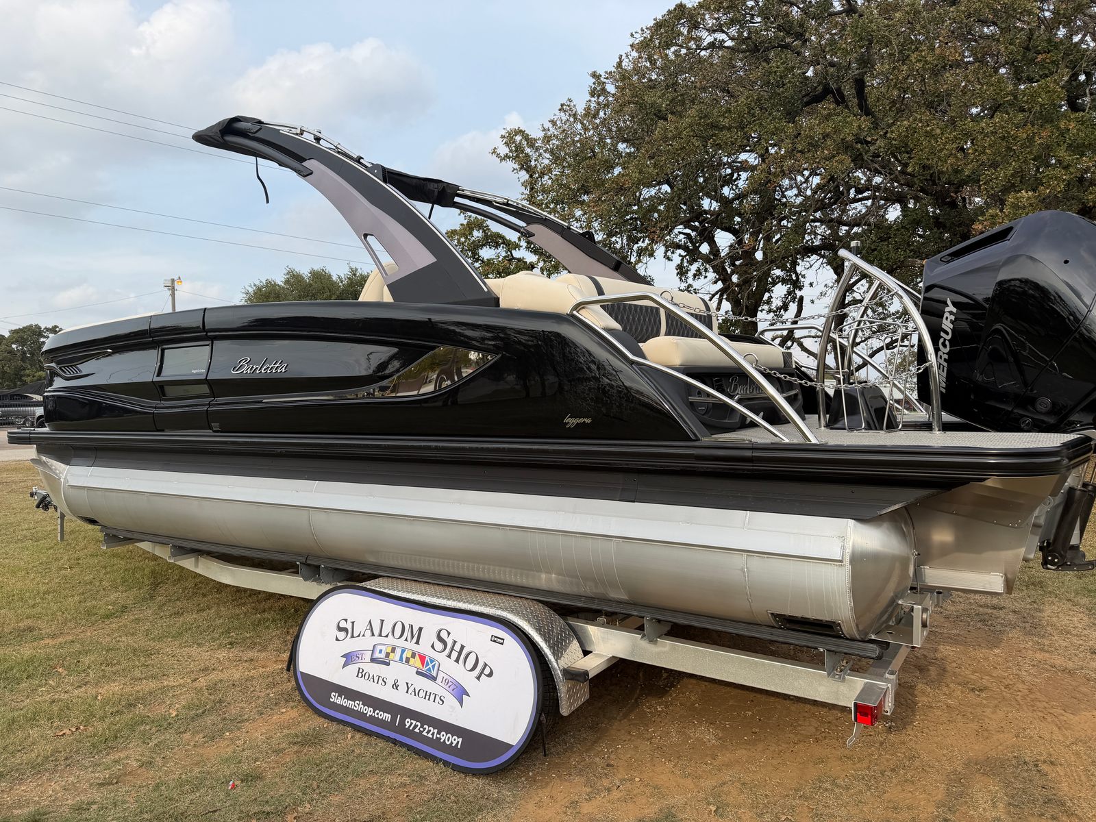 The 2026 Barletta Reserve Leggera 23UCA is a brand-new pontoon boat that measures an impressive 25.5 feet in length. This spacious layout provides ample room for friends and family, ensuring everyone can relax and enjoy the ride in comfort. The sleek, all-black exterior color gives this pontoon a modern and commanding presence on the water, while the Amore Gray flooring and Linen with Onyx furniture create a refined and inviting atmosphere. Whether you are cruising a calm lake or hosting a lively gathering, this Barletta boat for sale stands out with its stylish design and attention to detail.