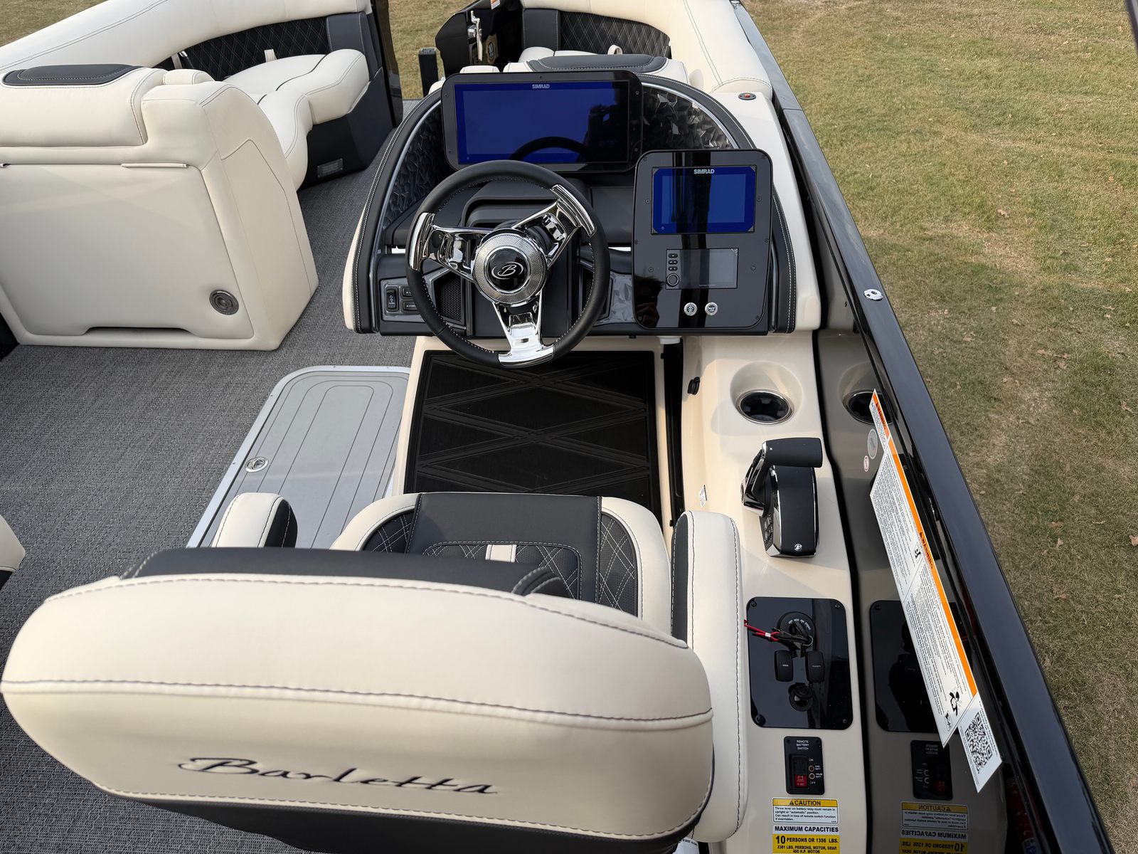 The Barletta Reserve Leggera 23UCA is loaded with premium features designed to elevate your boating experience. The standard all-black color scheme exudes sophistication, while the Amore Gray flooring is both stylish and practical, providing a comfortable surface that is easy to maintain. The Linen with Onyx furniture offers plush seating and a luxurious feel, ensuring every passenger enjoys maximum comfort. The Mercury (D) 400L V10 Verado engine is a powerhouse, and the Mercury Digital Pre-Rig for V10 ensures seamless integration and control. The engine is expertly rigged with a V10 prop for optimal efficiency and performance. At the helm, the AccuThruster System delivers precise control, making every journey smooth and enjoyable.