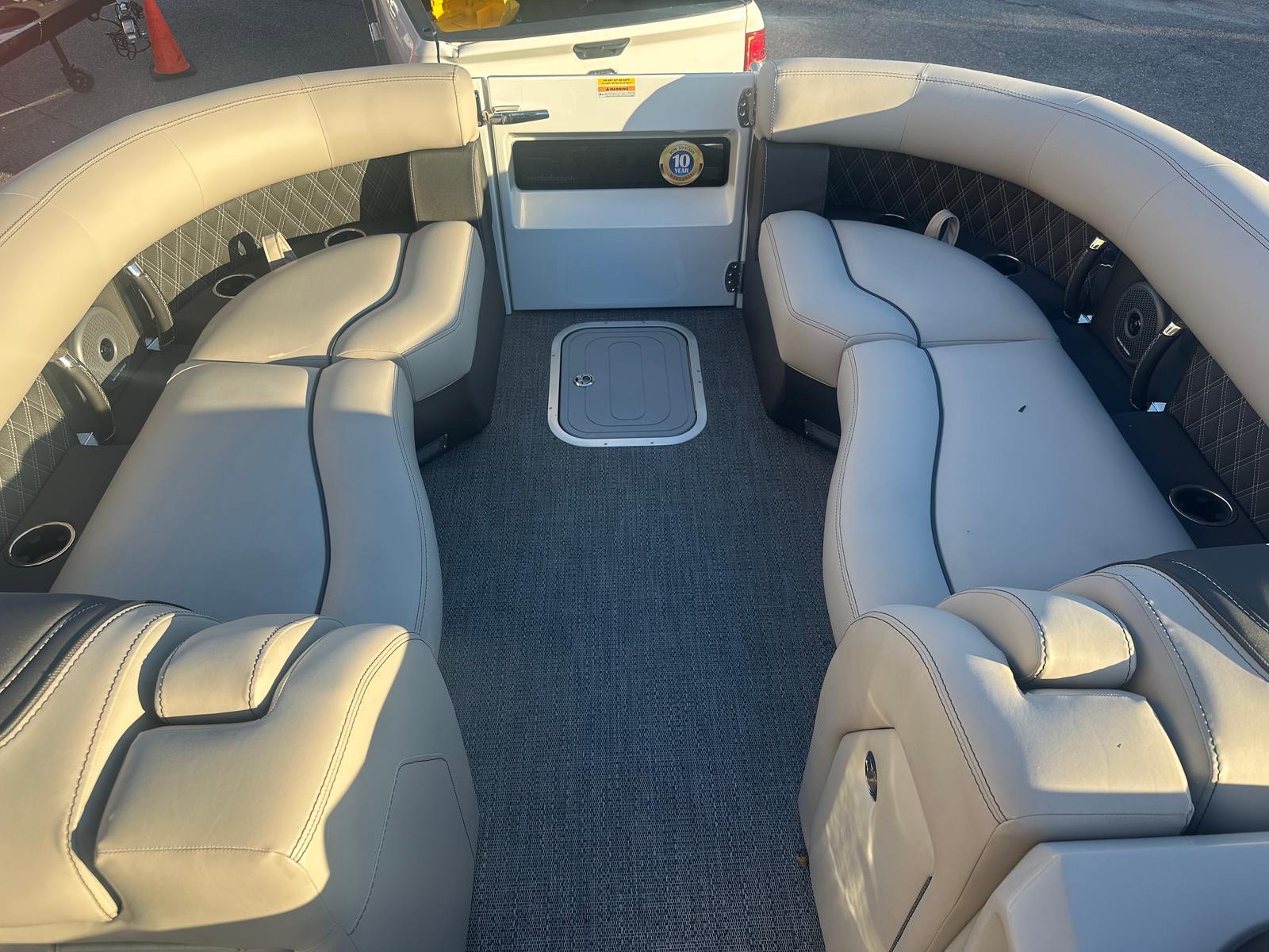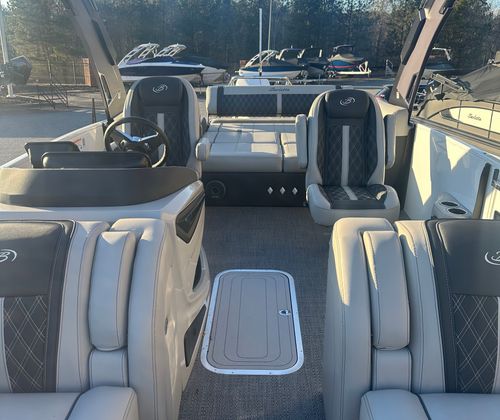 Step aboard the Reserve Leggera 23UCA and you’ll immediately notice its luxurious Marquesan Gray furniture with Onyx accents, providing both comfort and elegance. The Amore Gray flooring adds a touch of sophistication while offering durability and easy maintenance, perfect for active days on the water. The all-white exterior not only enhances the boat’s visual appeal but also reflects sunlight, keeping the deck cooler during warm summer outings. The Mercury Digital Pre-Rig for V10 ensures seamless integration with the engine, while the rigging with a V10 prop maximizes performance and fuel efficiency. Every detail of this pontoon boat is designed to elevate your boating lifestyle.