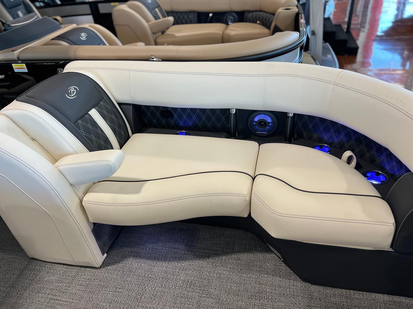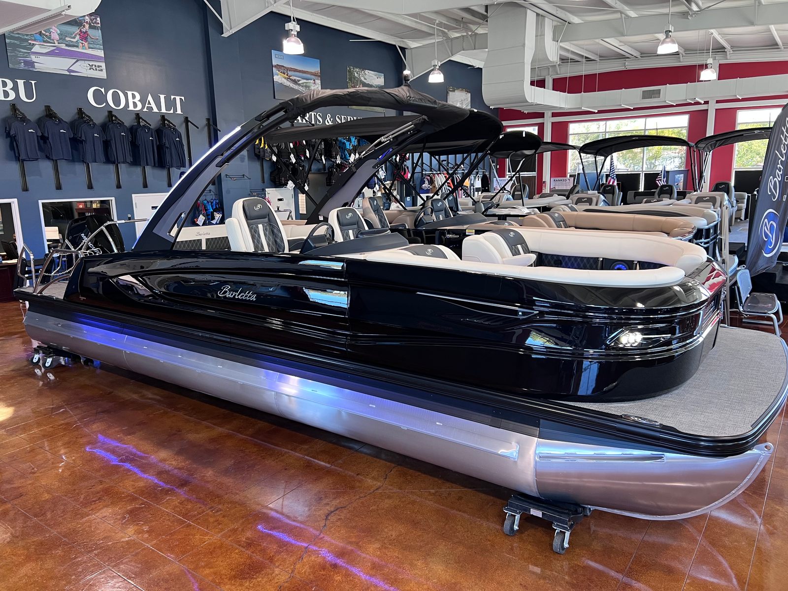 The Barletta Reserve Leggera R26UCA is a 2026 pontoon boat that stretches an impressive 28.5 feet in length, offering ample space for family, friends, and guests. Its sleek, all-black exterior is complemented by elegant linen furniture with onyx accents, creating a sophisticated atmosphere that’s perfect for entertaining or relaxing. The Amore Gray flooring adds a modern touch, ensuring every detail of this pontoon is designed with both aesthetics and durability in mind. As a new pontoon boat for sale, this Barletta model represents the latest in marine innovation and craftsmanship.
