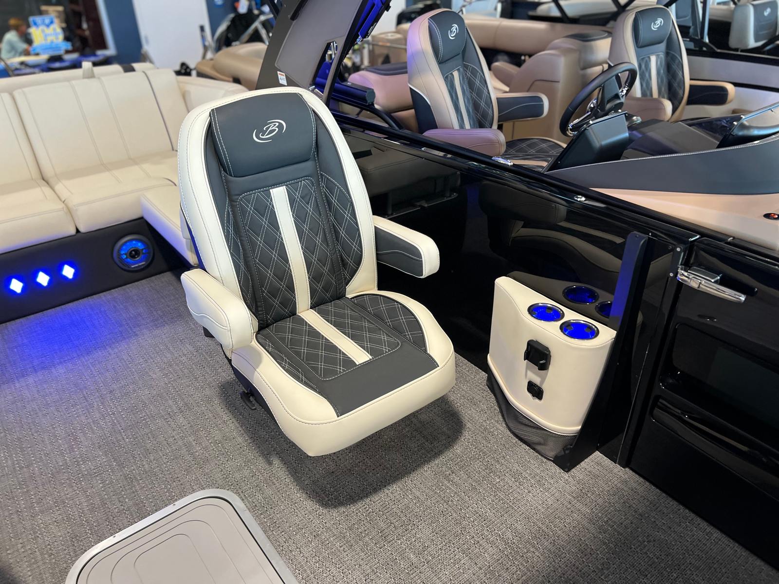 The Barletta Reserve Leggera R26UCA is packed with premium features that elevate your boating experience. The standard all-black color scheme exudes sophistication, while the linen furniture with onyx detailing provides plush comfort and a refined look. The Amore Gray flooring is not only stylish but also designed for durability and easy maintenance. The on-board battery charger supports two batteries, ensuring you have reliable power for all your electronics and accessories. Both the captain’s chair and co-captain’s chair feature adjustable pedestals, allowing you to customize your seating position for maximum comfort and visibility at the helm.