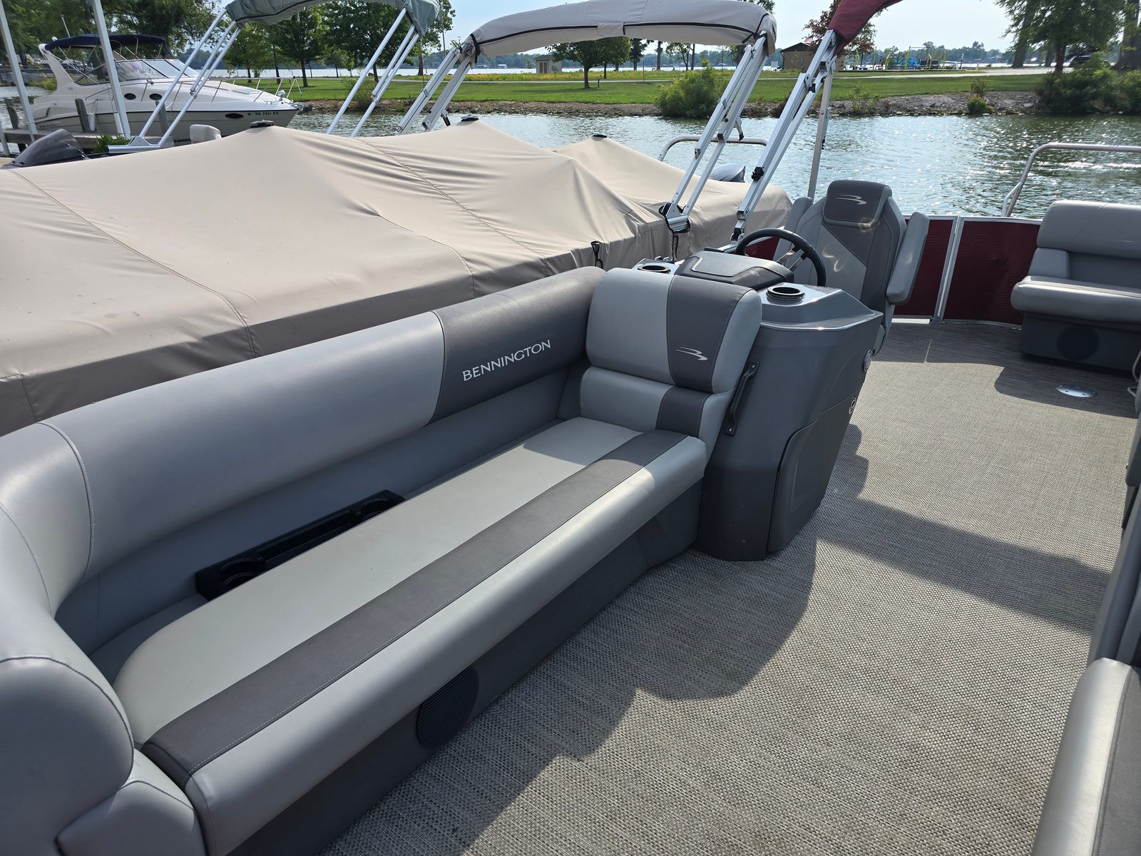 This Bennington pontoon boat is packed with features designed to maximize comfort, style, and functionality. The Shadow Grey and Anthracite color scheme, paired with the bold Rossa Red canvas and panel, creates a visually stunning appearance that stands out in any marina. The Base Furniture with Simtex Upholstery offers plush seating and durability, ensuring you and your guests can relax in style. The Dimensional Brushed Logo adds a premium touch, while the Extended Aft Deck STD Trim S SPS provides additional space for lounging, swimming, or preparing for water sports. The Ski Tow Black EAD S makes it easy to enjoy tubing, wakeboarding, or skiing, adding an extra layer of excitement to your boating experience.