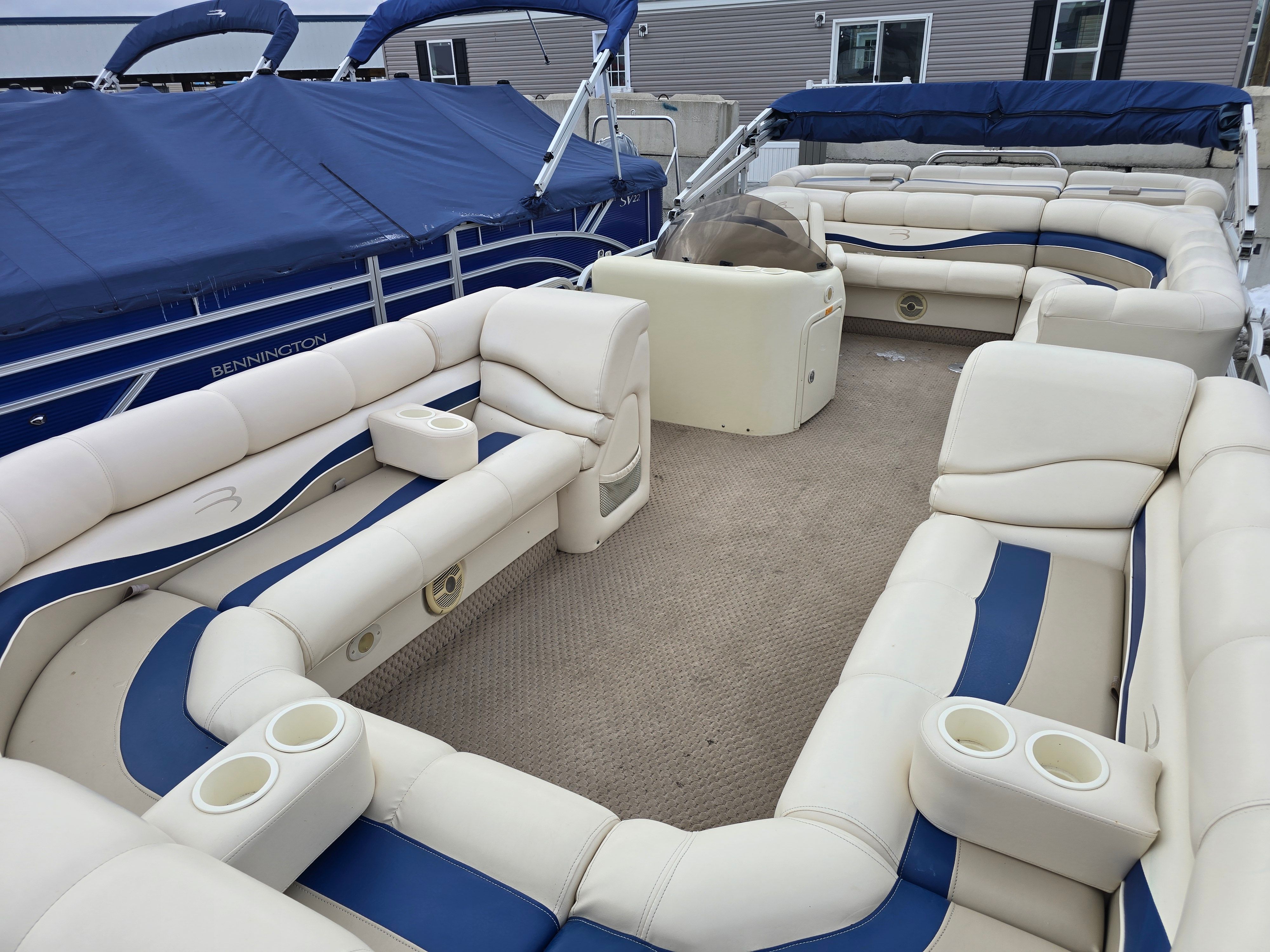 The Bennington 2280 RL is designed with comfort and convenience in mind. Its spacious deck layout provides plenty of seating for family and friends, making it the perfect platform for social gatherings, picnics, or simply relaxing in the sun. The pontoon’s 22-foot length offers generous room for movement, while the sturdy railings and well-placed entry points ensure safety and accessibility for all passengers. The thoughtful design of this Bennington boat for sale means you’ll enjoy a welcoming atmosphere every time you step aboard.