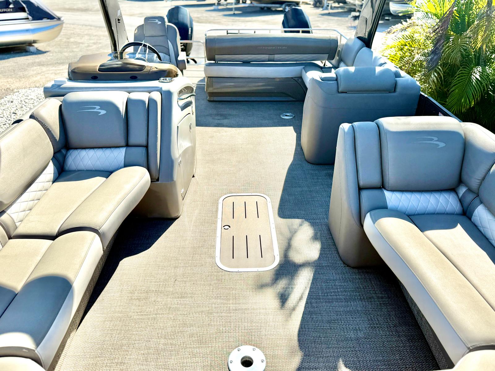 The versatility of the Bennington 28 RSB makes it the perfect choice for a variety of on-water activities. For families, it’s an ideal platform for swimming, picnicking, and exploring new destinations together. The spacious deck and comfortable seating make it easy to host gatherings, celebrate special occasions, or simply enjoy quality time with loved ones.Fishing enthusiasts will appreciate the stability and space offered by this pontoon boat, providing a comfortable and functional base for casting lines and reeling in the day’s catch. For those seeking a touch of luxury, the Bennington 28 RSB transforms any outing into a high-end experience, complete with stylish surroundings and powerful performance. Whether you’re seeking adventure, relaxation, or a bit of both, this pontoon boat for sale is ready to deliver.