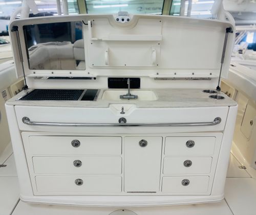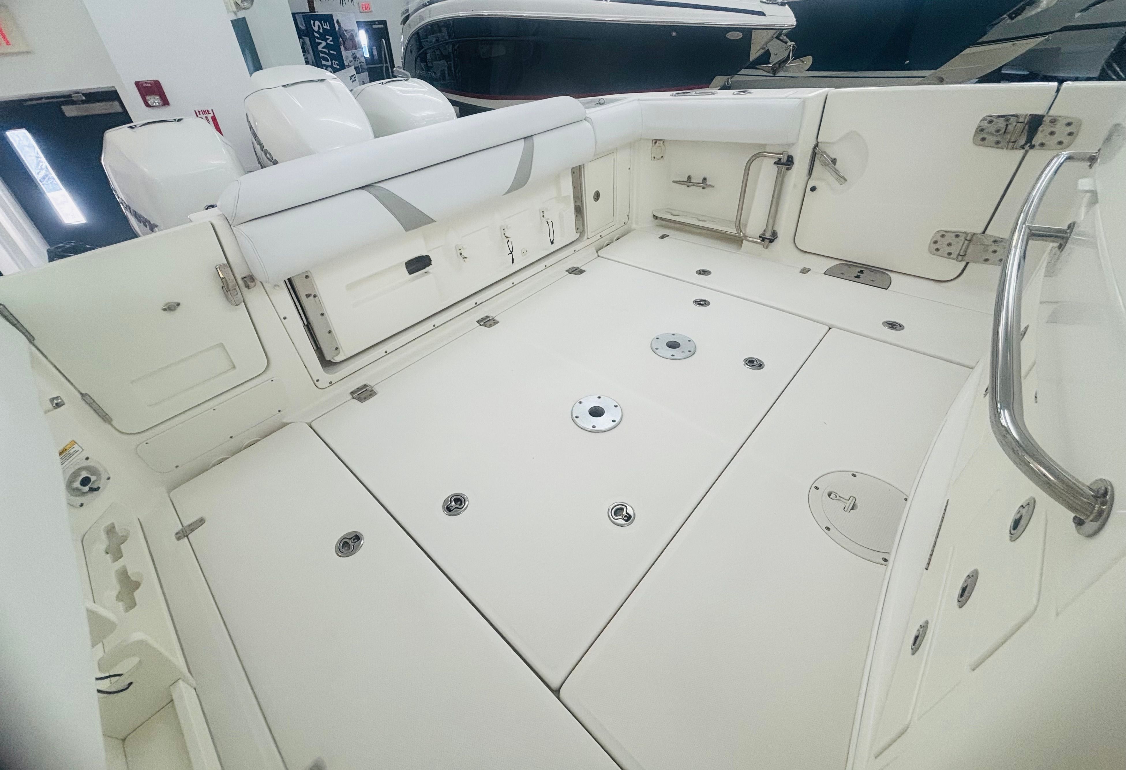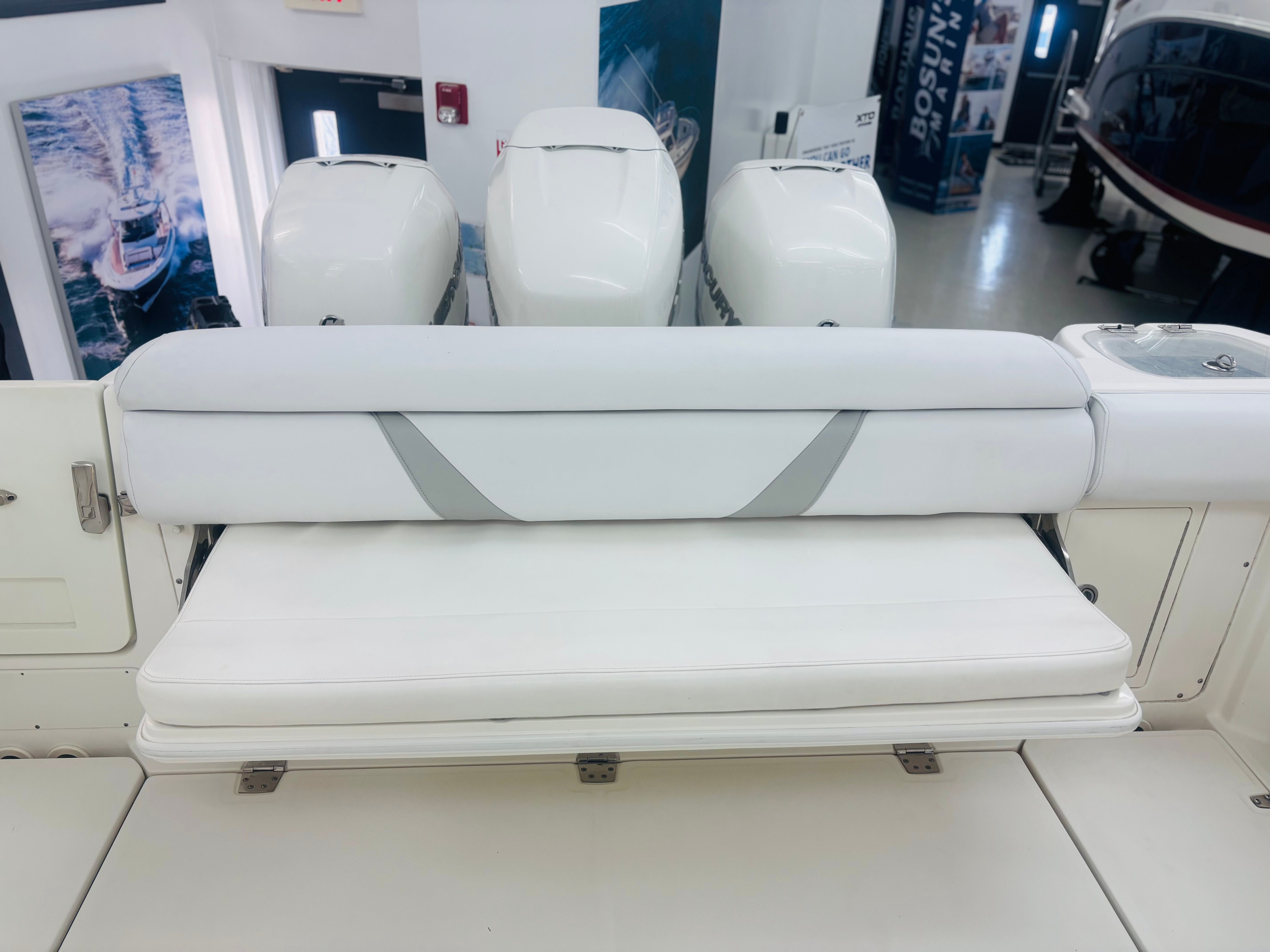 Under the hood, this 370 Outrage is powered by three robust engines, delivering a combined horsepower of 900. This impressive power setup ensures that you can navigate through various water conditions with ease and confidence. Whether youre slicing through calm lakes or handling the waves of the open ocean, the 900 horsepower engines provide the speed and agility that every boating enthusiast desires. The exceptional performance of this center console boat for sale guarantees an exhilarating ride every time you set sail.