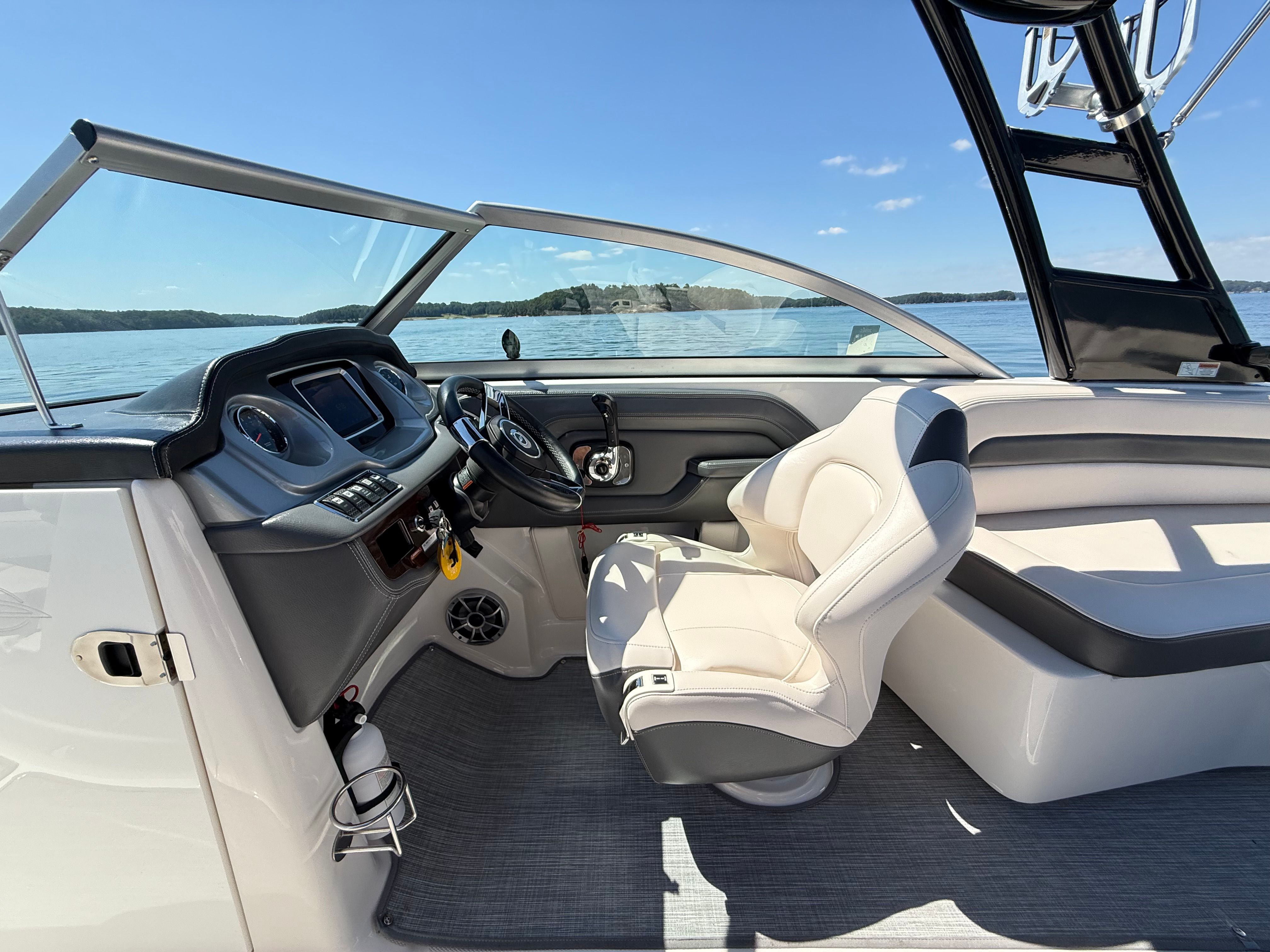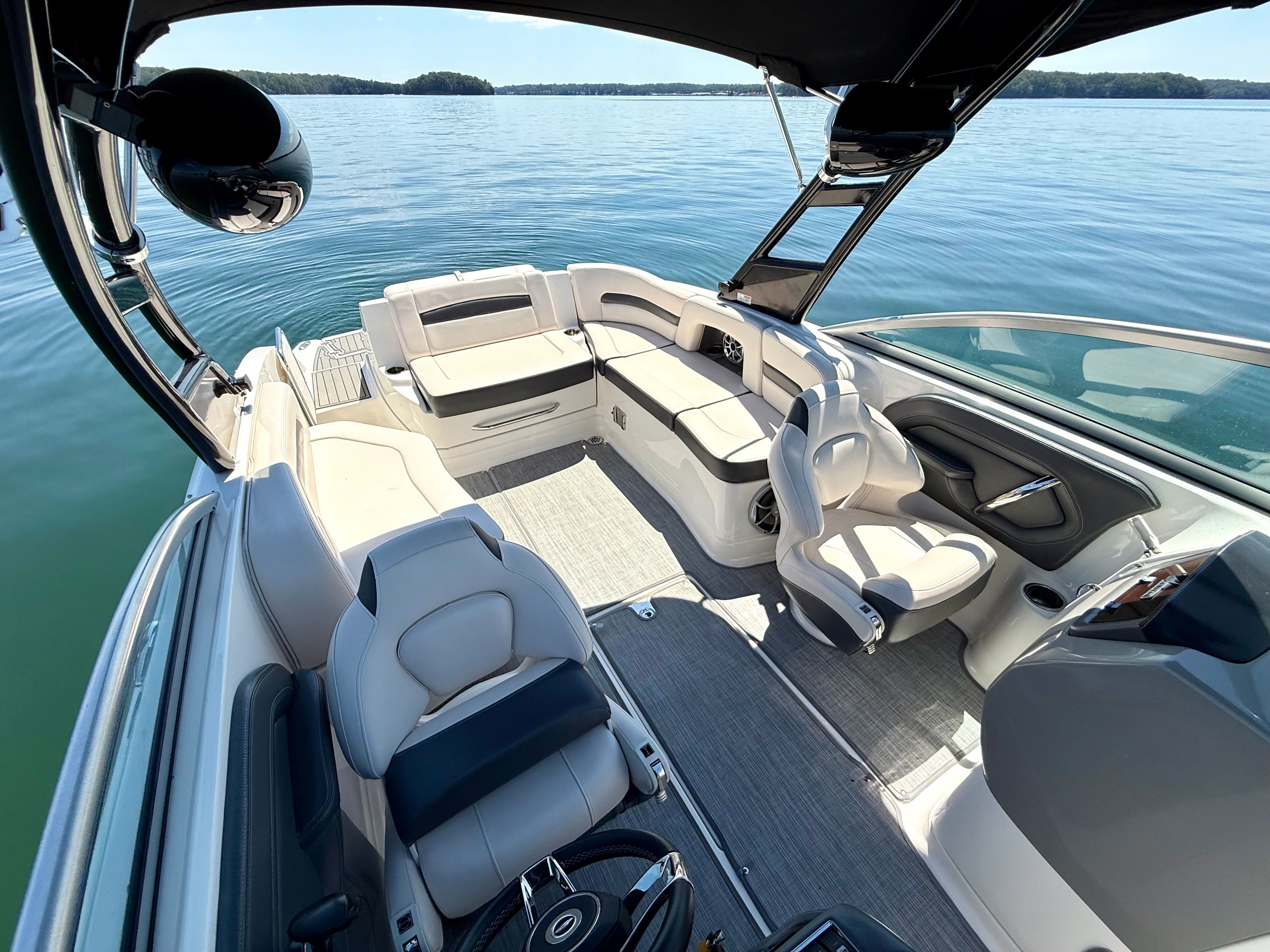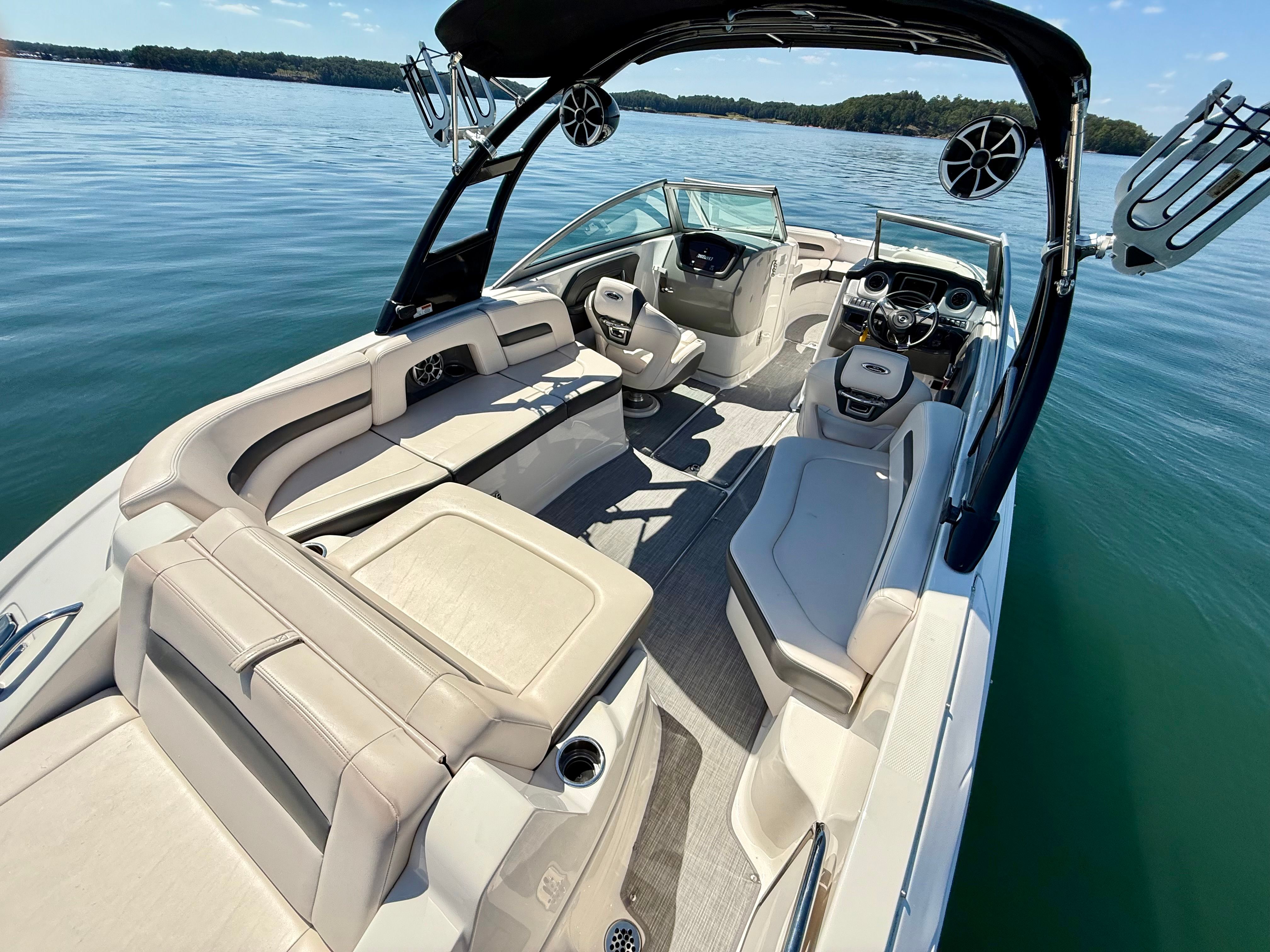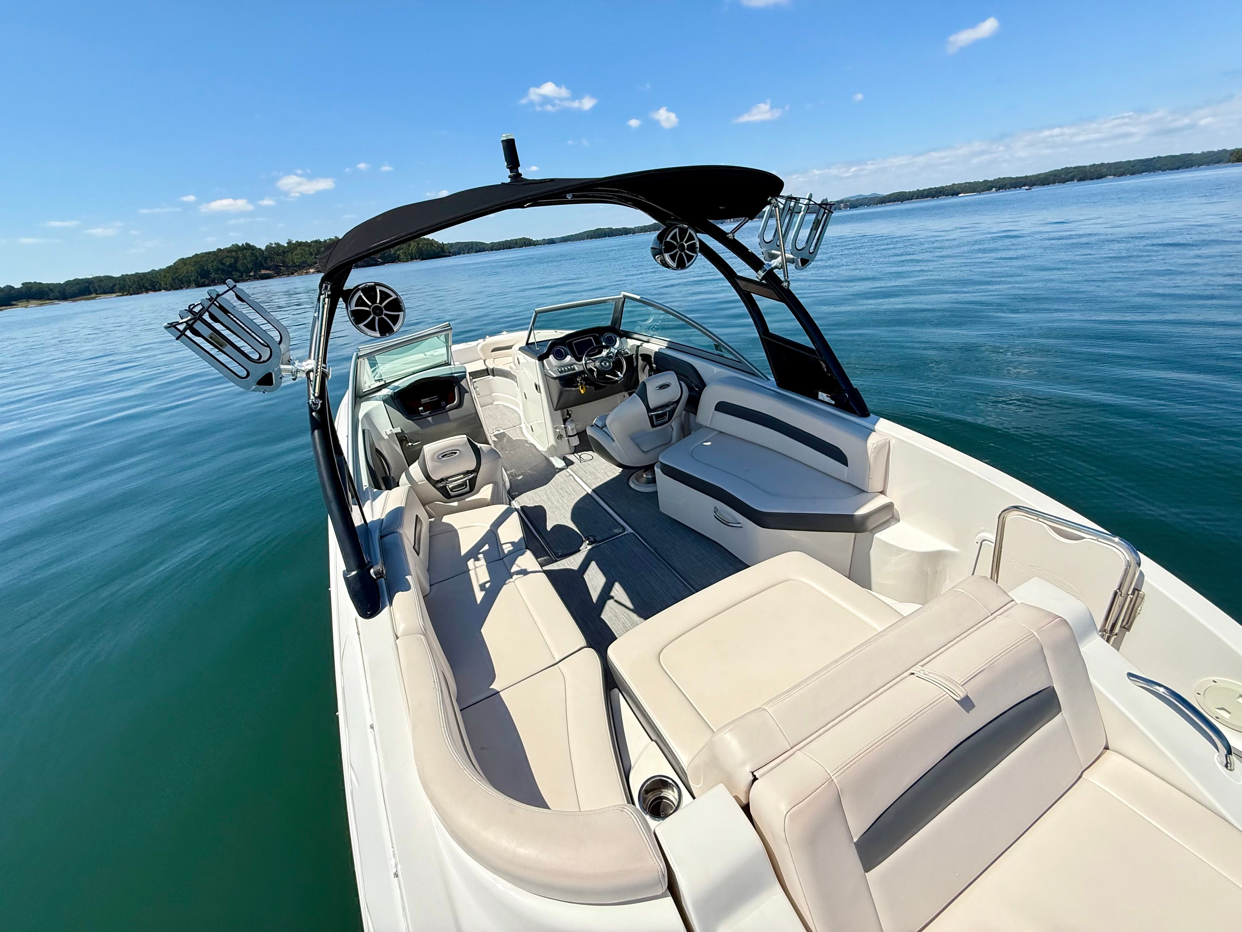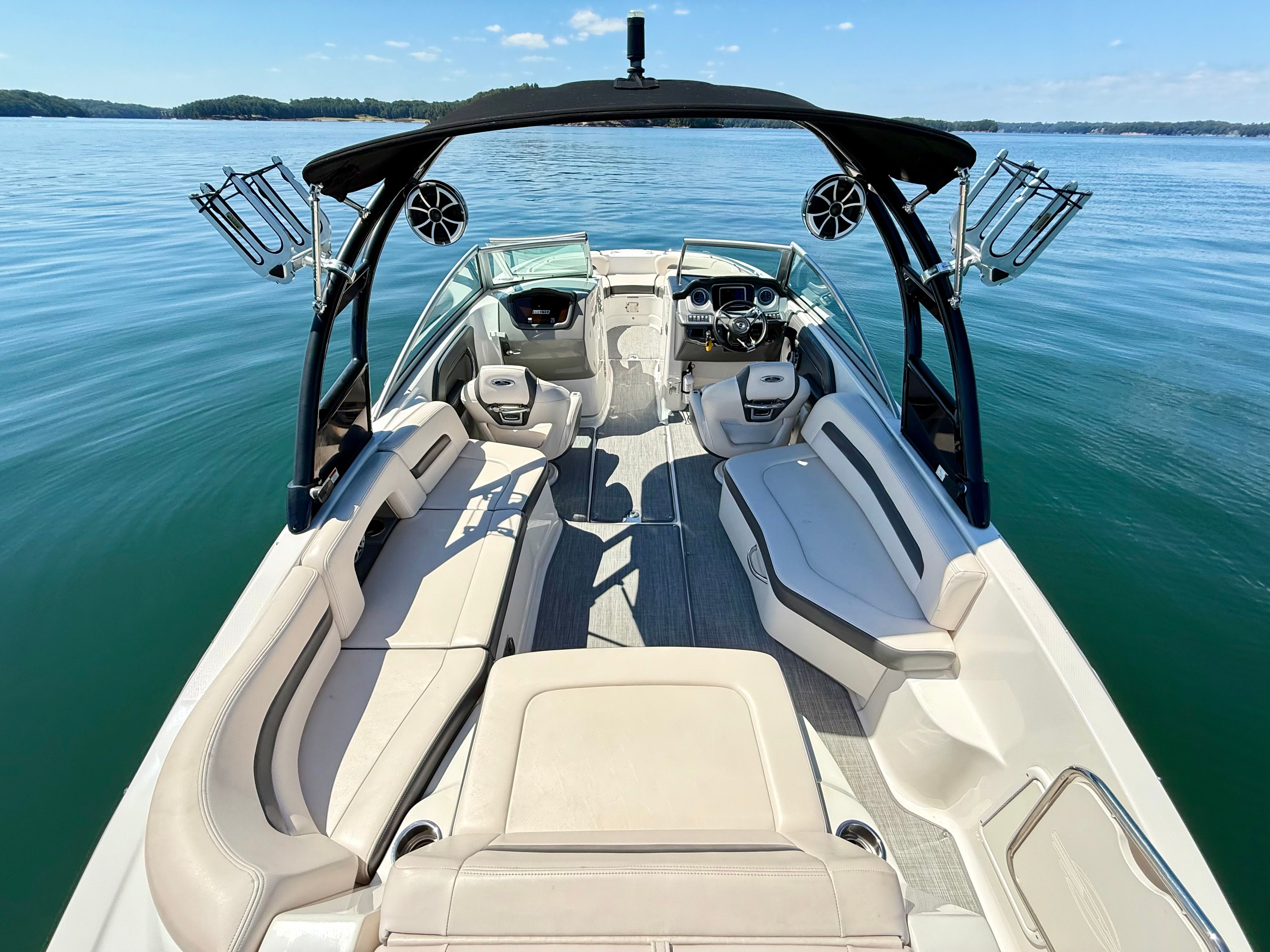 Powered by a Volvo Penta V8 300hp Forward Drive with only 280 hours, this boat combines luxury, power, and watersport performance in a sleek, family-friendly package.