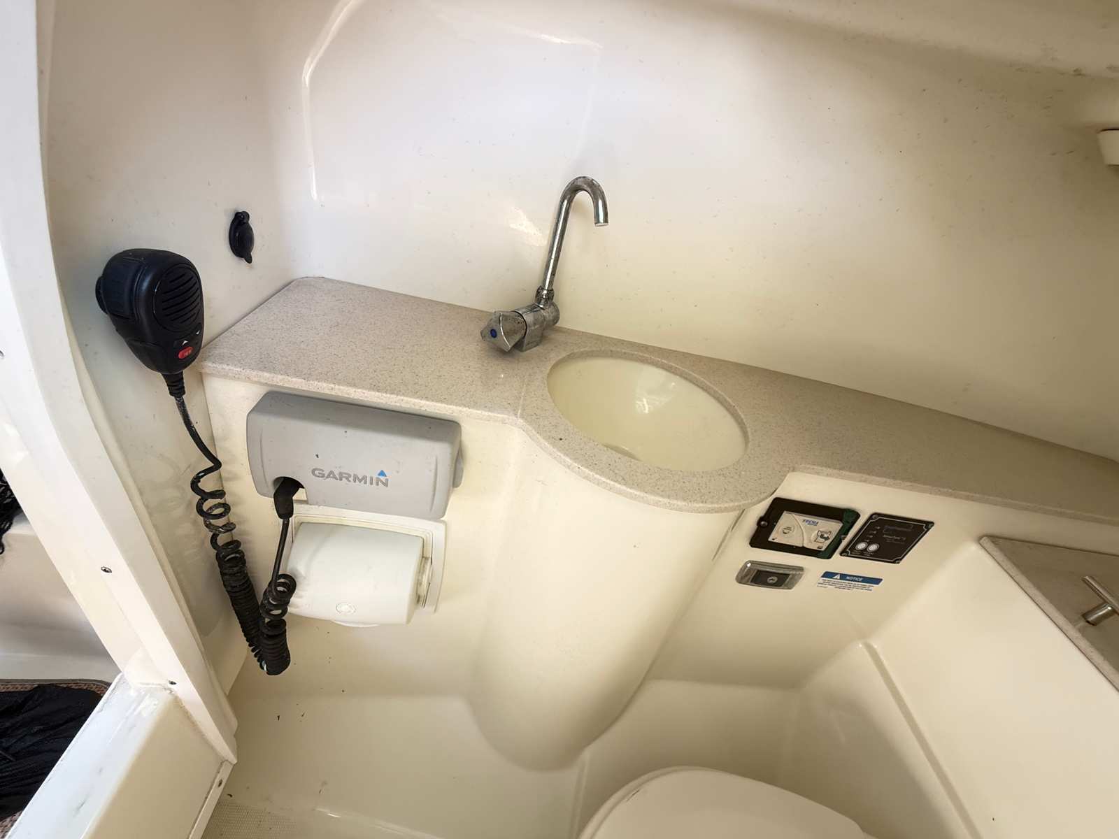 • Powder Coated Sport Arch with oversized Bimini Top and retractable aft sunshade