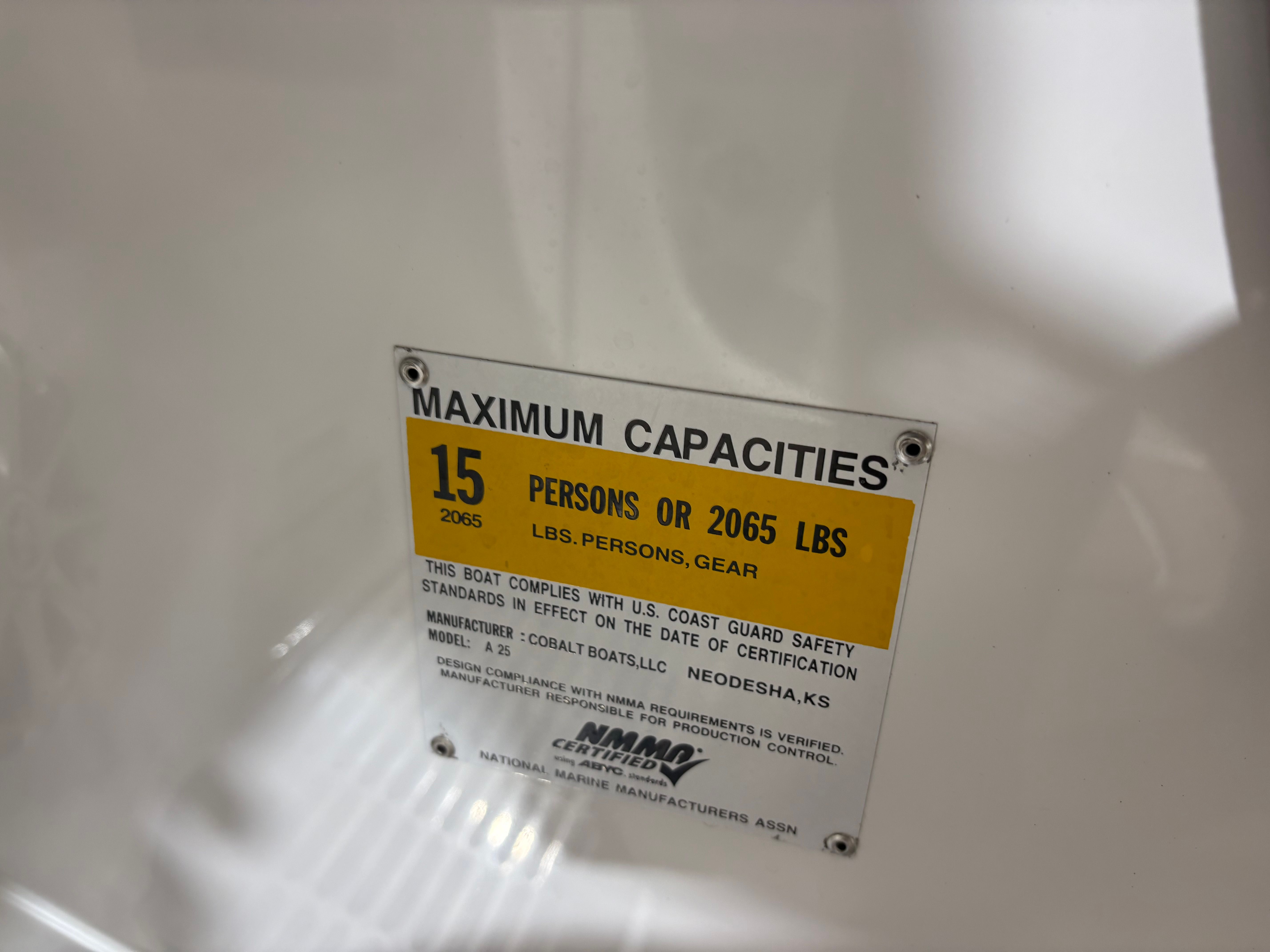 The Cobalt A25 is renowned for its thoughtful features and high-quality construction. The spacious bowrider layout provides plenty of seating for friends and family, making it ideal for social gatherings and group adventures. The ergonomic helm is designed for intuitive control, allowing the captain to navigate with confidence and ease. Premium materials and finishes throughout the boat reflect Cobalt’s dedication to craftsmanship and durability, ensuring that this vessel stands the test of time.With a length of 25.06 feet, the A25 offers a generous amount of onboard space, perfect for stretching out and enjoying the sun. The open bow area is ideal for lounging, while the wraparound seating in the cockpit creates a welcoming environment for conversation and relaxation. Storage compartments are strategically placed to keep gear organized and out of the way, enhancing both safety and convenience.