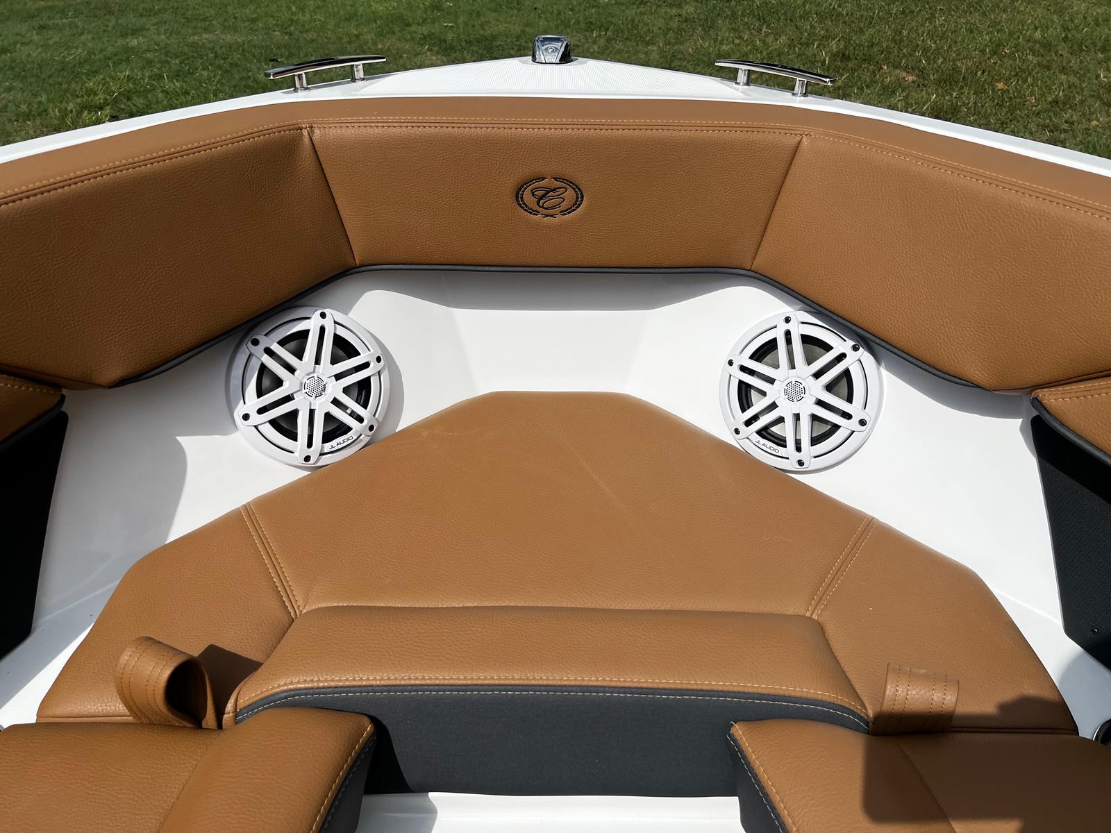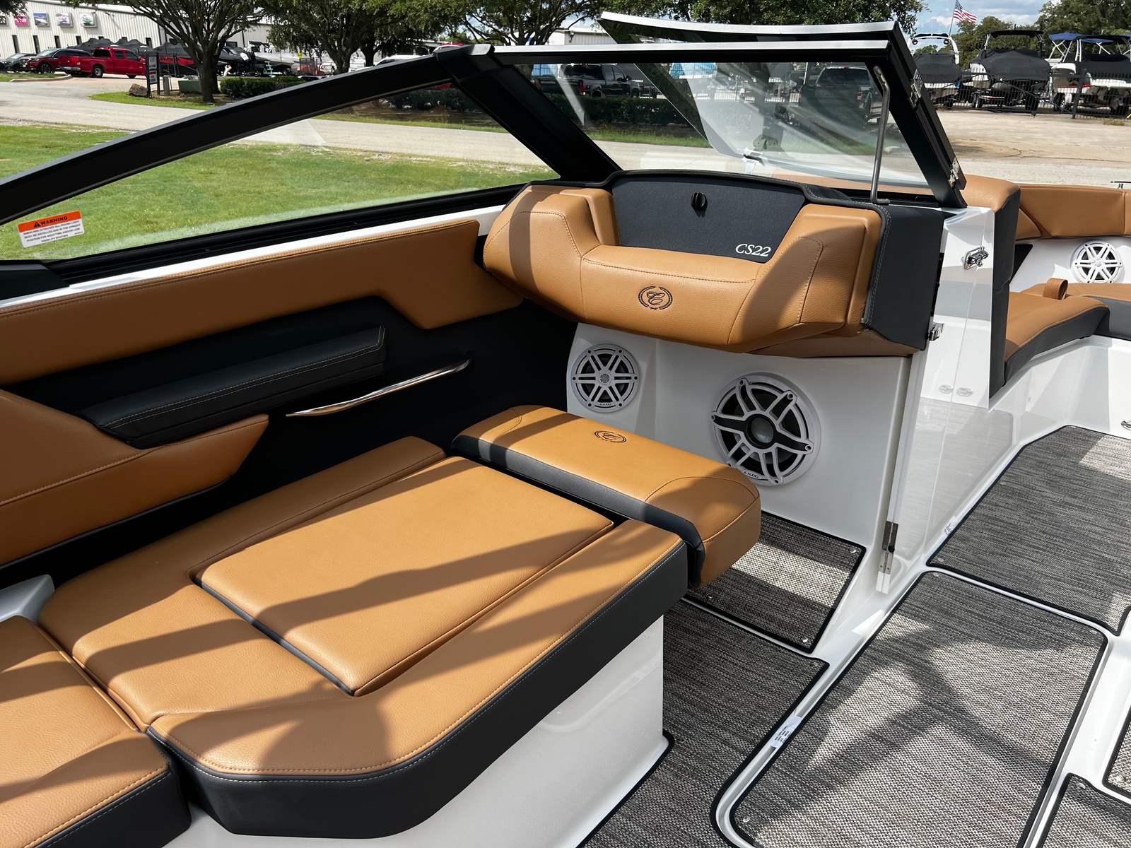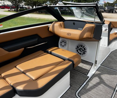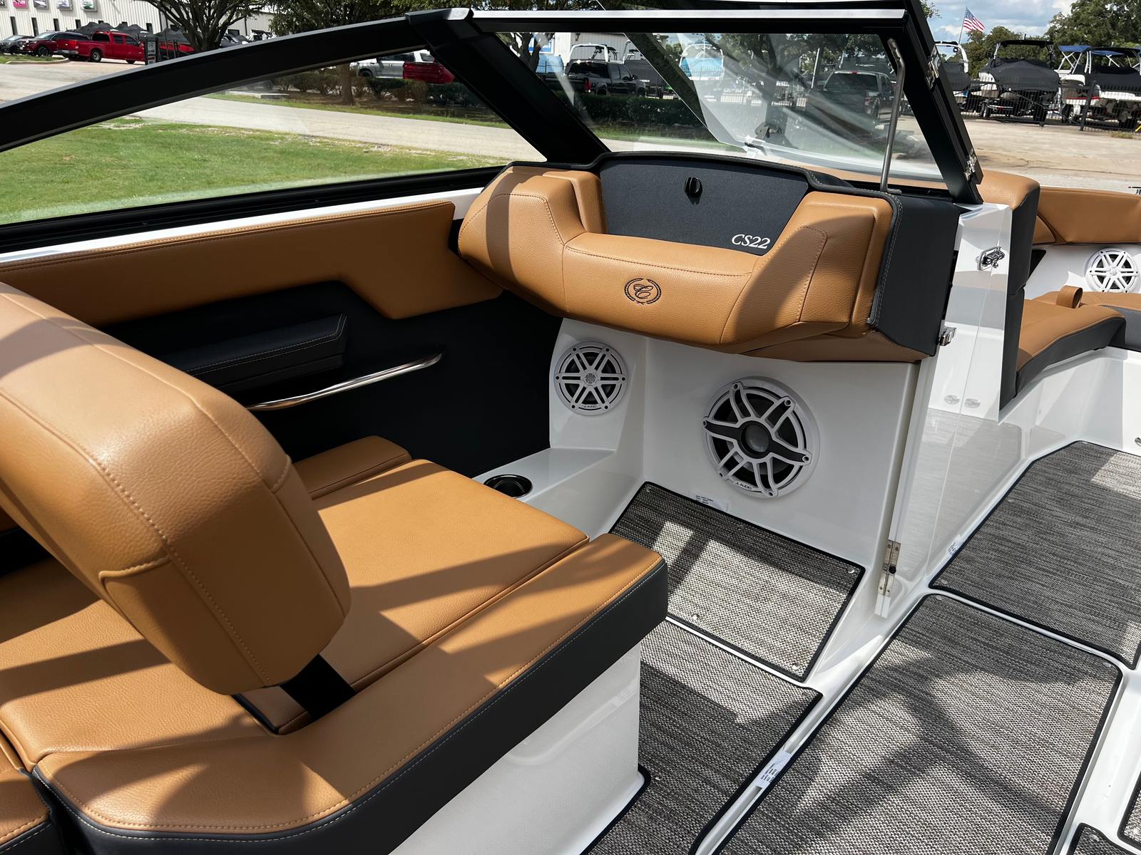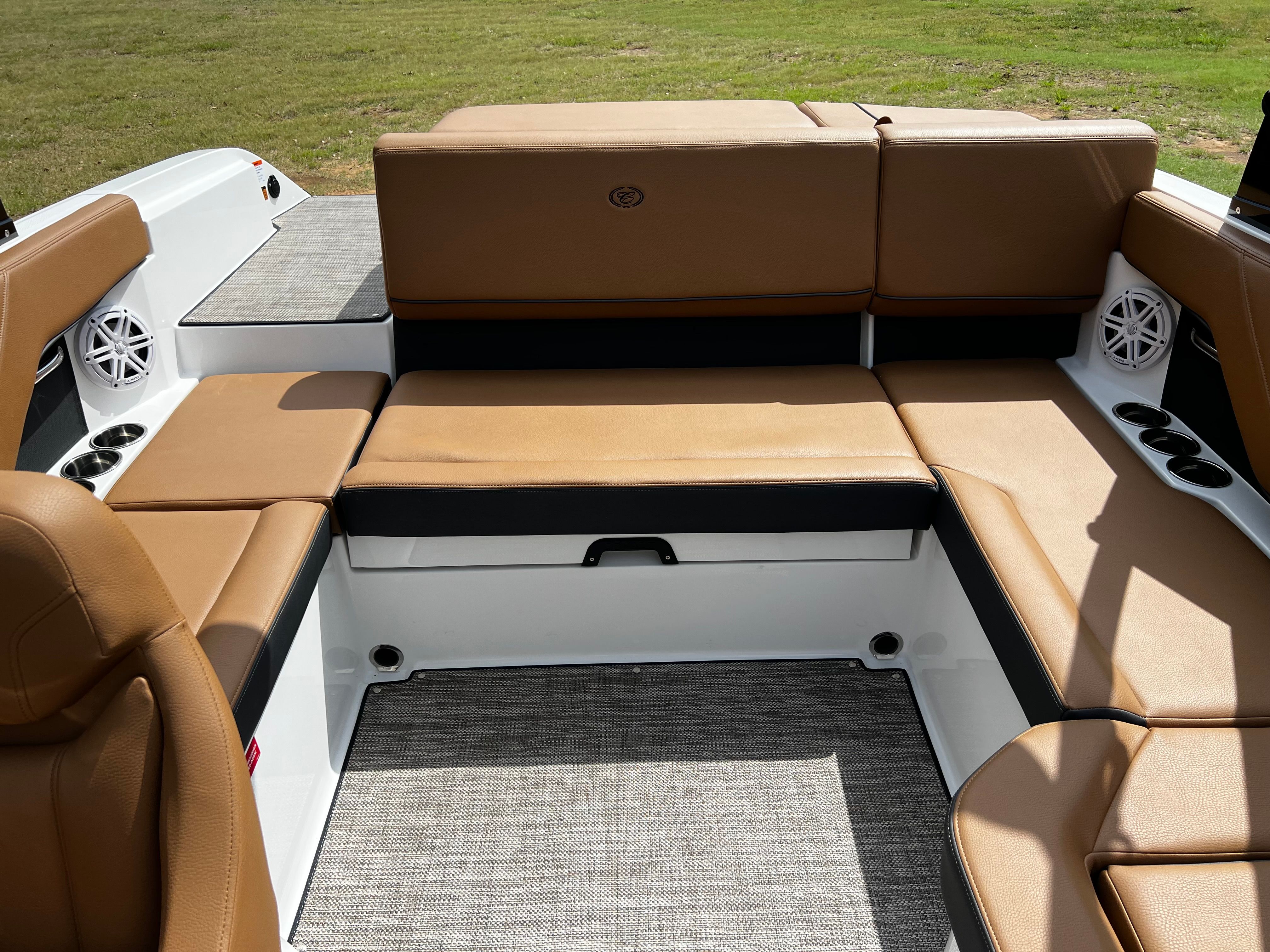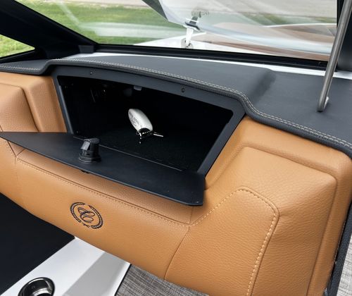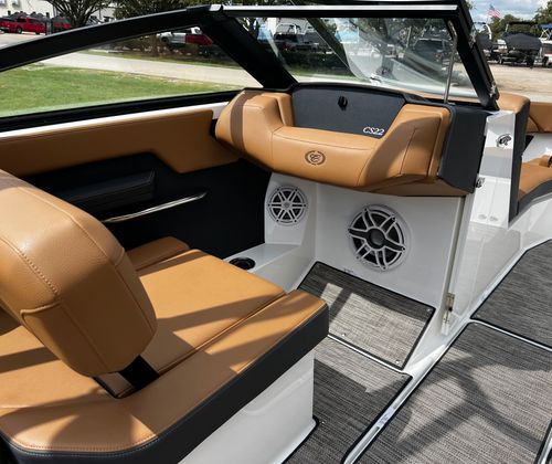 The Cobalt CS22 Bowrider is packed with premium features designed to enhance your boating experience. The exterior boasts a striking Hull Side in White, complemented by an Accent Stripe in Graphite Gray and a Hull Bottom in Rich Ebony, creating a sophisticated and modern look. The Cobalt Letters in Black Satin add a touch of elegance and brand distinction.Step inside to discover the luxurious Caramel/Carbon Interior, offering both comfort and style. The floor is covered with Seagrass in Raw Umber, providing a soft, durable surface that’s perfect for barefoot relaxation. The manual adjustable seat (standard) ensures personalized comfort for the captain, while the Battery Switch with ACR-Dual system offers added convenience and safety.For entertainment, the Premium Sound system with Transom Remote (Fusion) delivers crystal-clear audio, allowing you to set the perfect mood for any outing. Whether you’re hosting a party or enjoying a quiet sunset cruise, the sound system ensures your favorite tunes are always within reach.
