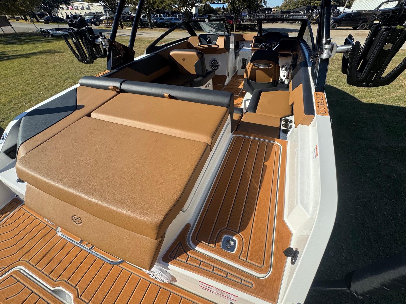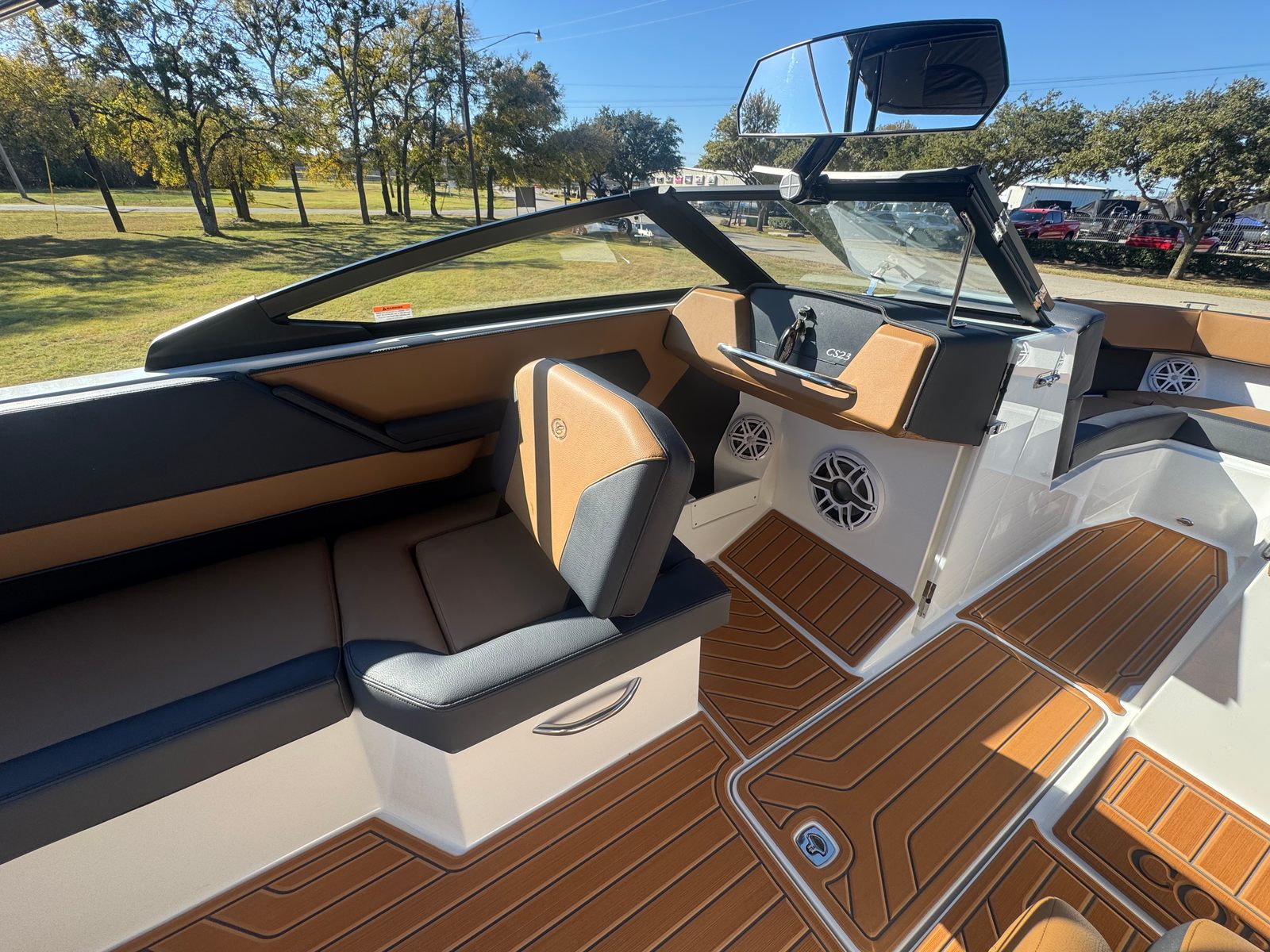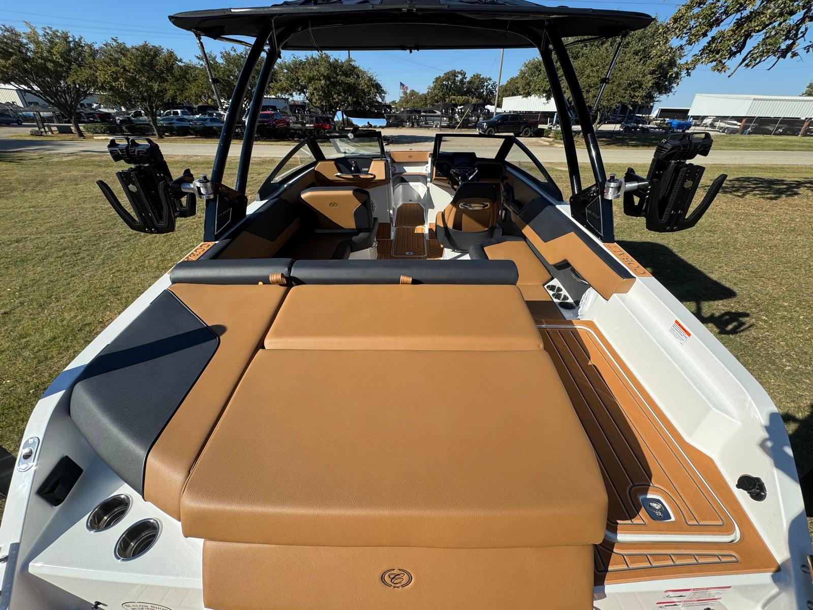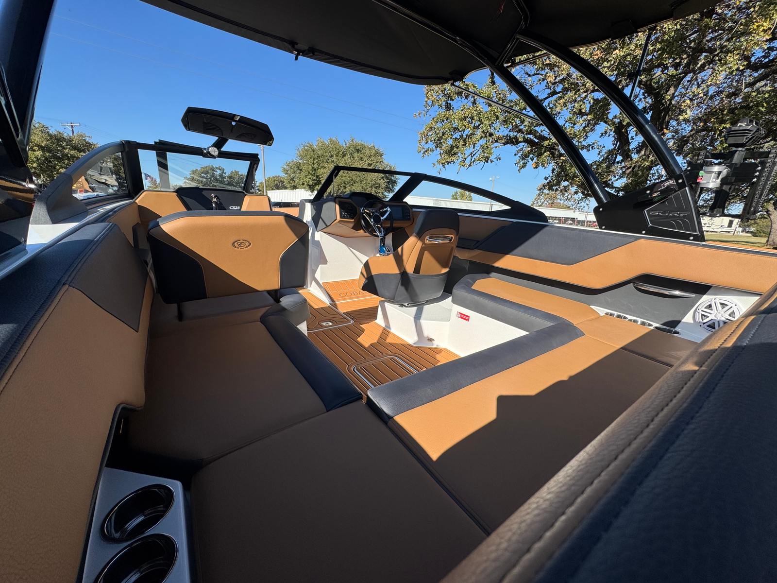 The 2026 Cobalt CS23 Surf is packed with special features that set it apart from other bowrider boats for sale. The aft-facing rumble seat provides a comfortable spot to relax and enjoy the view, whether you are anchored or cruising. An integrated air compressor with holder adds convenience for inflating water toys or adjusting tire pressure on the go. The battery maintainer/charger ensures your boat is always ready for action, while the bow cushion insert offers additional comfort and versatility in the seating area.Step inside and you will be greeted by a luxurious interior finished in Caramel, Carbon, and Ebony, creating a sophisticated and inviting atmosphere. The Cobalt letters in black satin add a touch of elegance and brand distinction. Stainless steel docking lights not only enhance the boat’s appearance but also improve visibility during evening outings. Fender clips with line make it easy to secure your boat at the dock, while the flagpole with flag adds a classic nautical touch.