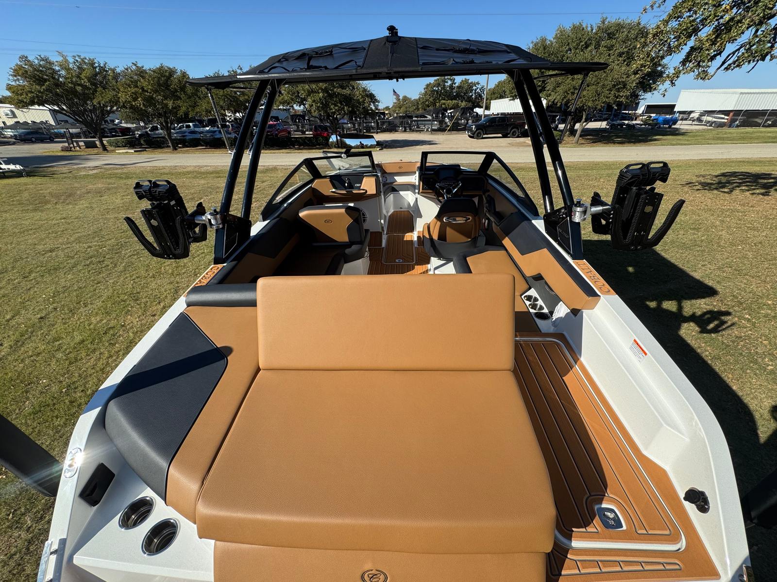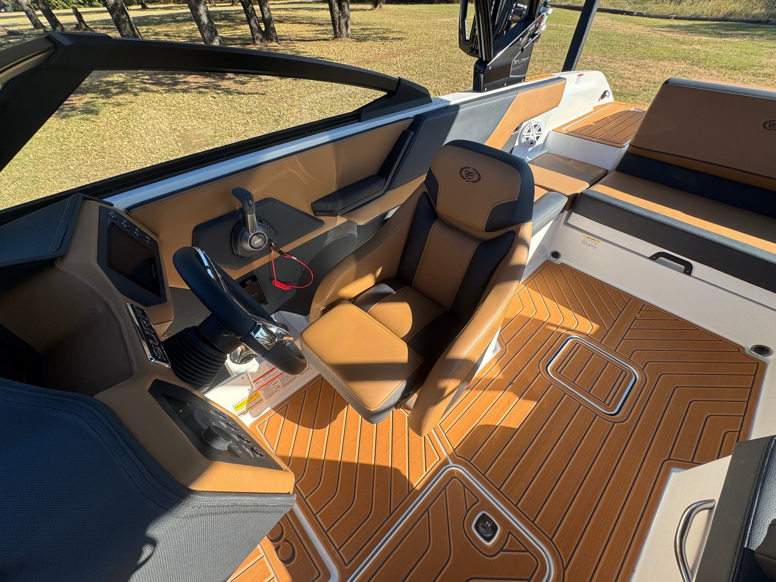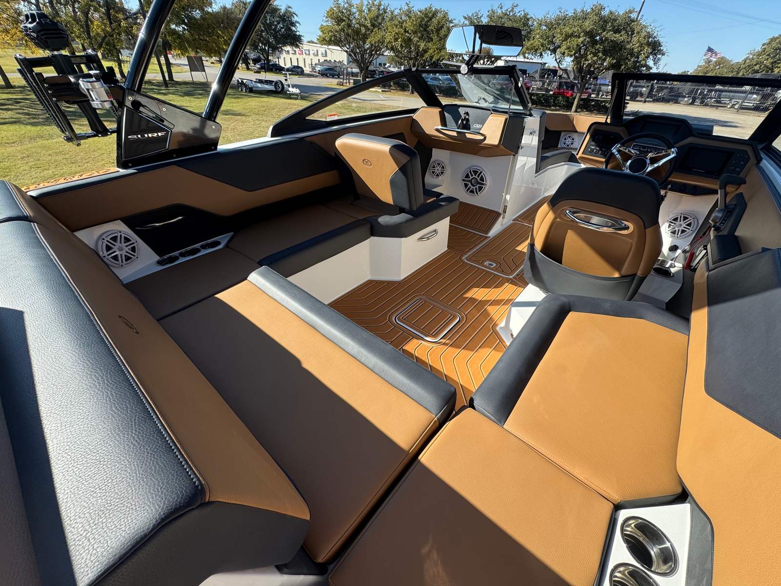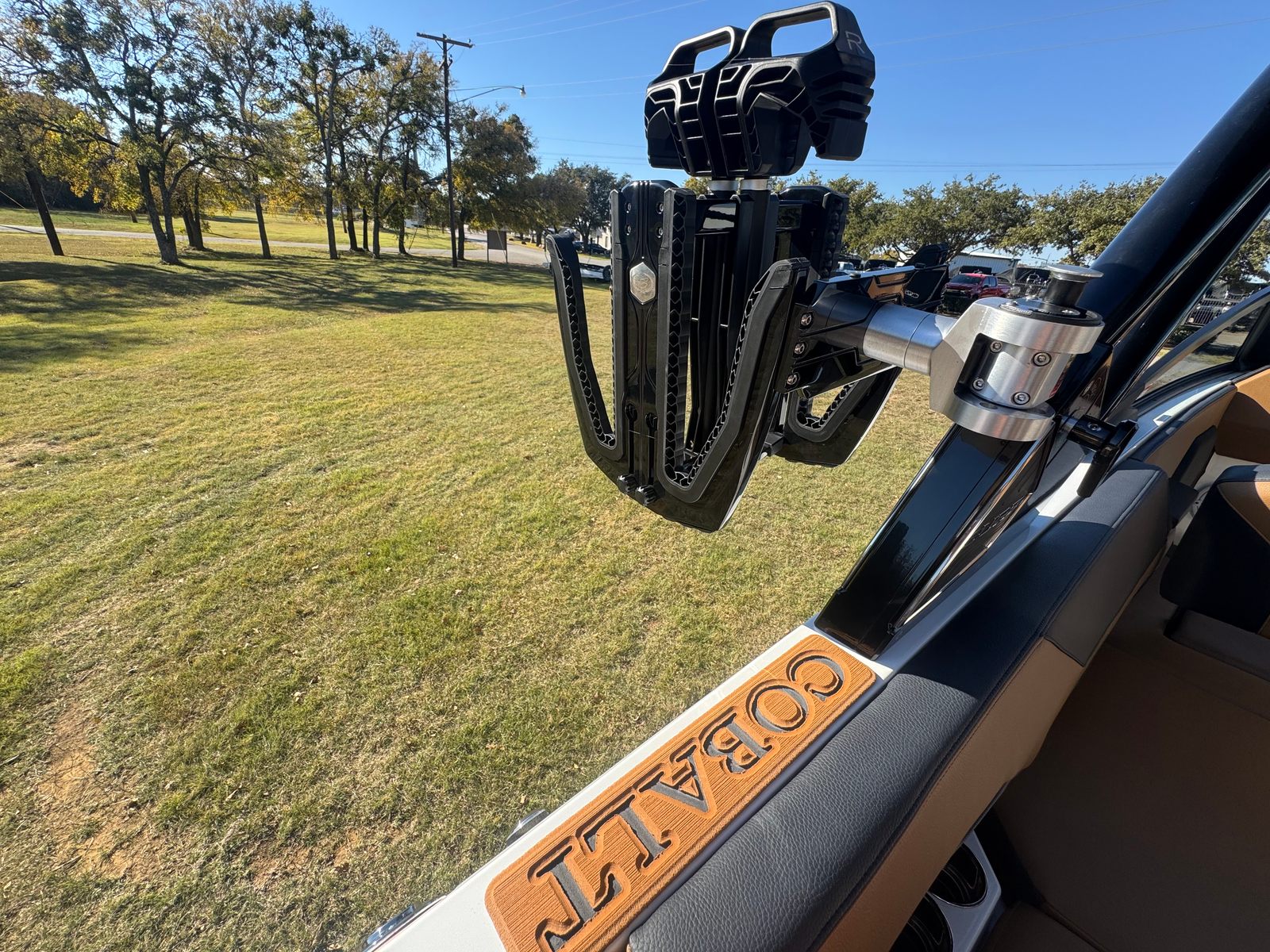 The 2026 Cobalt CS23 Surf is packed with special features that set it apart from other bowrider boats for sale. The aft-facing rumble seat provides a comfortable spot to relax and enjoy the view, whether you are anchored or cruising. An integrated air compressor with holder adds convenience for inflating water toys or adjusting tire pressure on the go. The battery maintainer/charger ensures your boat is always ready for action, while the bow cushion insert offers additional comfort and versatility in the seating area.Step inside and you will be greeted by a luxurious interior finished in Caramel, Carbon, and Ebony, creating a sophisticated and inviting atmosphere. The Cobalt letters in black satin add a touch of elegance and brand distinction. Stainless steel docking lights not only enhance the boat’s appearance but also improve visibility during evening outings. Fender clips with line make it easy to secure your boat at the dock, while the flagpole with flag adds a classic nautical touch.