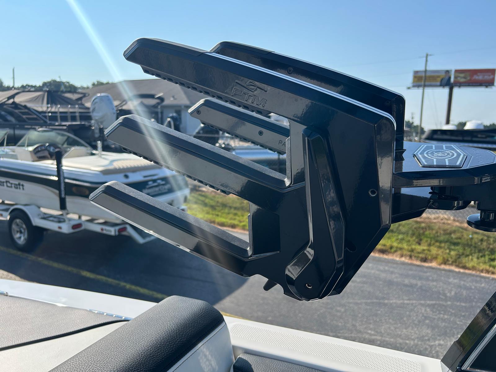 The Cobalt CS23 Surf is packed with special features that enhance comfort, convenience, and style. The aft-facing rumble seat offers a unique vantage point for relaxing or watching the action behind the boat, while the Cobalt letters in black satin add a touch of sophistication to the exterior. Fender clips with line (4) make docking and securing the boat a breeze, ensuring you can focus on enjoying your time on the water.Step aboard and you’ll notice the floor covering in Sea Grass, Silver Ash, which provides a soft, stylish surface underfoot. The hull bottom in rich ebony not only looks stunning but also contributes to the boat’s sleek aesthetic. LED interior accent lighting with R/G/B options creates a vibrant atmosphere for evening cruises or social gatherings, allowing you to set the mood to match any occasion.A mooring cover with arch protects your investment when the boat is not in use, while the rearview mirror, PTM with custom cover, ensures safety and visibility during watersports or busy boating days. The Sof-Trac mat on the swim platform with step, finished in gray/ebony, offers comfort and traction for swimmers and sunbathers alike.
