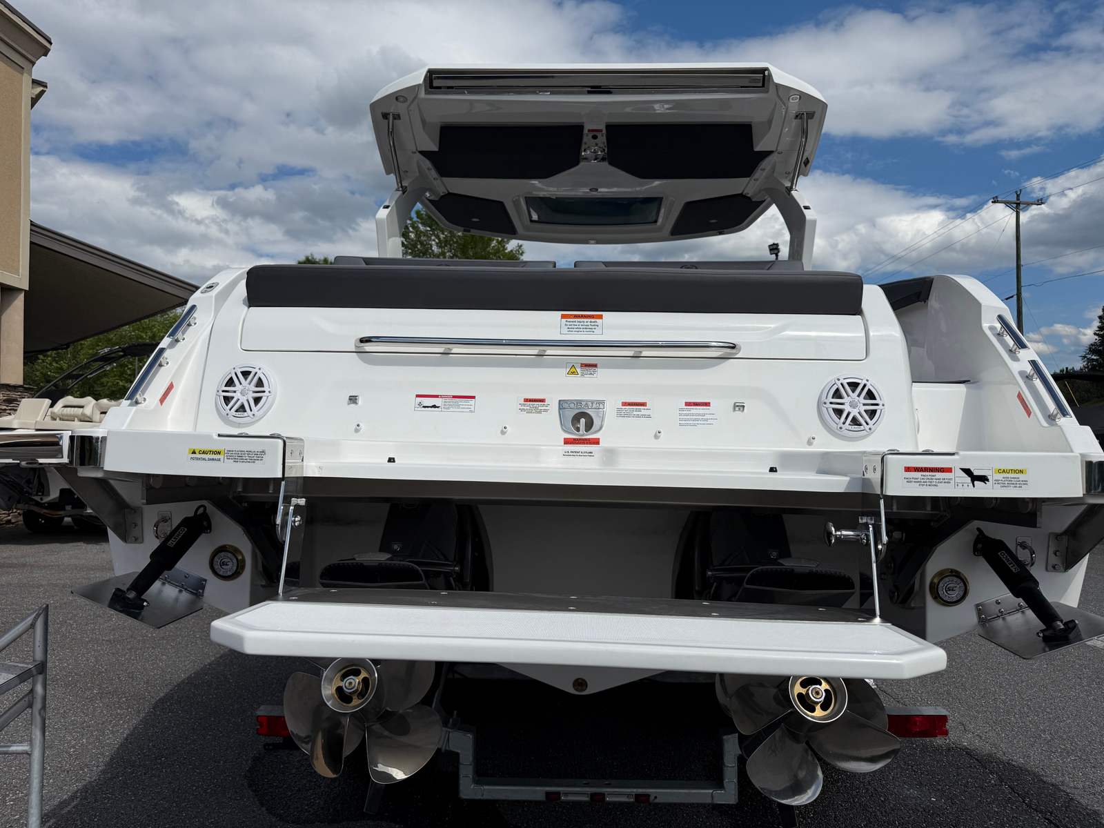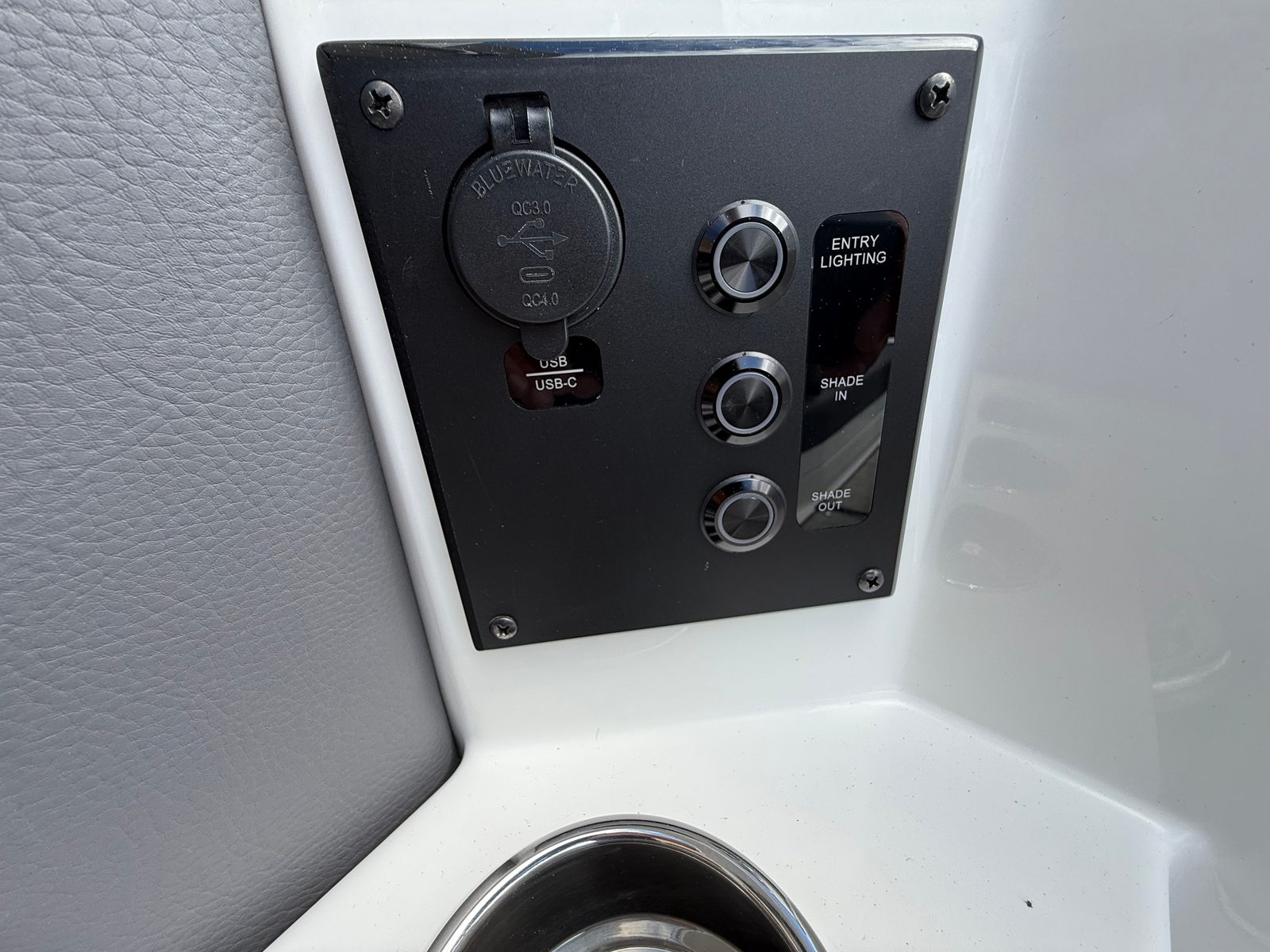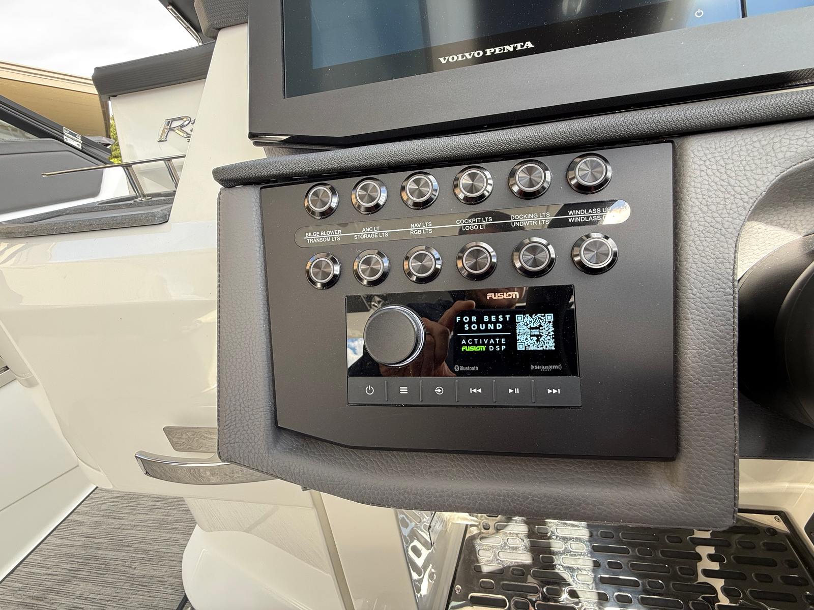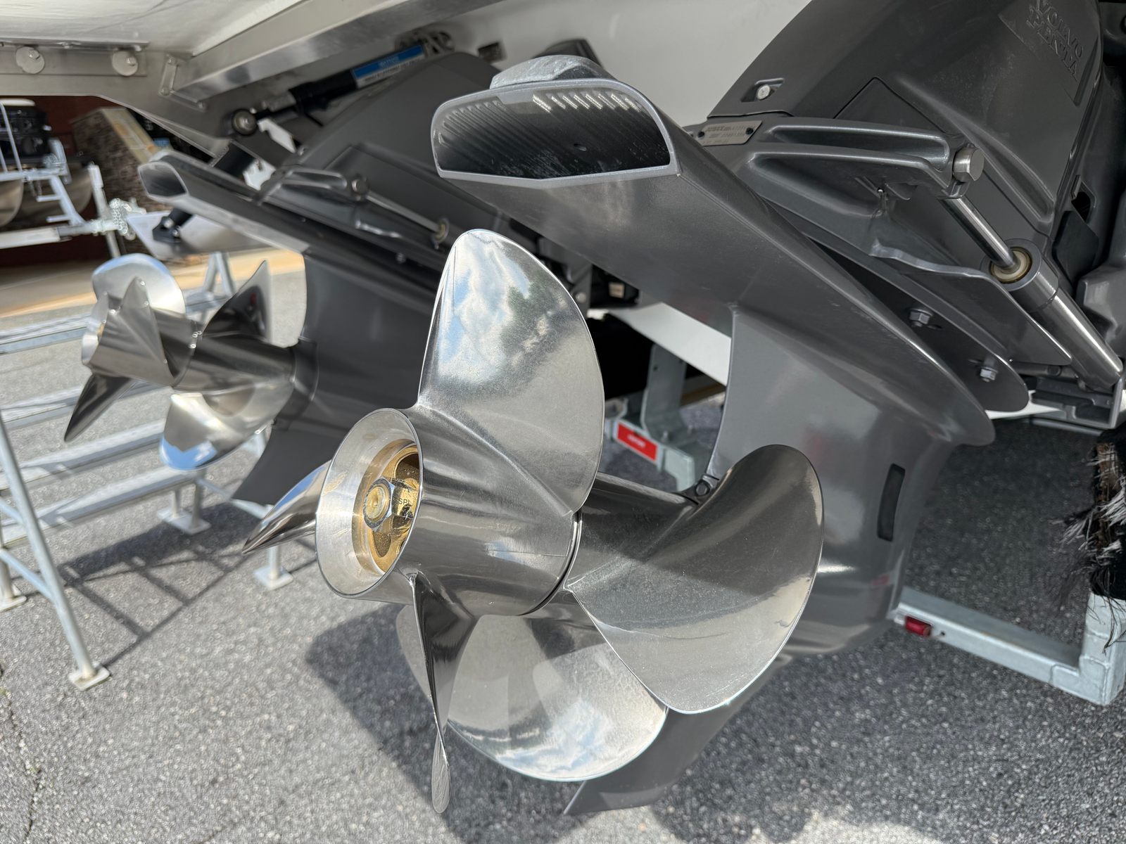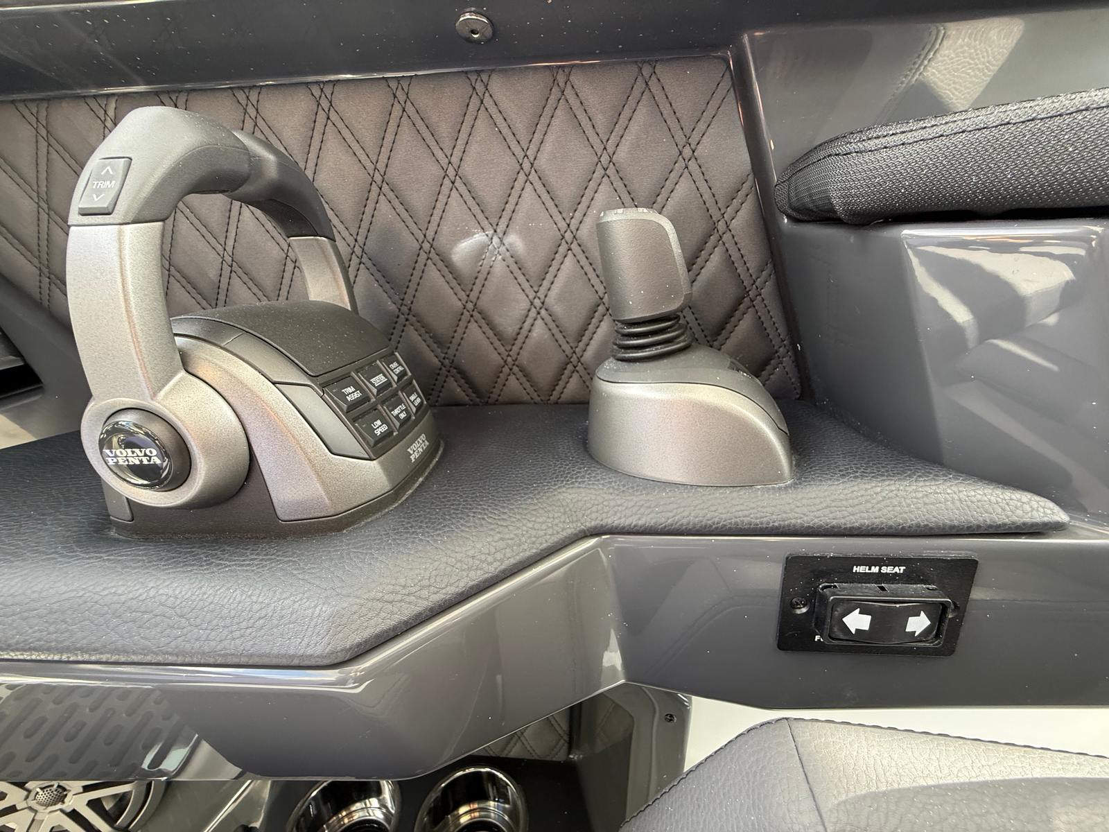 Inside, enjoy thoughtful touches throughout. A luxurious dinette table provides a great space to gather, while the glass cockpit features dual 12" Volvo displays for intuitive navigation. Air conditioning and heat at both the helm and in the head ensure comfort in every season. A hydraulic swim platform with flip-down step makes water access simple, and underwater lights set the mood for evenings on the water.