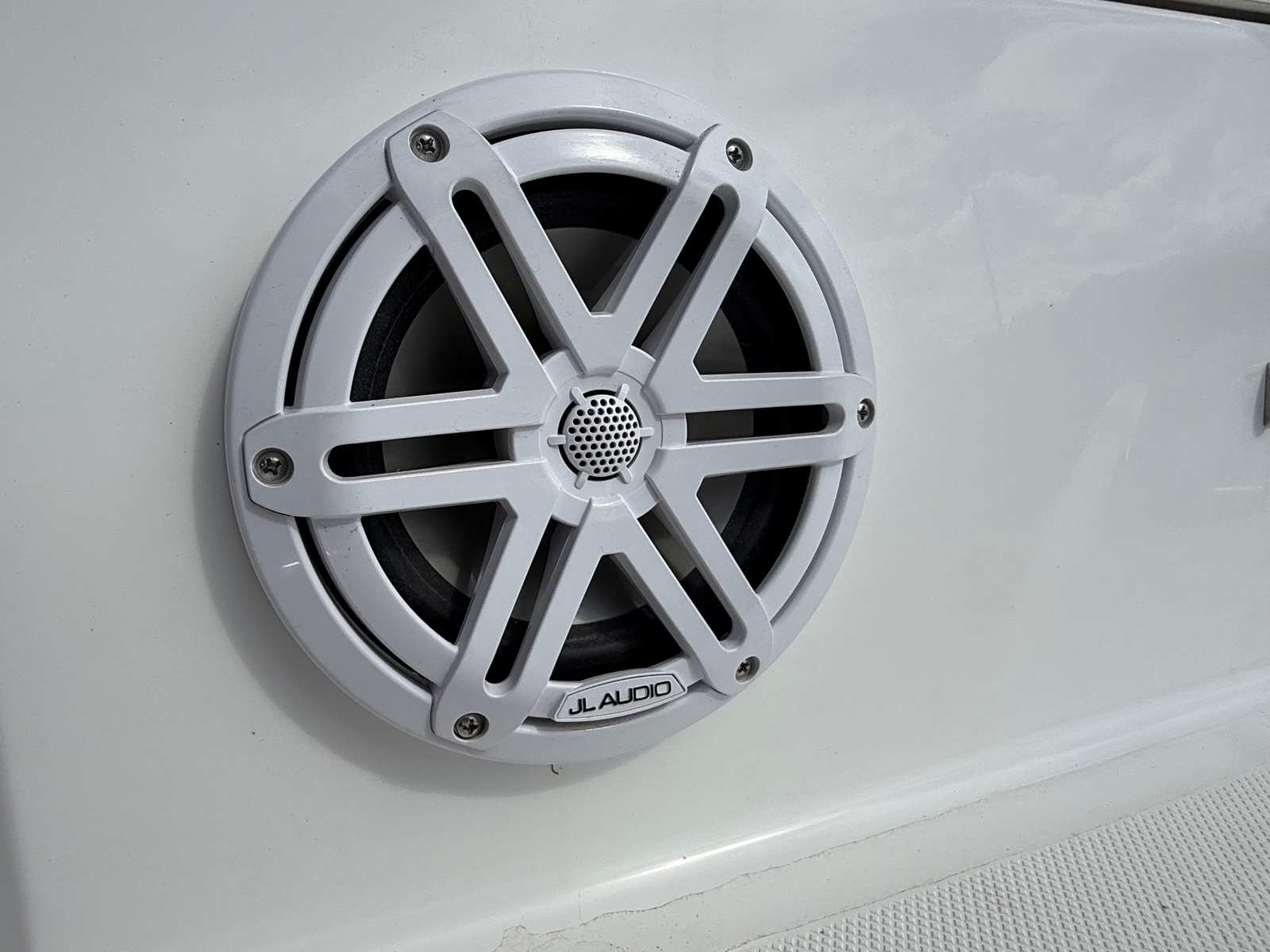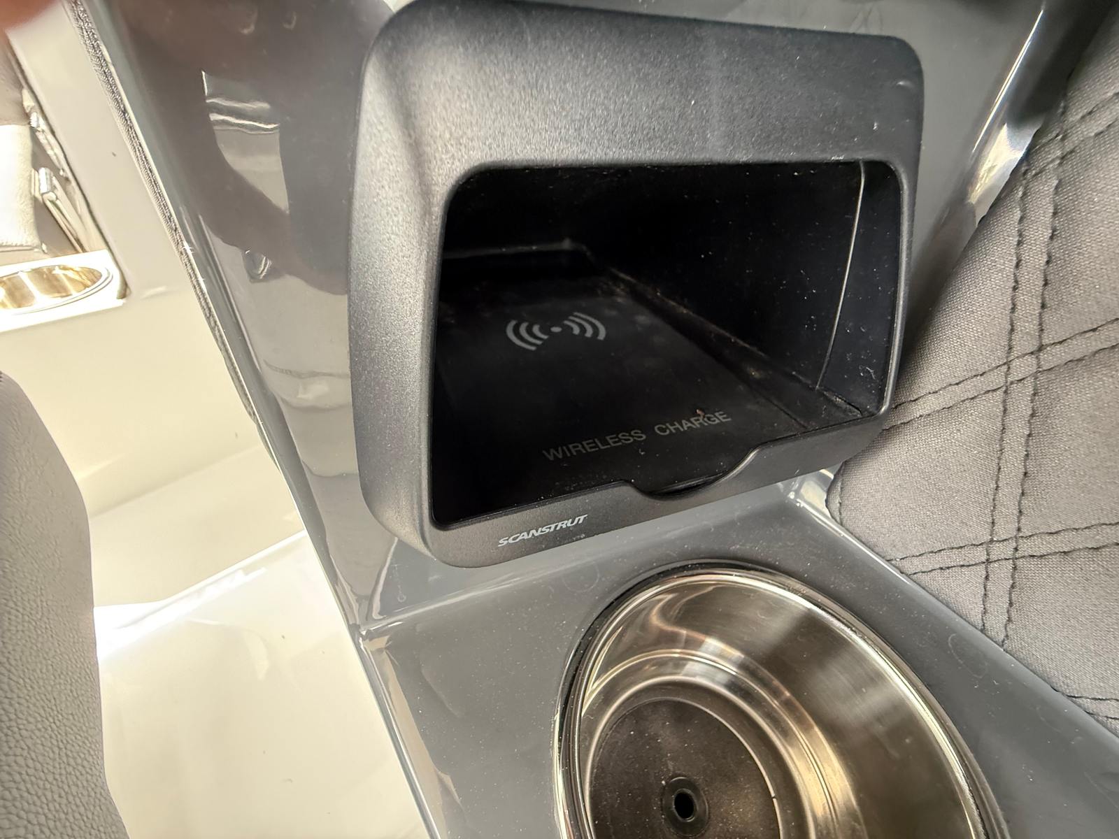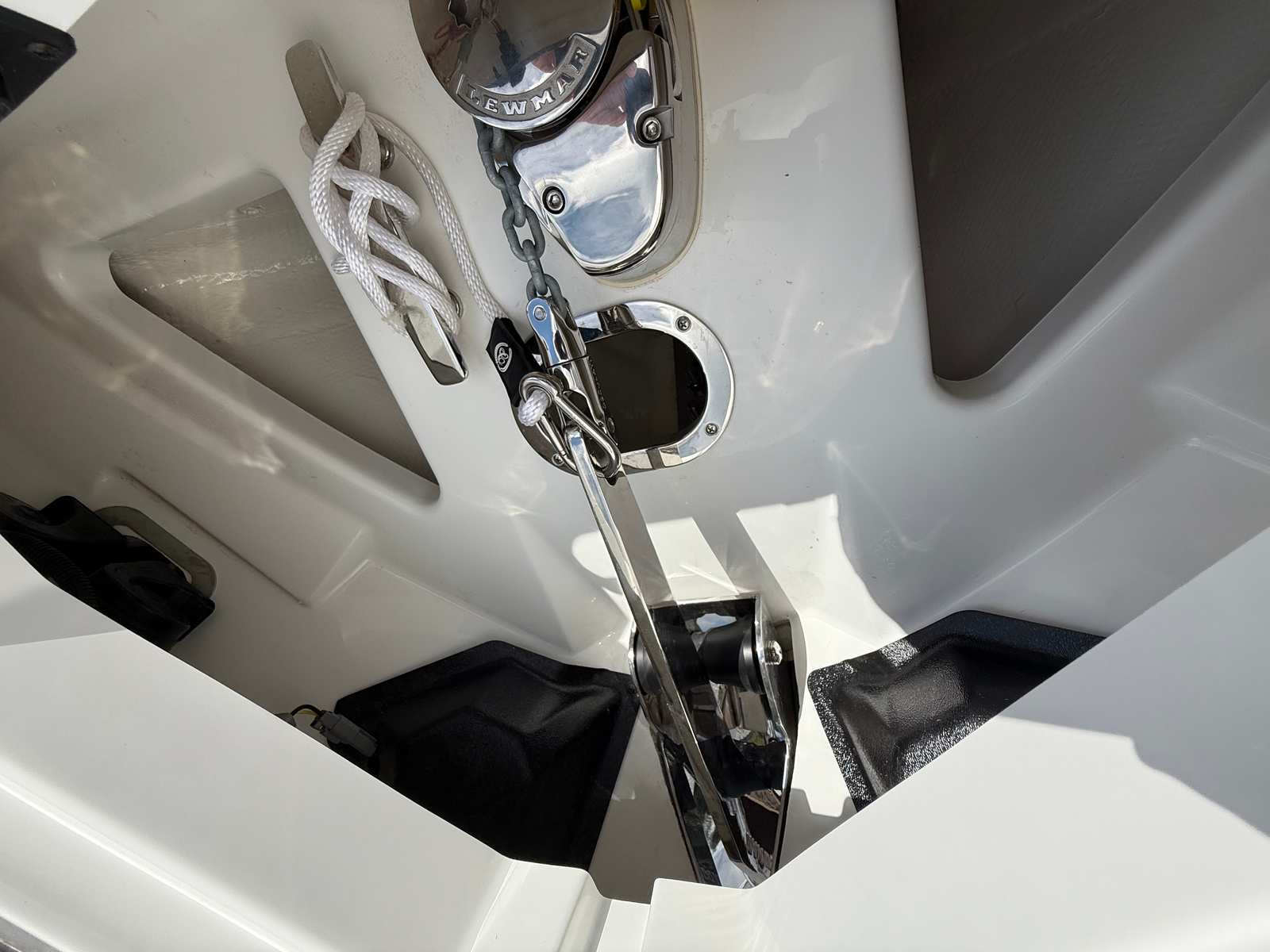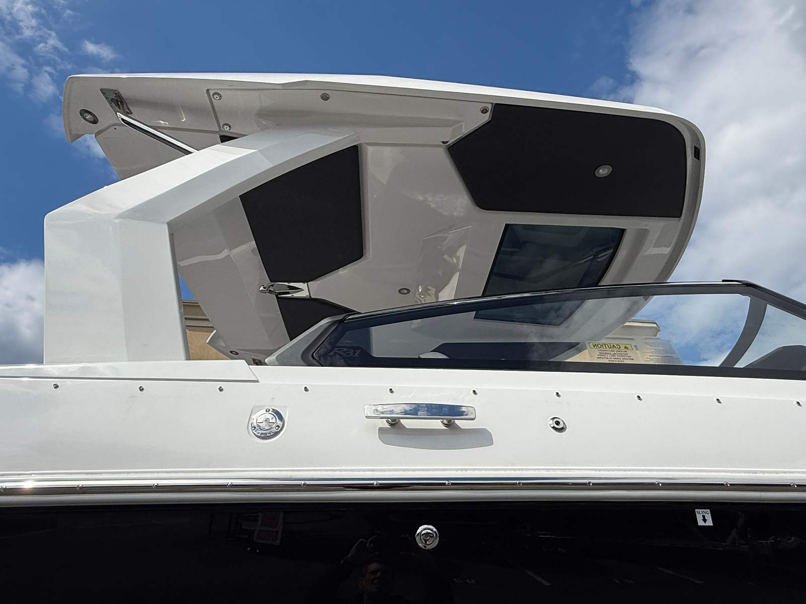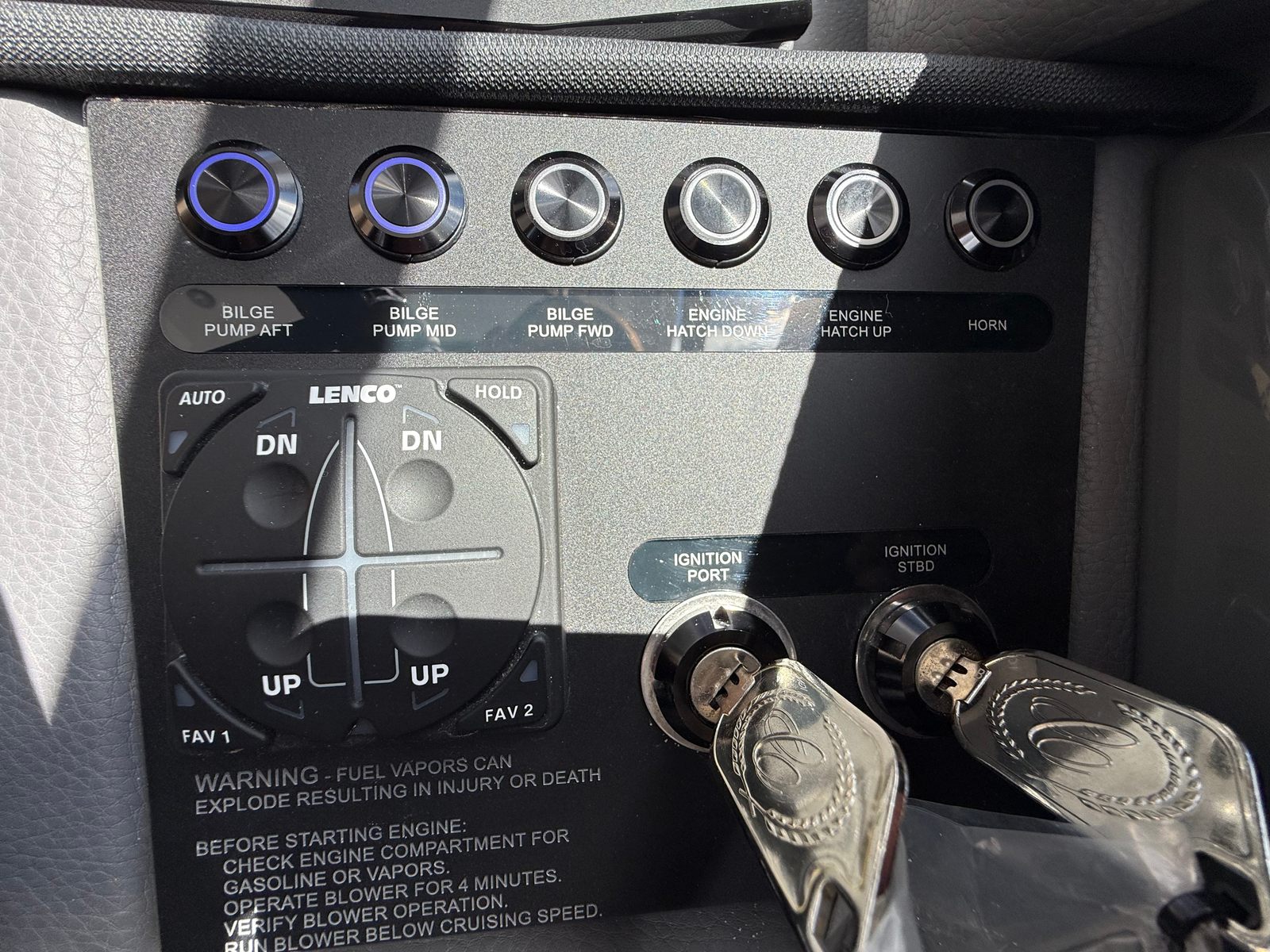 Inside, enjoy thoughtful touches throughout. A luxurious dinette table provides a great space to gather, while the glass cockpit features dual 12" Volvo displays for intuitive navigation. Air conditioning and heat at both the helm and in the head ensure comfort in every season. A hydraulic swim platform with flip-down step makes water access simple, and underwater lights set the mood for evenings on the water.