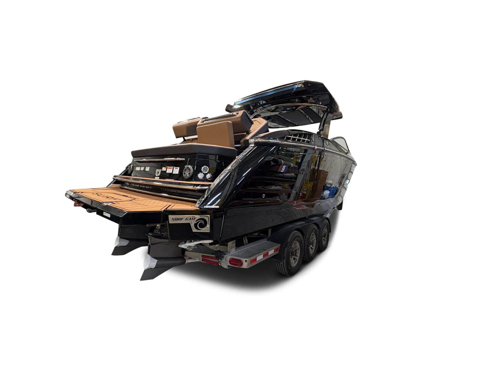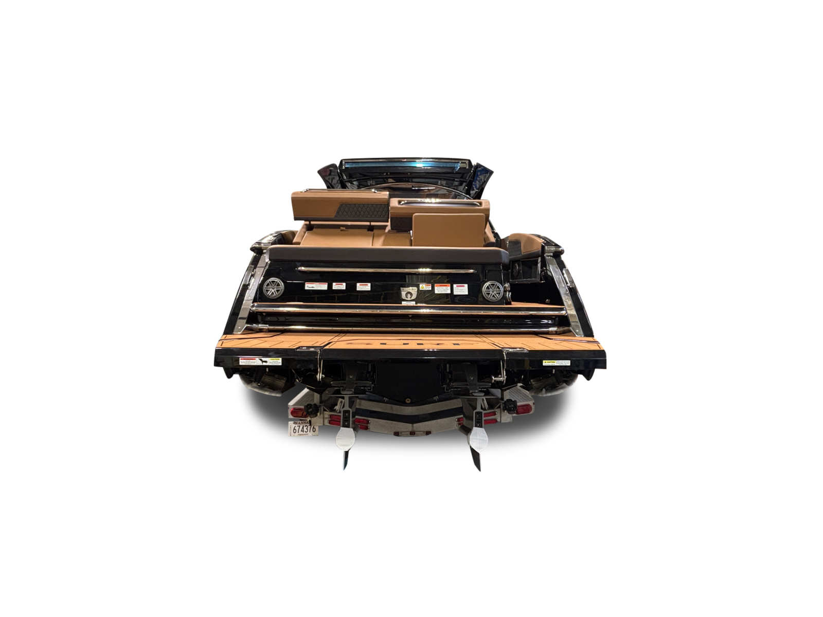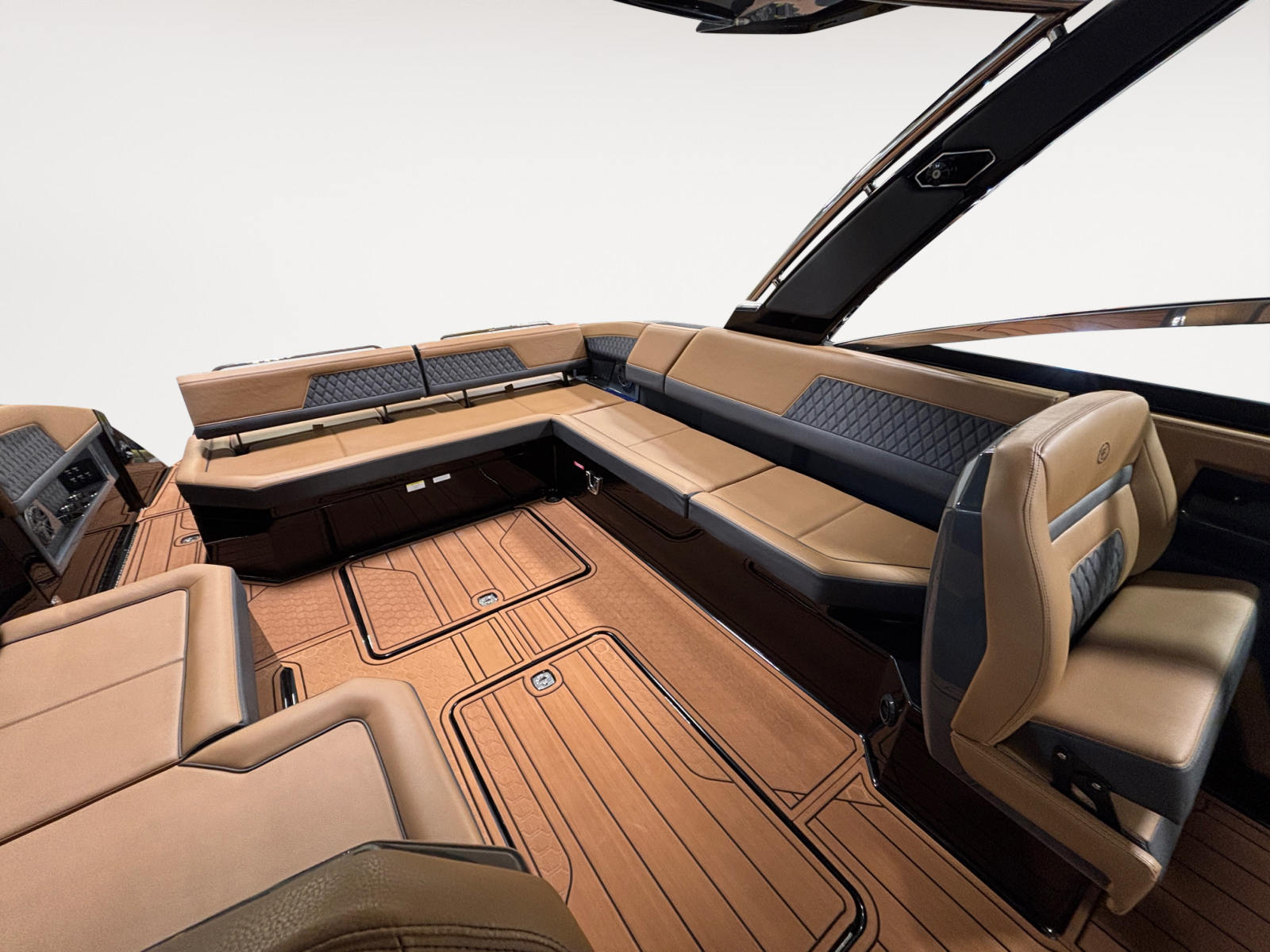 The Cobalt R33 Surf is packed with premium features that elevate your boating experience. The arch with hard top provides both style and functionality, offering shade and protection from the elements while maintaining an open and airy feel. The electric awning in sleek black extends effortlessly, creating a comfortable space for relaxation or entertaining guests. The aft walk-thru gate and boarding door make it easy to access the water or dock, enhancing safety and convenience for everyone on board.Inside, the cockpit showcases a luxurious interior finished in Caramel, Carbon, and Ebony, creating a sophisticated and inviting atmosphere. The Cobalt letters with flag emblem in black satin add a touch of elegance and brand distinction. For those cooler days on the water, the cockpit heater ensures that everyone stays warm and comfortable, extending your boating season well into the cooler months.Additional features such as the battery maintainer/charger (110V) keep your boat ready for action, while the board rack covers and PTM provide practical solutions for storing and protecting your gear. Every detail of the R33 Surf is designed with the owner’s comfort and convenience in mind.
