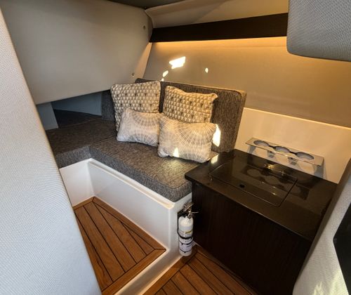 The Cobalt R33 Surf is designed with practicality in mind, offering solutions that make ownership both enjoyable and convenient. The spacious layout provides ample storage for gear, water toys, and personal items, keeping the deck clutter-free and organized. The easy-access boarding door simplifies docking and boarding, while the dual engines offer reliable power and maneuverability for navigating marinas and tight spaces.Fuel efficiency is a hallmark of Cobalt engineering, ensuring that you can spend more time enjoying the water and less time refueling. The battery maintainer/charger supports hassle-free maintenance, so you’re always ready for your next outing. The dinette table with multiple receptacles transforms the cockpit and bow into versatile spaces for dining, games, or socializing, adapting to your needs throughout the day.
