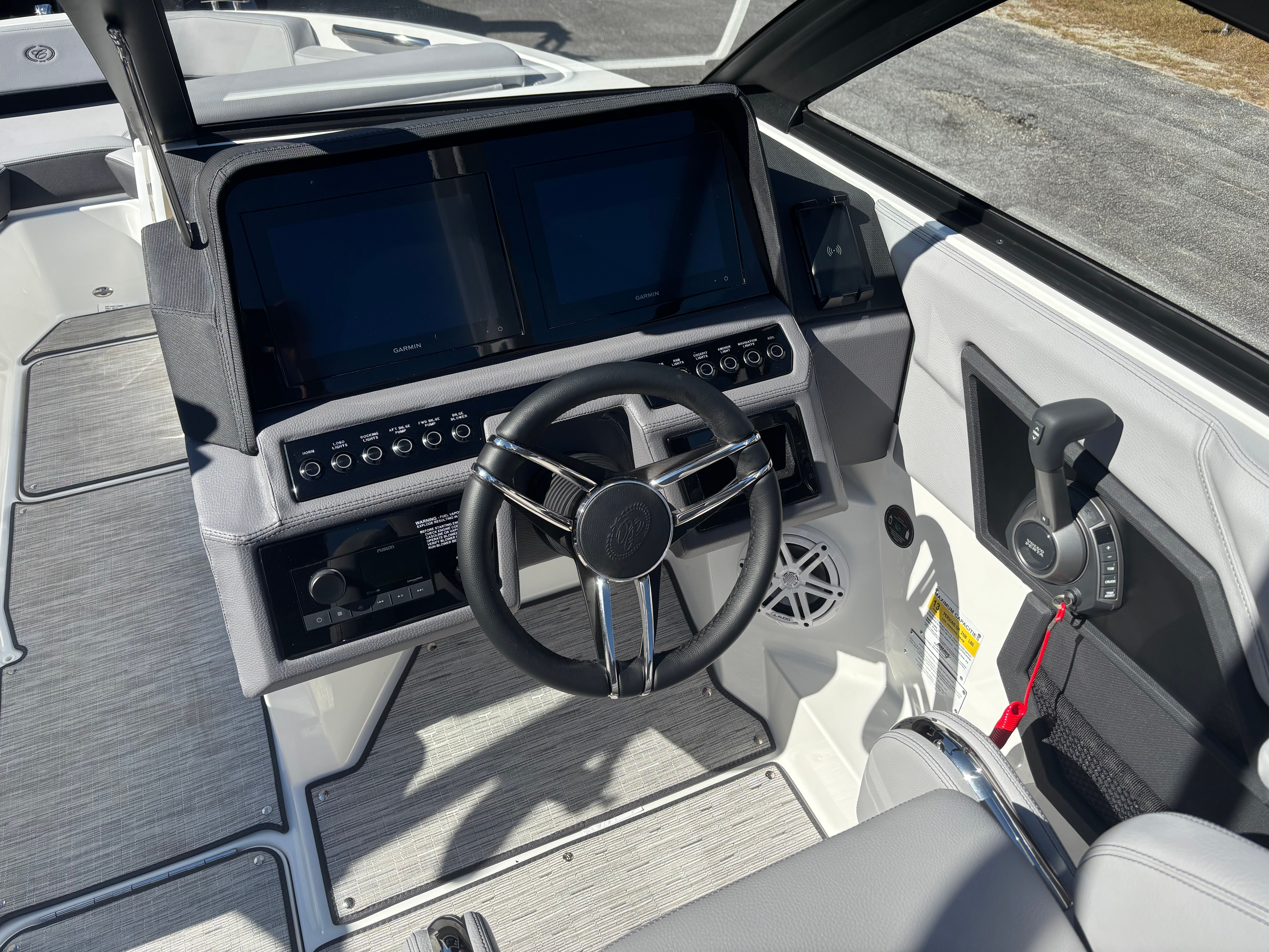 The Cobalt R4 Surf is packed with premium features designed to maximize your enjoyment and convenience on the water. The Battery Switch With ACR-Dual offers reliable power management, while the Battery Maintainer/Charger (110V) ensures your boat is always ready for action. The interior is finished in Frost, Slate, and Ebony, creating a sophisticated and inviting atmosphere for all passengers.For music lovers, the Premium Sound With Transom Speakers & Remote delivers crystal-clear audio throughout the boat, allowing you to set the perfect soundtrack for your day. Fender Clips With Line (4) make docking and securing your boat effortless, while the Aft Facing Rumble Seat provides a comfortable spot to relax and take in the views. Wakeboard Racks and the PTM Clampforce 3.0 - White offer secure storage for your gear, making this bowrider boat for sale a top choice for water sports enthusiasts.Additional features include a Rearview Mirror for enhanced safety and visibility, and a PTM With Custom Cover to protect your equipment. Every detail of the Cobalt R4 Surf is crafted to elevate your boating experience, combining luxury, functionality, and style.