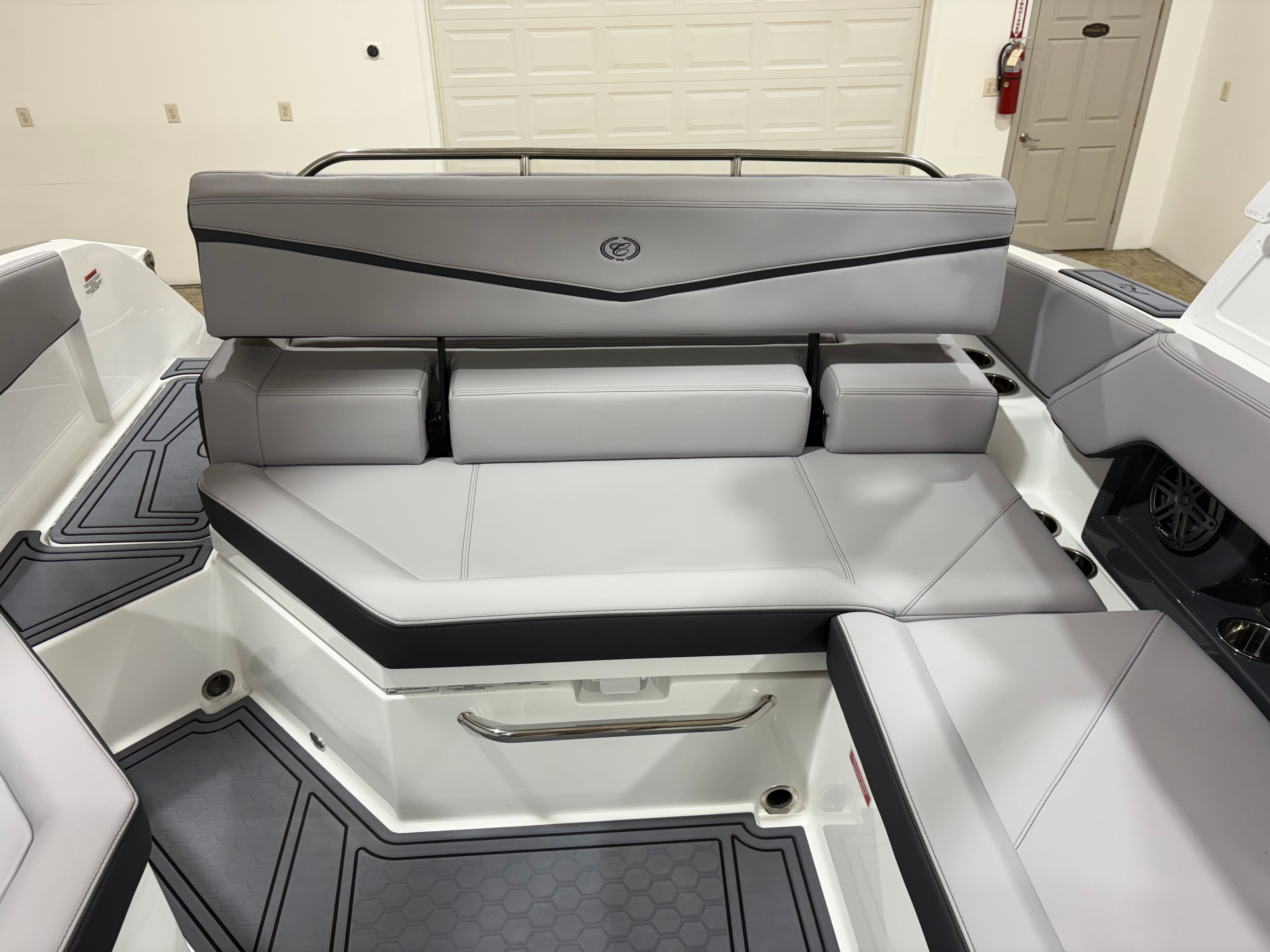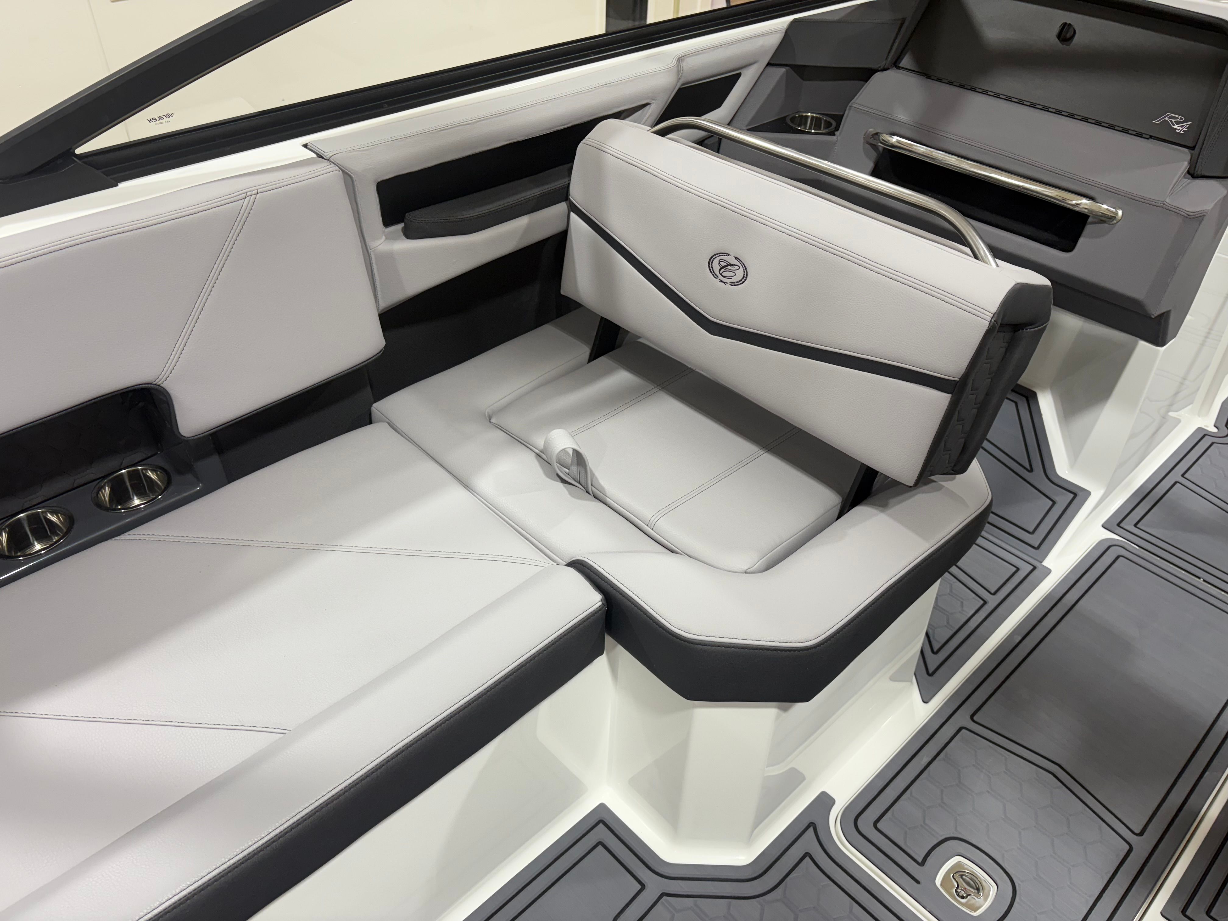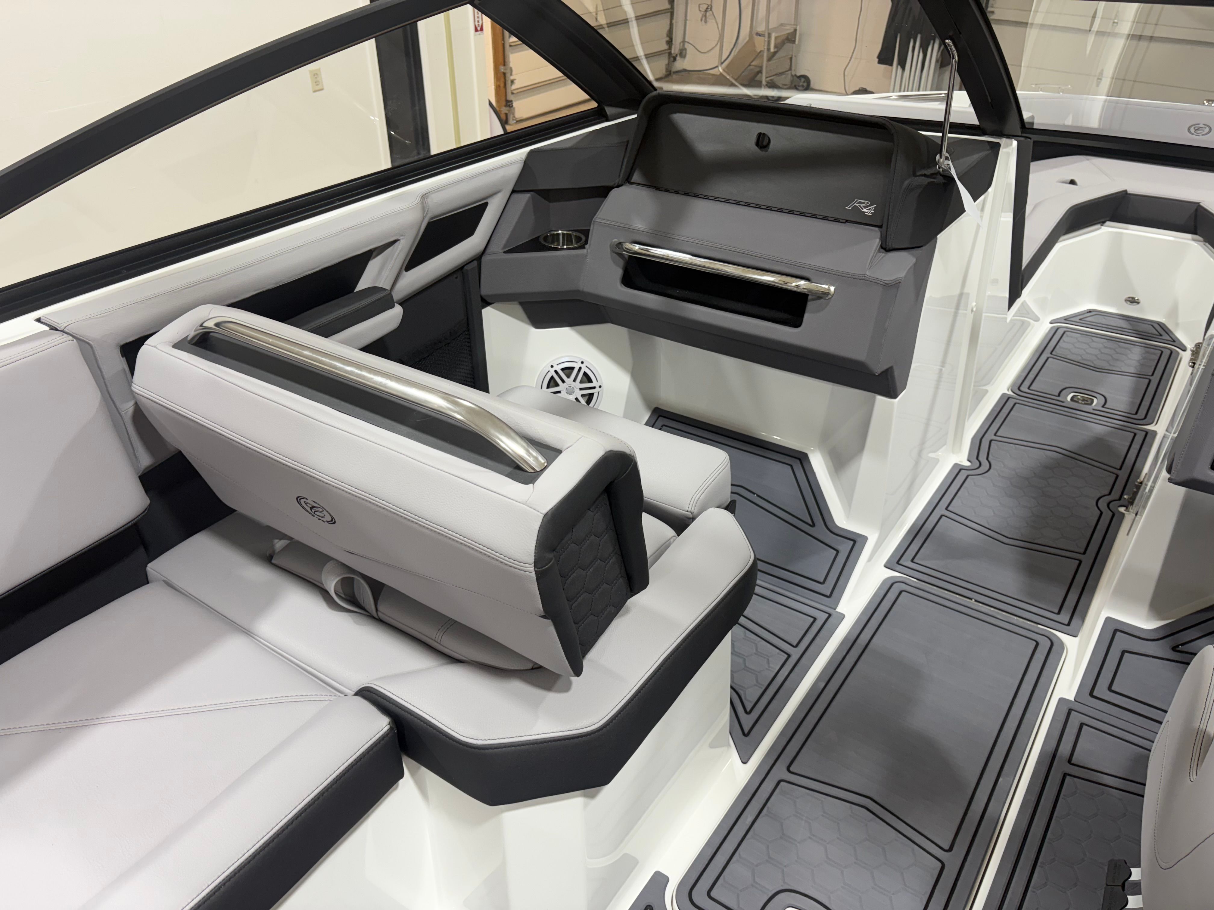 The Cobalt R4 Surf is as practical as it is fun. Its 24.25-foot length strikes the perfect balance between spaciousness and maneuverability, making it easy to handle in a variety of conditions. The stainless steel docking lights and fender clips simplify the docking process, whether you are pulling into a busy marina or anchoring at a secluded cove. The mooring cover with E2 folding arch offers peace of mind, protecting your boat from the elements and reducing maintenance time. The forward drive system not only enhances performance but also improves fuel efficiency, allowing you to spend more time on the water and less time at the pump. With ample storage throughout the boat, you can bring along everything you need for a day of fun, from water sports equipment to picnic supplies.