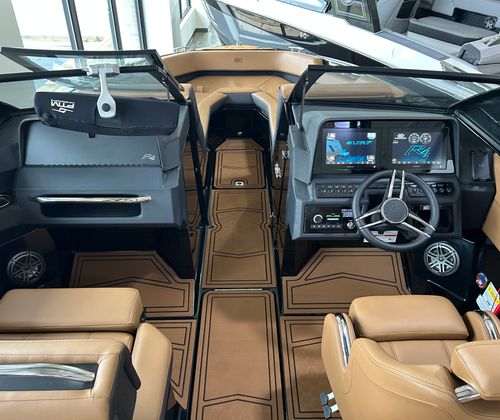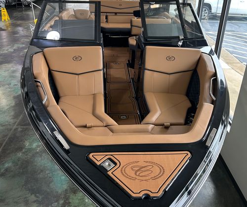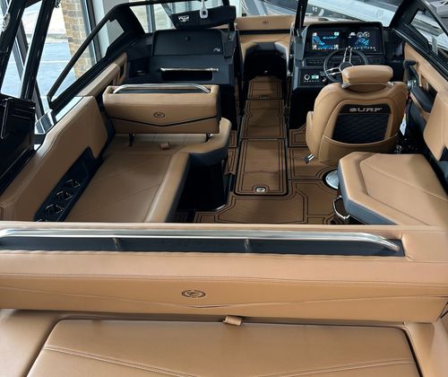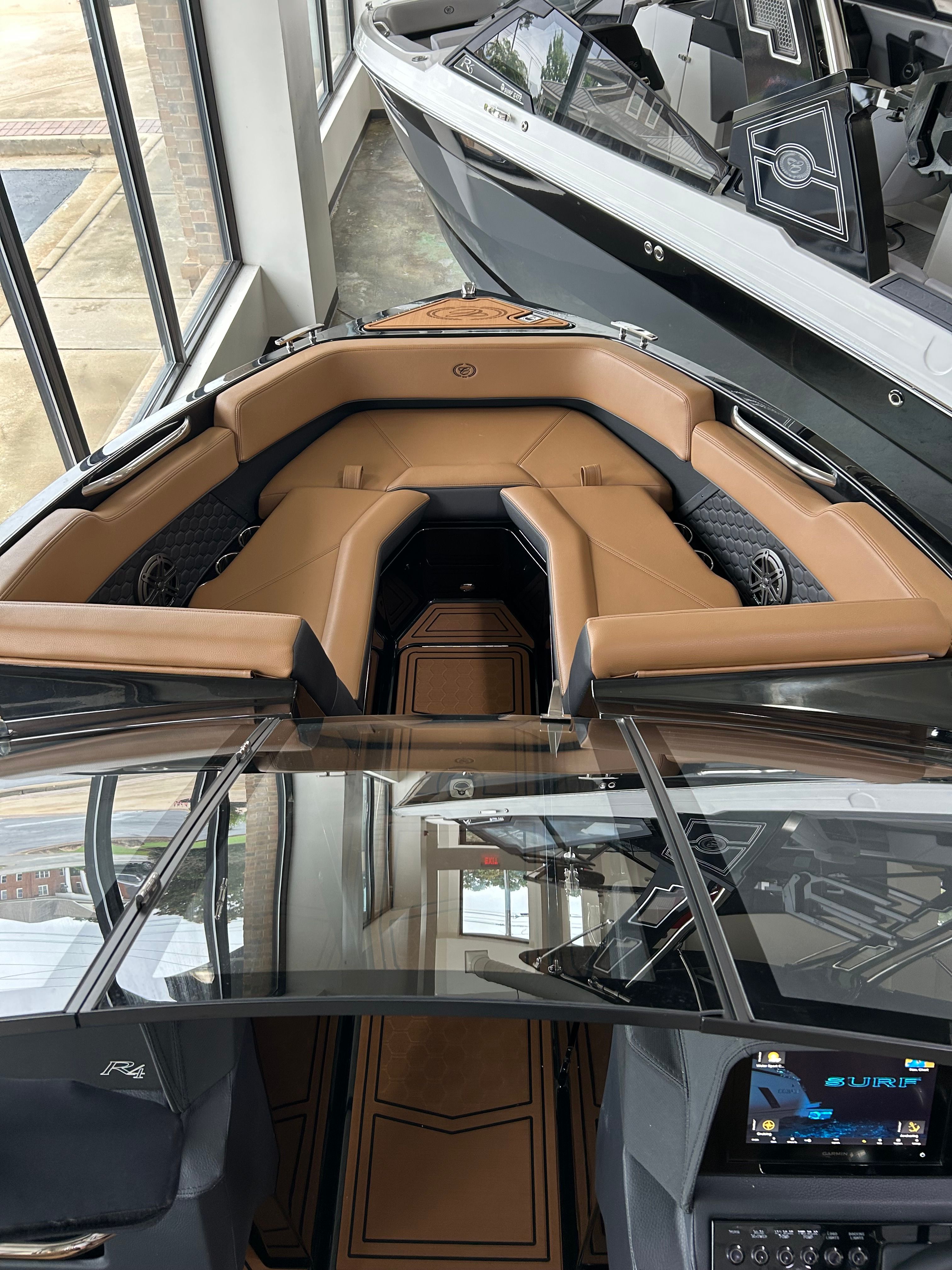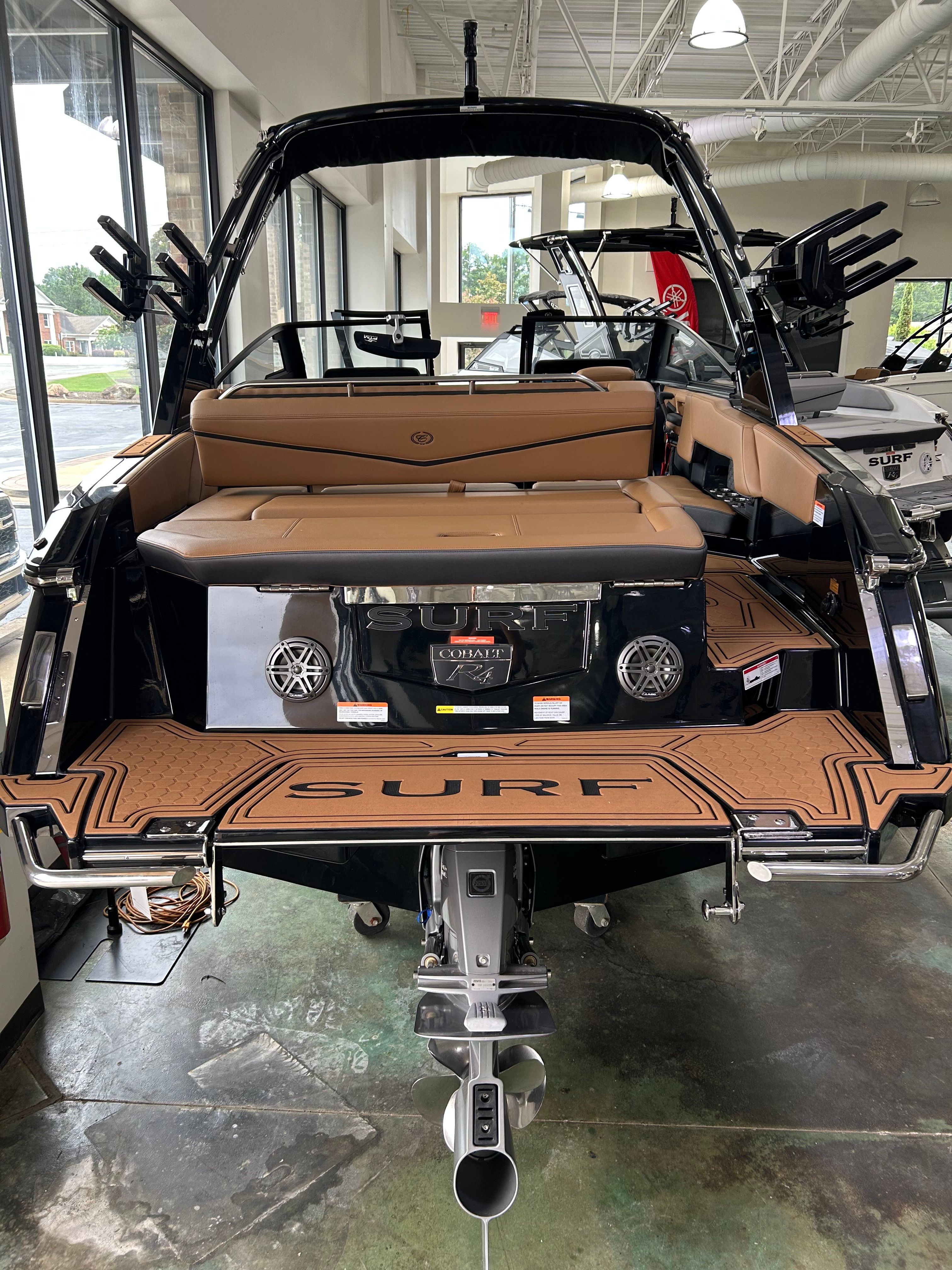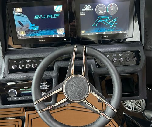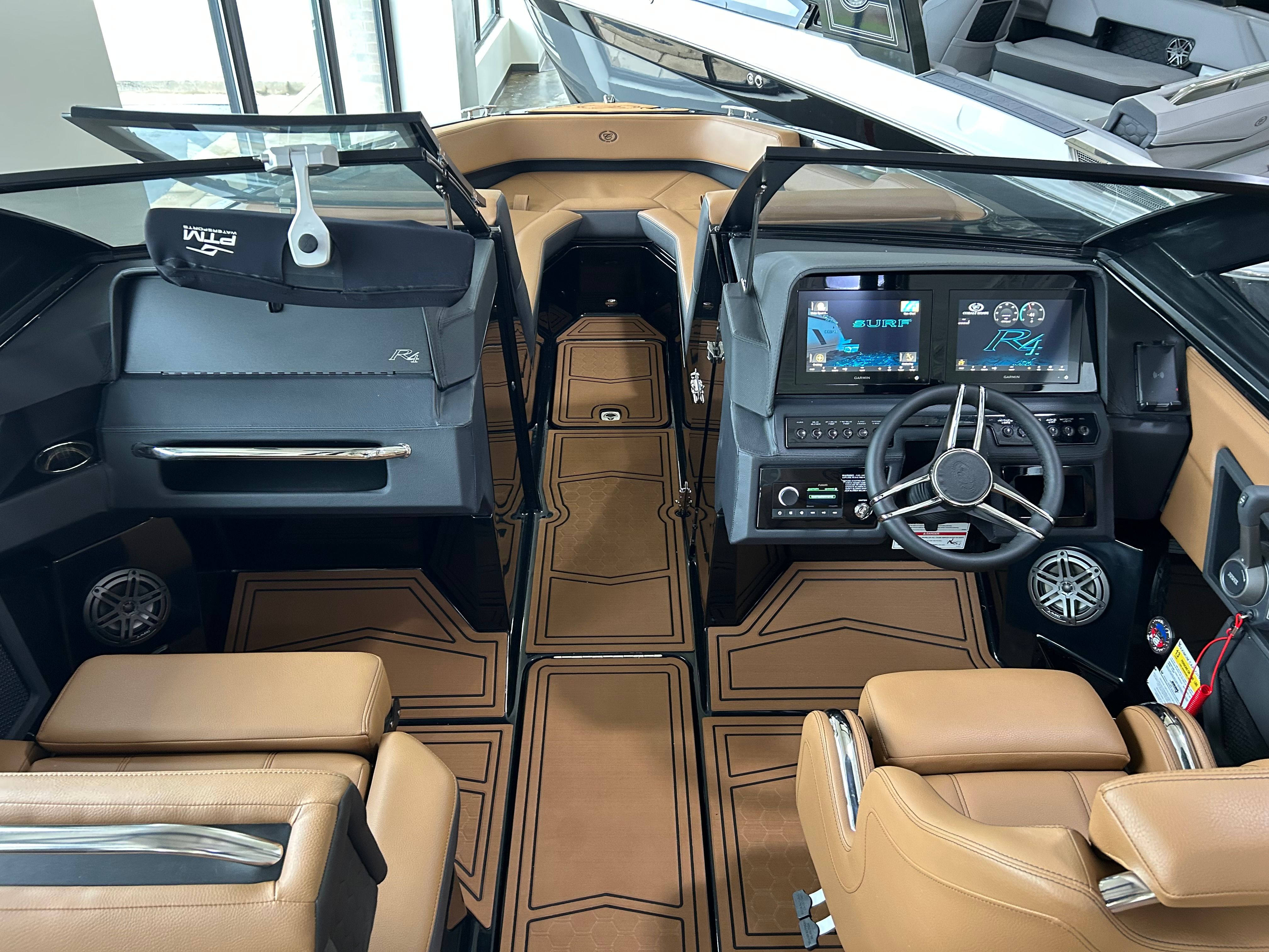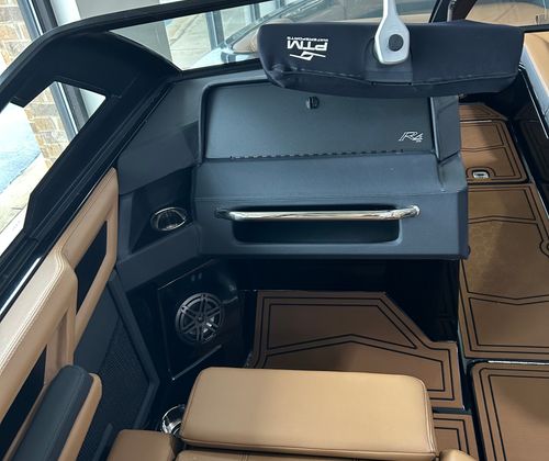 The 2025 Cobalt R4 Surf is packed with special features that elevate both comfort and style. The Sof-Trac Mat at the helm footrest in Caramel/Ebony provides a plush, non-slip surface for added safety and luxury. The Standard Surf Logo proudly displays the boat’s sporty pedigree, while the Accent Stripe in Rich Ebony adds a touch of sophistication to the exterior. LED interior accent lighting with R/G/B options creates a customizable ambiance for evening cruises or lively gatherings.A mooring cover with E2 folding arch ensures your investment is protected when not in use, while the black rubrail and Cobalt letters in black satin contribute to the boat’s modern, upscale appearance. The Sof-Trac Mat at the gunwale step in Caramel/Ebony enhances boarding comfort and safety. The PTM rearview mirror with a custom cover offers improved visibility for watersports and docking, rounding out a suite of features designed for convenience and enjoyment.