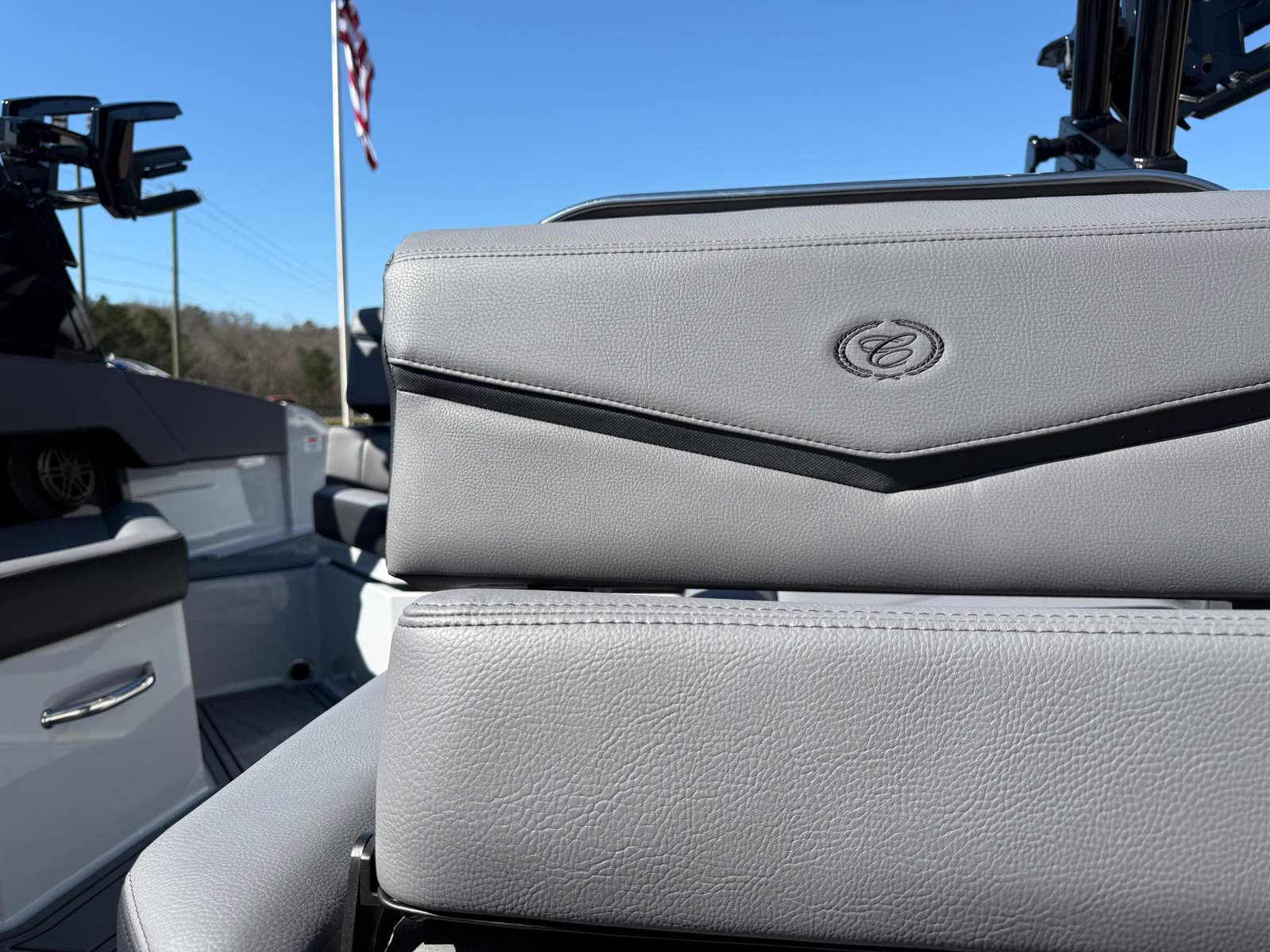 The Cobalt R4 Surf is loaded with special features that set it apart from other bowrider boats for sale. The aft-facing rumble seat provides a comfortable spot to relax and take in the views, while the rear-facing camera enhances safety and convenience when maneuvering or docking. The battery maintainer/charger (110V) ensures your boat is always ready to go, and the fender clips with line (4) make securing your vessel at the dock quick and easy. The flagpole with flag adds a classic touch, showcasing your pride on the water. The glass cockpit, featuring dual Volvo 8610 displays, offers intuitive control and monitoring of all boat systems, while the Frost Gray full-colored deck and hull bottom deliver a cohesive and stylish appearance.