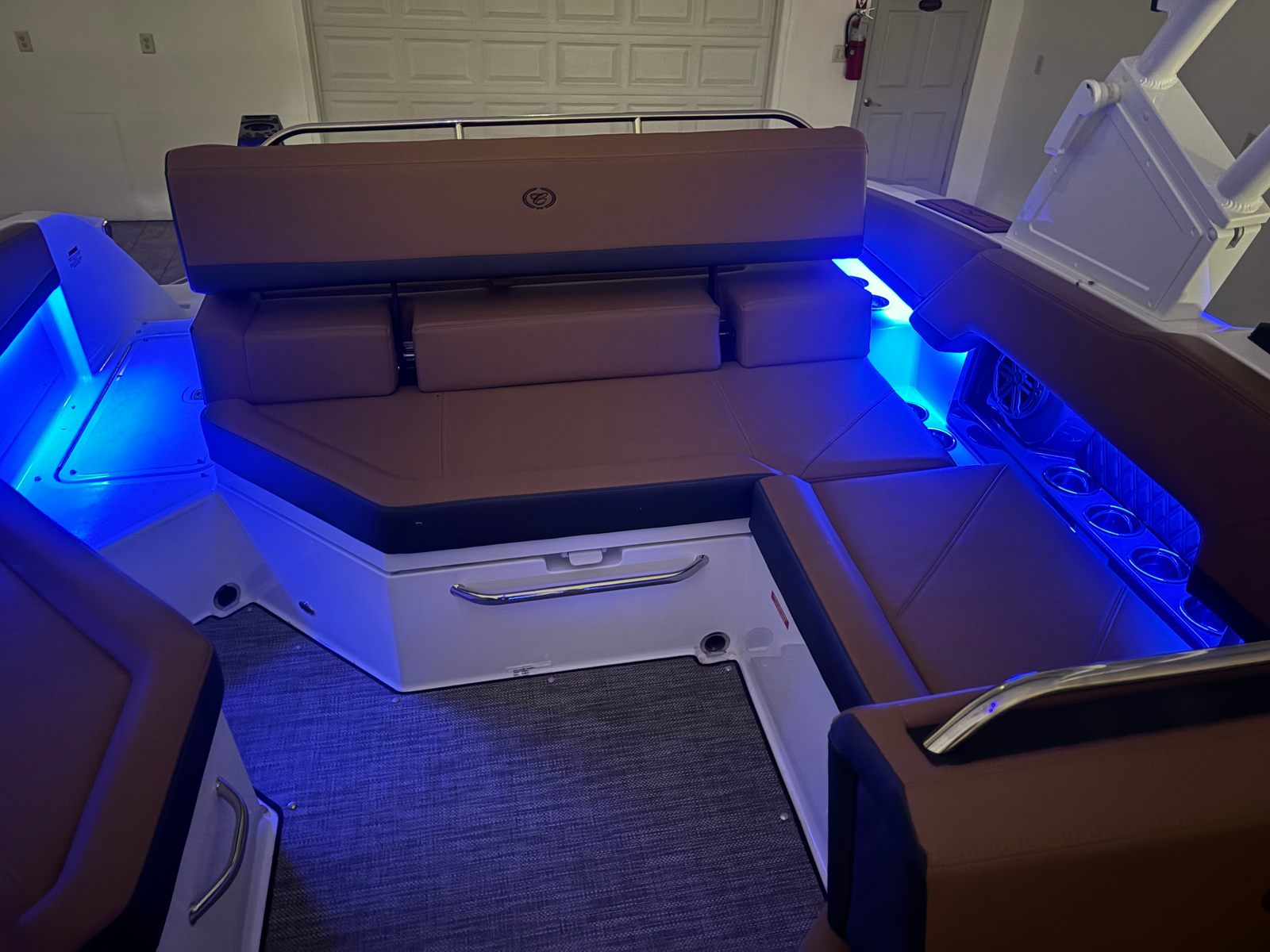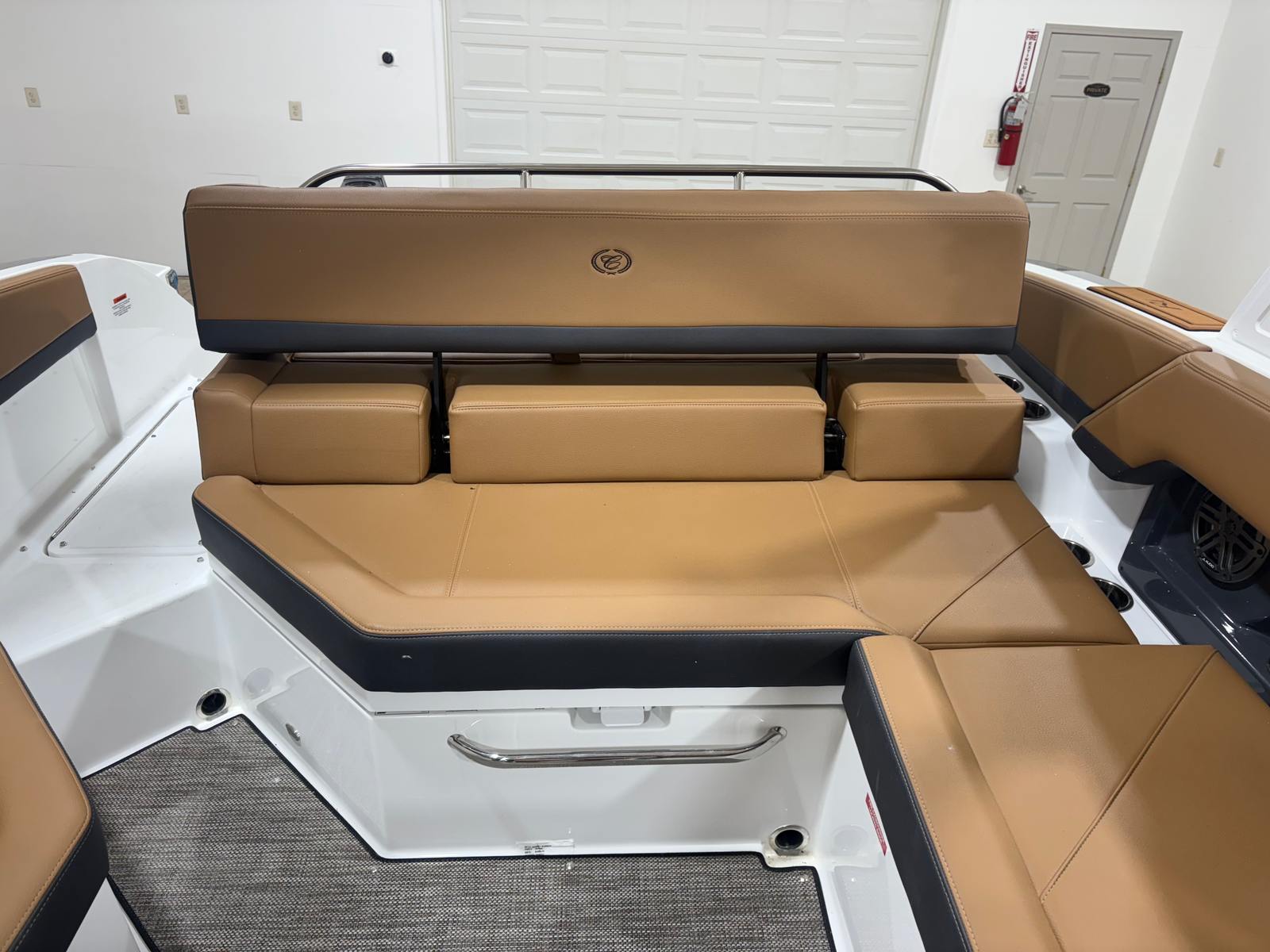 The Cobalt R4 is packed with special features designed to elevate your boating experience. The folding Arch, E2 - White with Captain/Navy Bimini, provides shade and style, while the aft-facing rumble seat offers a unique spot to relax and enjoy the view. The glass cockpit, equipped with dual Garmin 8610 displays, puts advanced navigation and system controls at your fingertips, ensuring you are always in command. Stainless steel docking lights enhance visibility during evening returns, and the four fender clips with lines make docking and securing your boat a breeze. The floor covering in Seagrass, Raw Umber, adds a touch of elegance and comfort underfoot, while the overall fit and finish reflect Cobalt’s commitment to quality and craftsmanship.