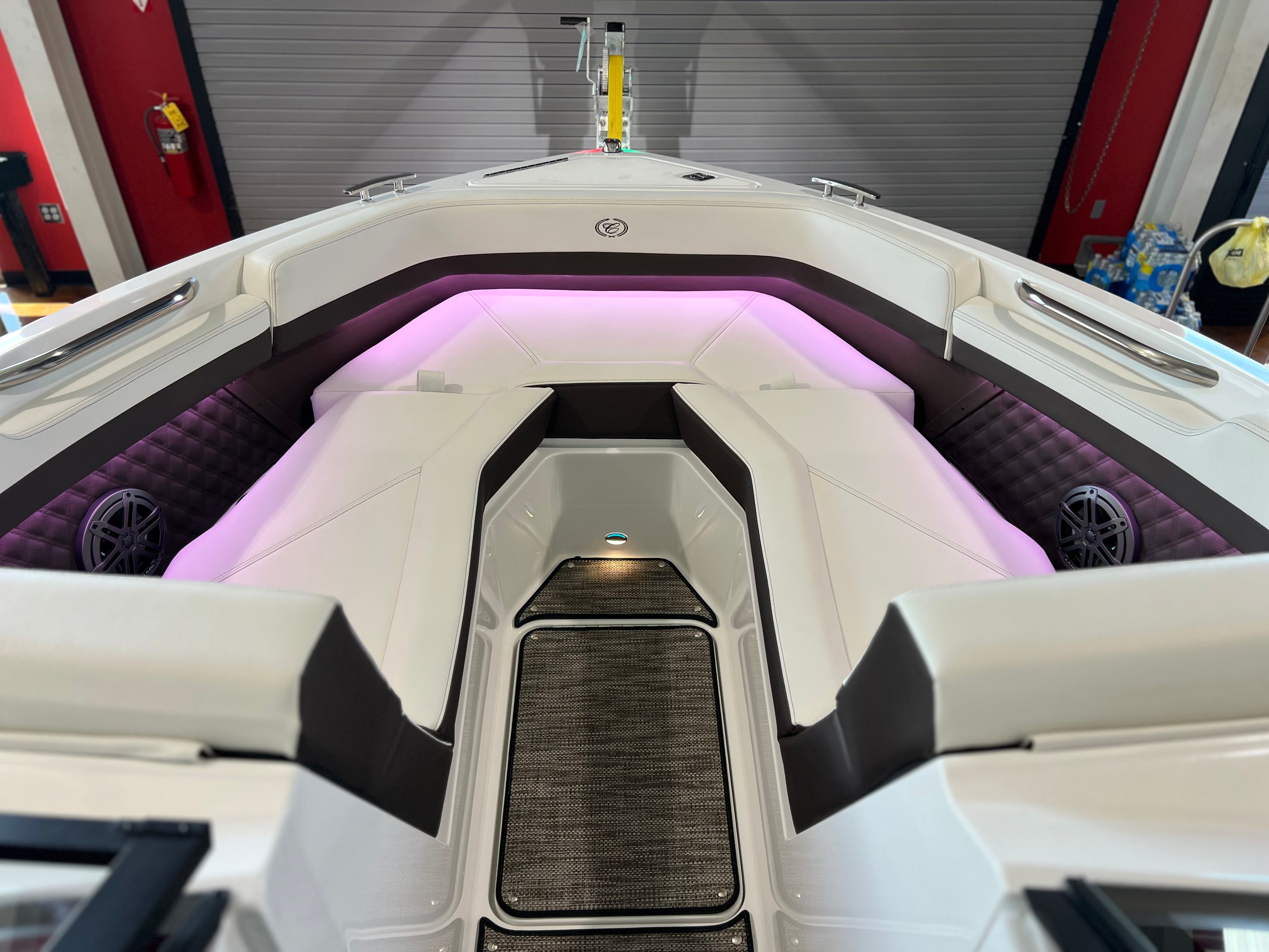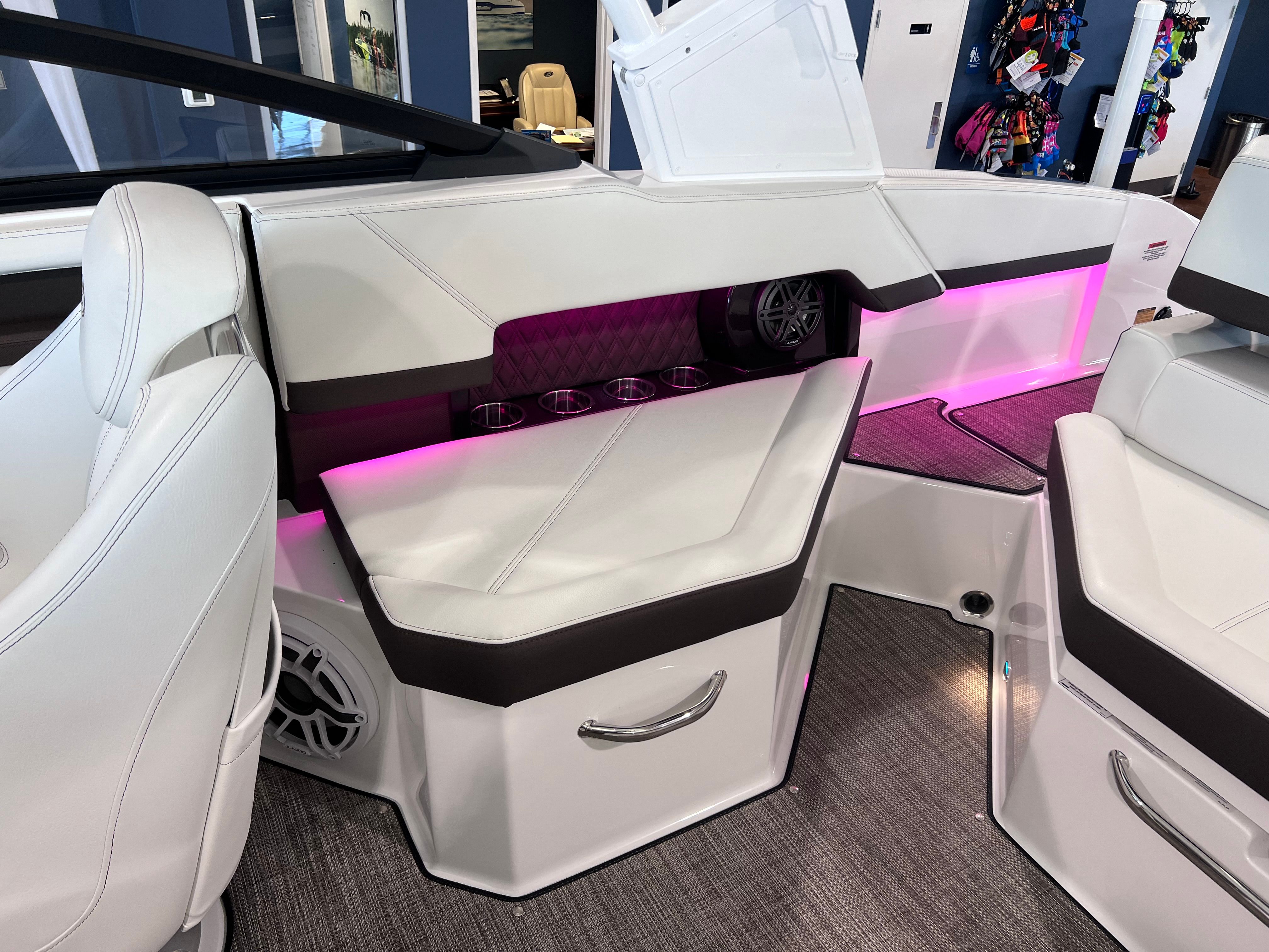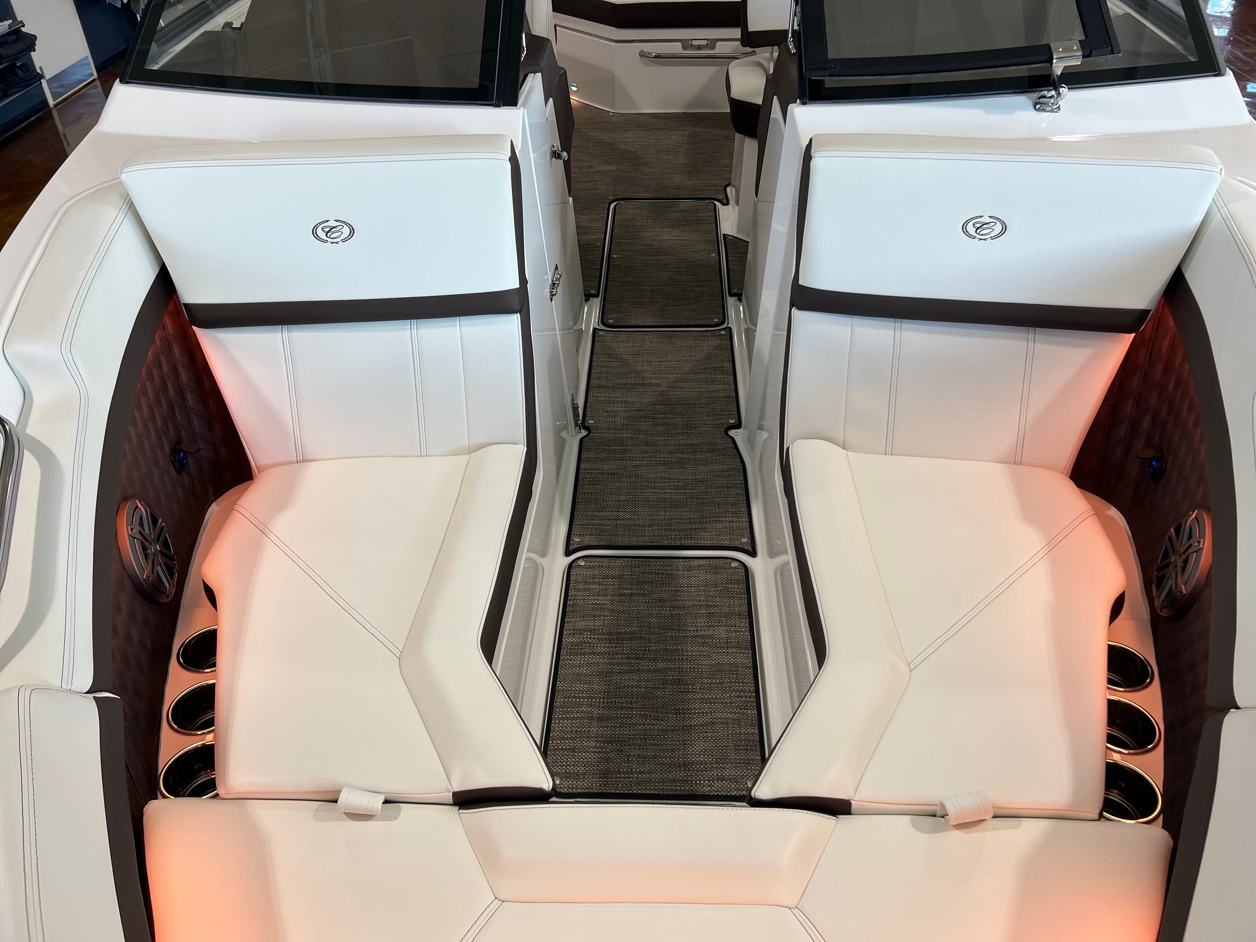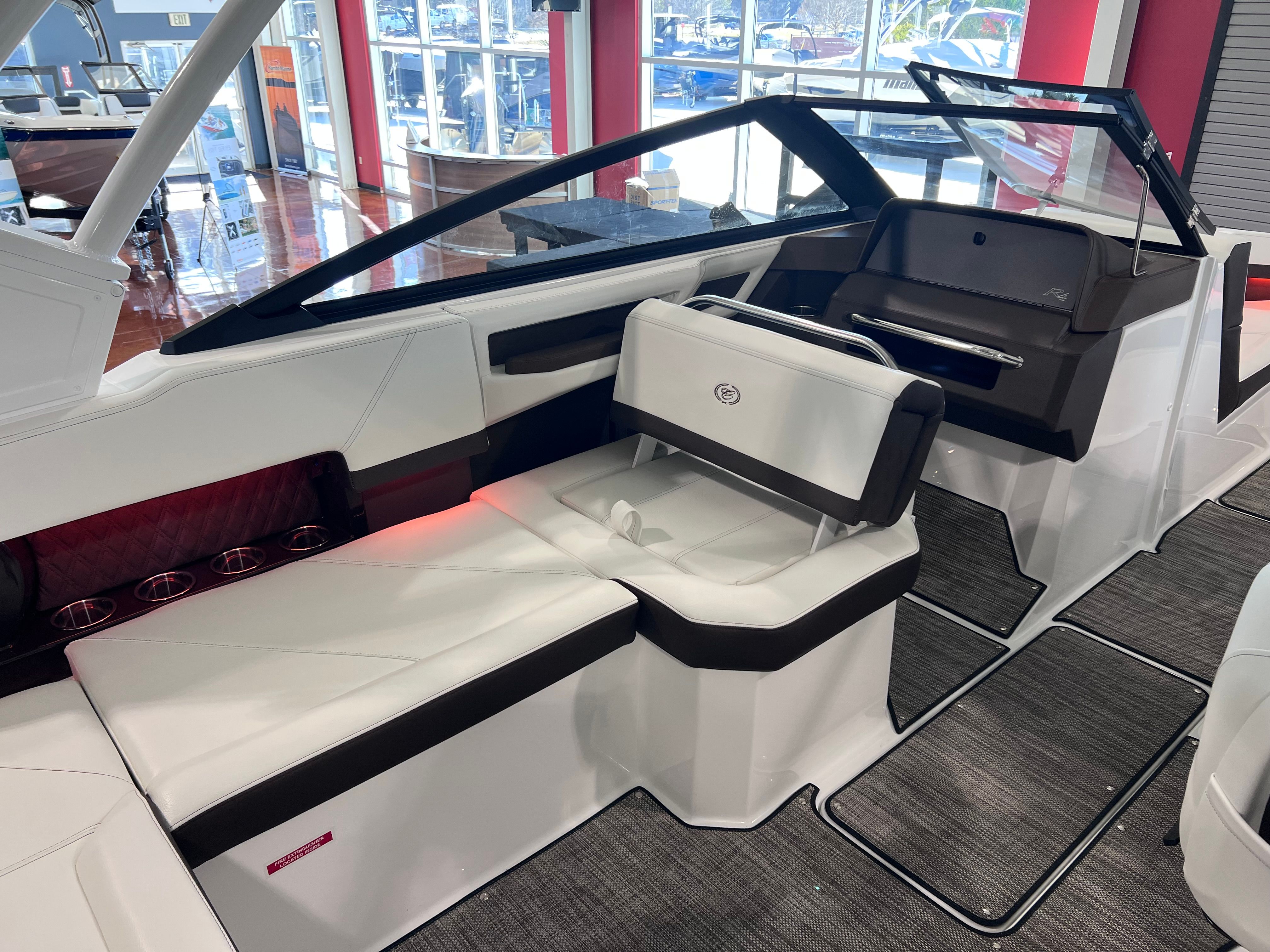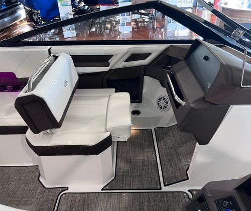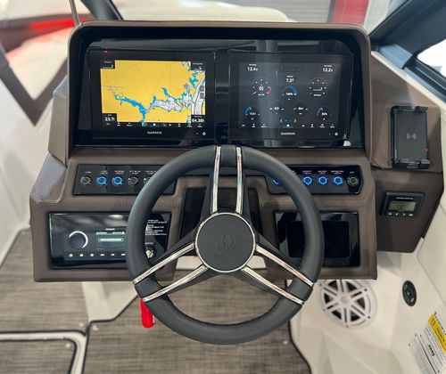 The Cobalt R4 Bowrider is packed with premium features designed to enhance your time on the water. The aft-facing rumble seat offers a unique vantage point for relaxing or socializing, while the arch, E2, white folding with bimini provides shade and protection from the sun, ensuring comfort during long days afloat. The captain’s navy accents add a touch of elegance to the helm, complementing the boat’s overall aesthetic.For added convenience, the battery maintainer/charger keeps your electrical systems in top condition, so you’re always ready to hit the water. Stainless steel docking lights illuminate your path during evening excursions, while fender clips with line make docking and undocking a breeze. The flagpole with flag adds a patriotic flair, and the floor covering in seagrass, raw umber, offers both durability and style underfoot.The glass cockpit is equipped with dual Garmin 8610 displays, providing state-of-the-art navigation and system monitoring. This advanced technology ensures you have all the information you need at your fingertips, making every journey safer and more enjoyable.