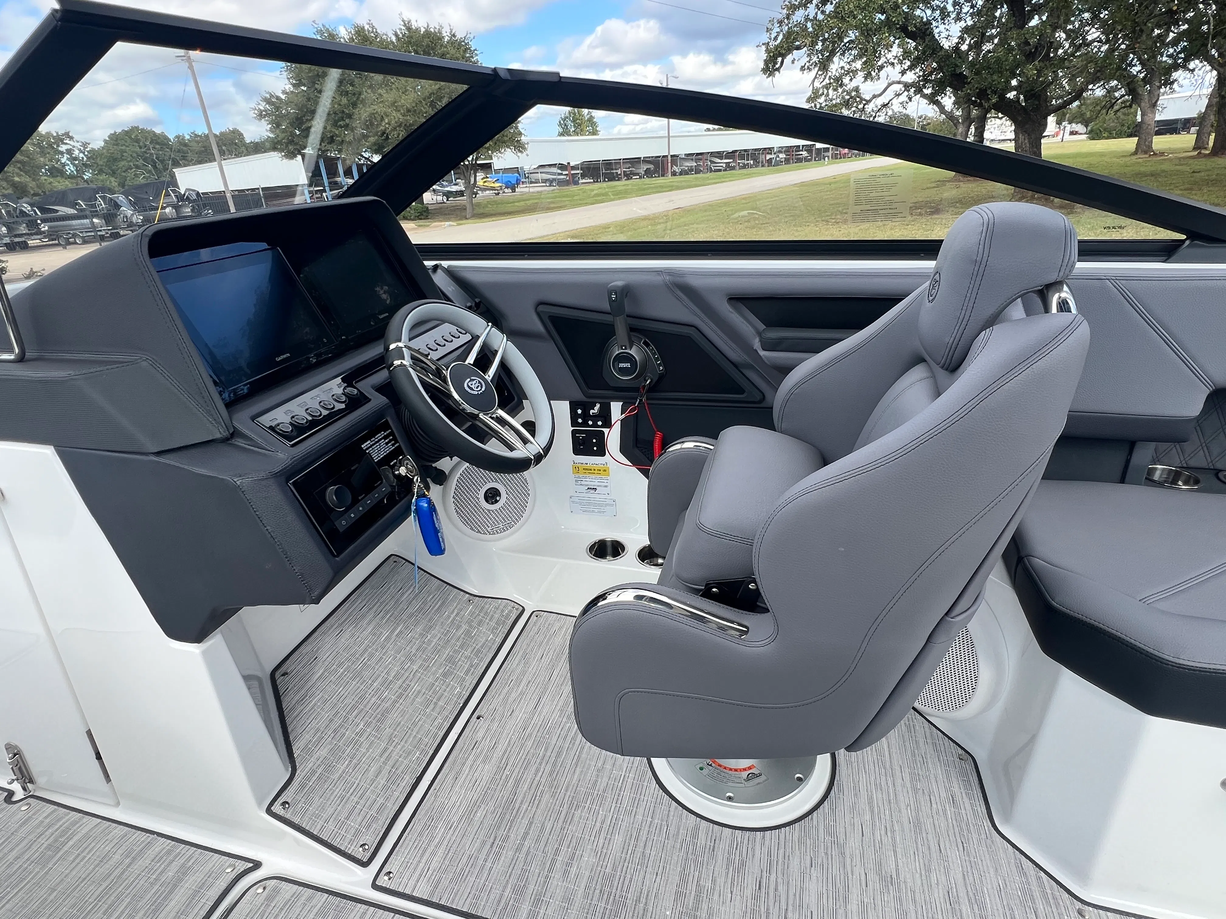 The Cobalt R4 Bowrider is packed with premium features designed to enhance your time on the water. Enjoy the comfort of the aft-facing rumble seat, perfect for lounging and soaking up the sun. The air compressor with holder adds convenience for inflating water toys and equipment, while the battery maintainer/charger ensures your boat is always ready for action. Bow filler cushions provide additional seating and relaxation options, making the bow area a favorite spot for guests.The dinette table, crafted from solid teak and equipped with a cockpit receptacle, offers a stylish and functional space for meals, snacks, or socializing. Stainless steel docking lights not only add a touch of elegance but also improve visibility during evening outings. The El Arch E2 white rotating shade in Pacific Blue provides adjustable protection from the sun, allowing you to create the perfect atmosphere on board. The electric adjustable seat ensures personalized comfort for the captain, making long days on the water even more enjoyable.
