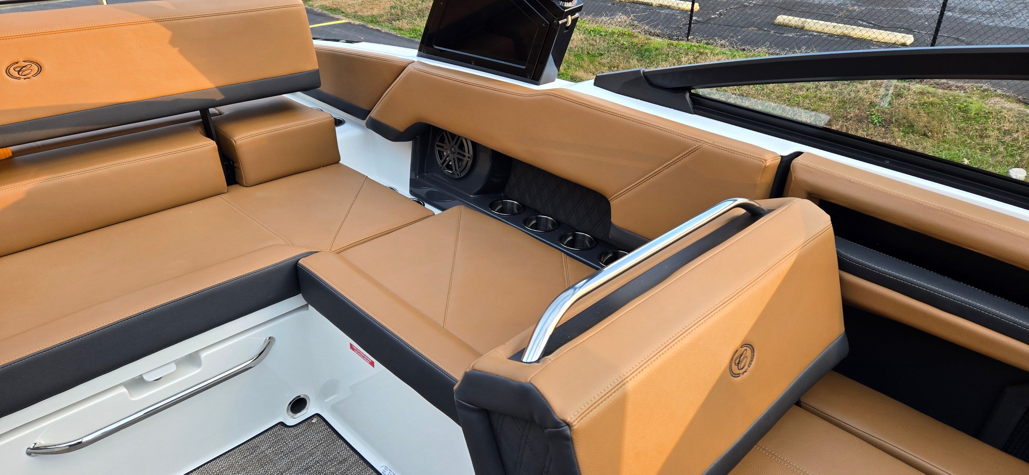 The 2026 Cobalt R4 Bowrider is packed with premium features that elevate your boating experience. The hull side and bottom are finished in Bayside Blue, complemented by a Rich Ebony accent stripe for a striking visual appeal. Step aboard and you’ll be greeted by a luxurious interior in Caramel and Carbon tones, creating a warm and inviting atmosphere for you and your guests.One of the standout features is the aft-facing rumble seat, perfect for relaxing and enjoying the scenery while anchored or docked. The Arch E2 Black with Bimini in Ebony provides ample shade and protection from the sun, ensuring comfort during long days on the water. Practicality meets style with the inclusion of a battery maintainer/charger, keeping your boat ready for action at all times. The Cobalt letters in Black Satin add a touch of elegance, while stainless steel docking lights enhance safety and visibility during evening outings.