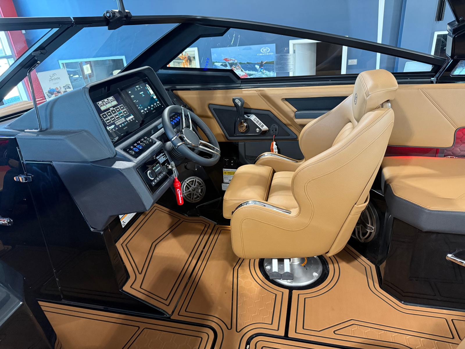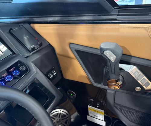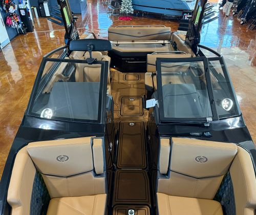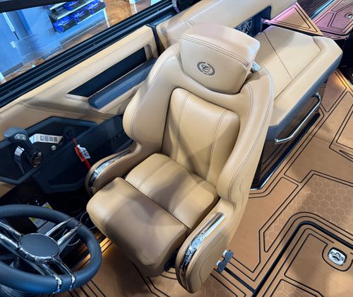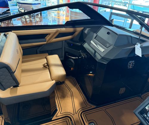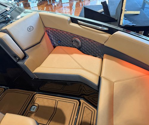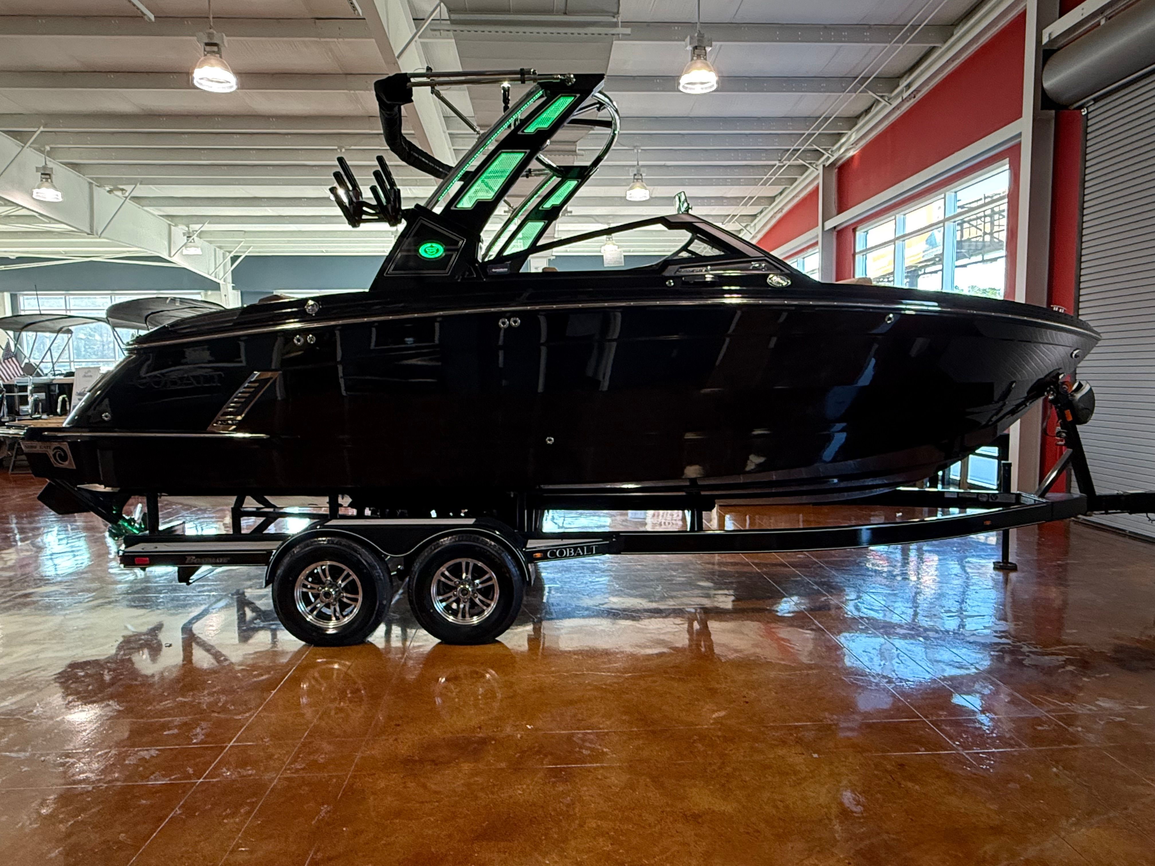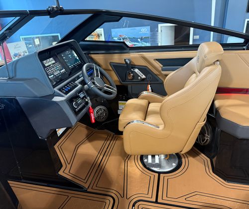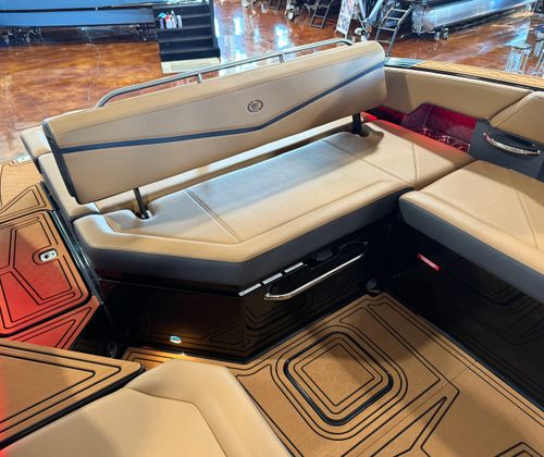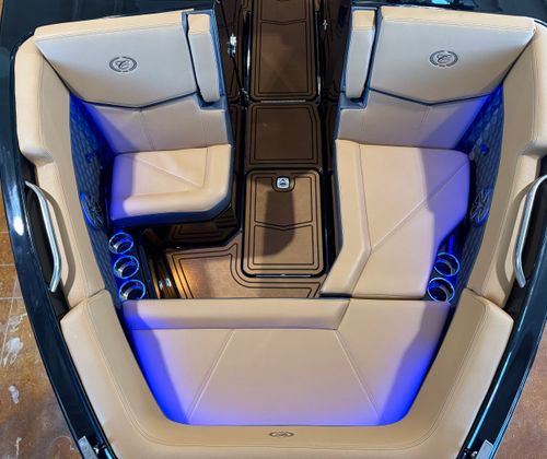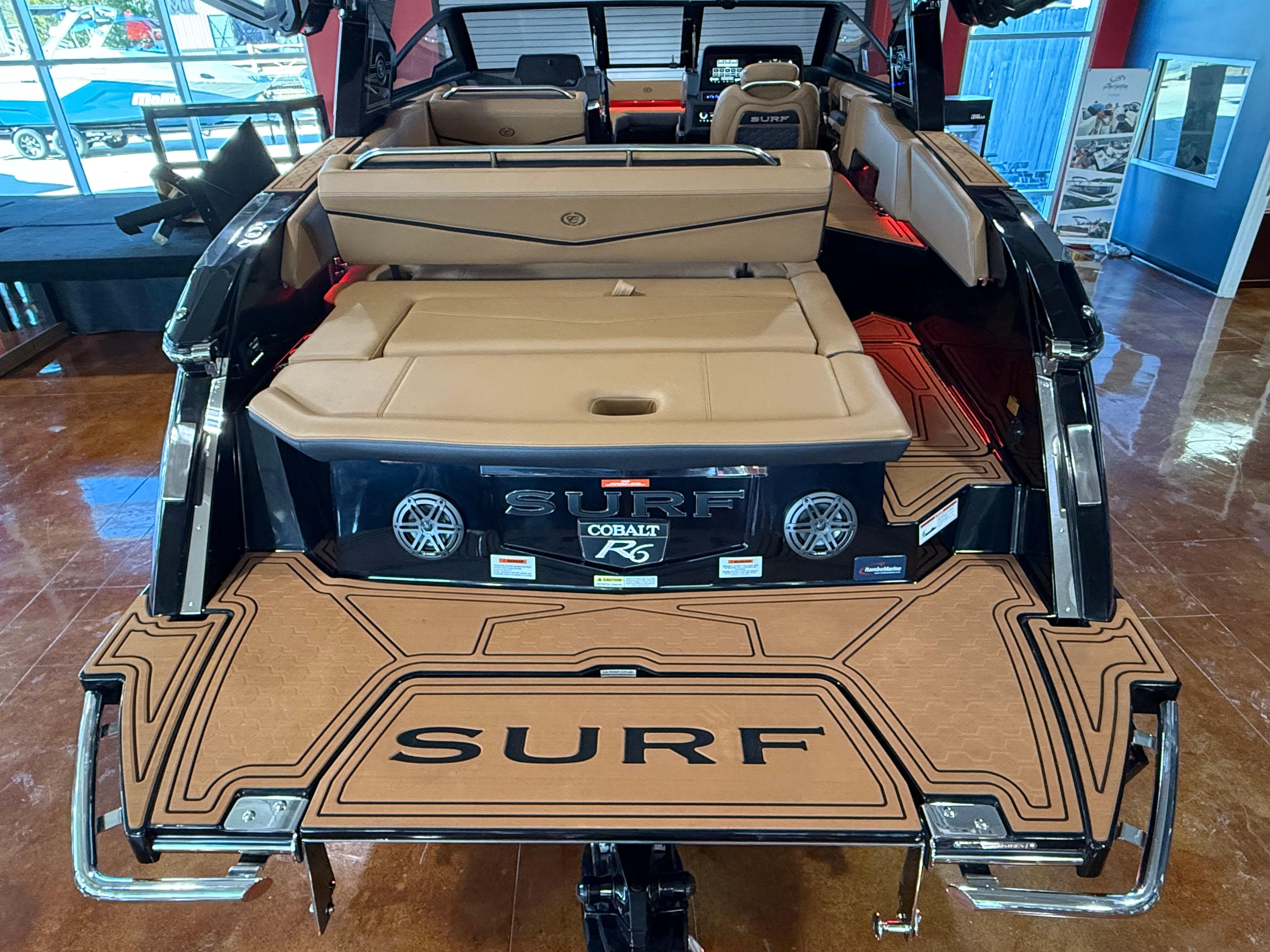 The Cobalt R6 Surf is loaded with premium features that elevate your boating experience to new heights. The dual Garmin 8610 glass cockpit provides intuitive navigation and control, giving you confidence and peace of mind as you explore new destinations. The electric arch in Prisma Black, paired with a stylish Ebony Bimini, offers both shade and a modern aesthetic, while the stainless steel docking lights ensure safe and easy maneuvering during low-light conditions. The boat’s hull bottom and full colored deck, both finished in Rich Ebony, create a bold and cohesive look that is sure to impress.Inside, the R6 Surf boasts a luxurious interior with Caramel, Carbon, and Ebony tones, complemented by Cobalt letters in Black Satin for a refined touch. The battery maintainer/charger keeps your systems powered and ready for action, while the included flagpole with flag adds a classic nautical flair. Every detail is thoughtfully designed to enhance comfort, convenience, and style, making the R6 Surf a standout among bowrider boats for sale.
