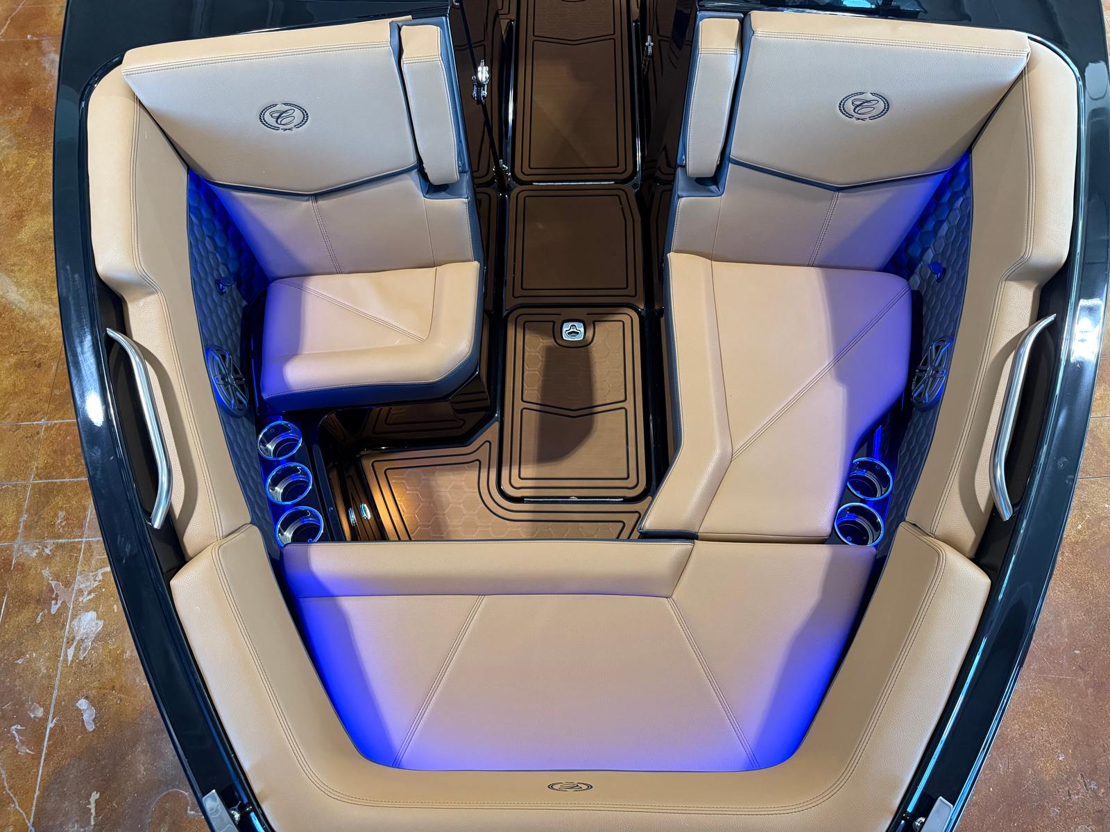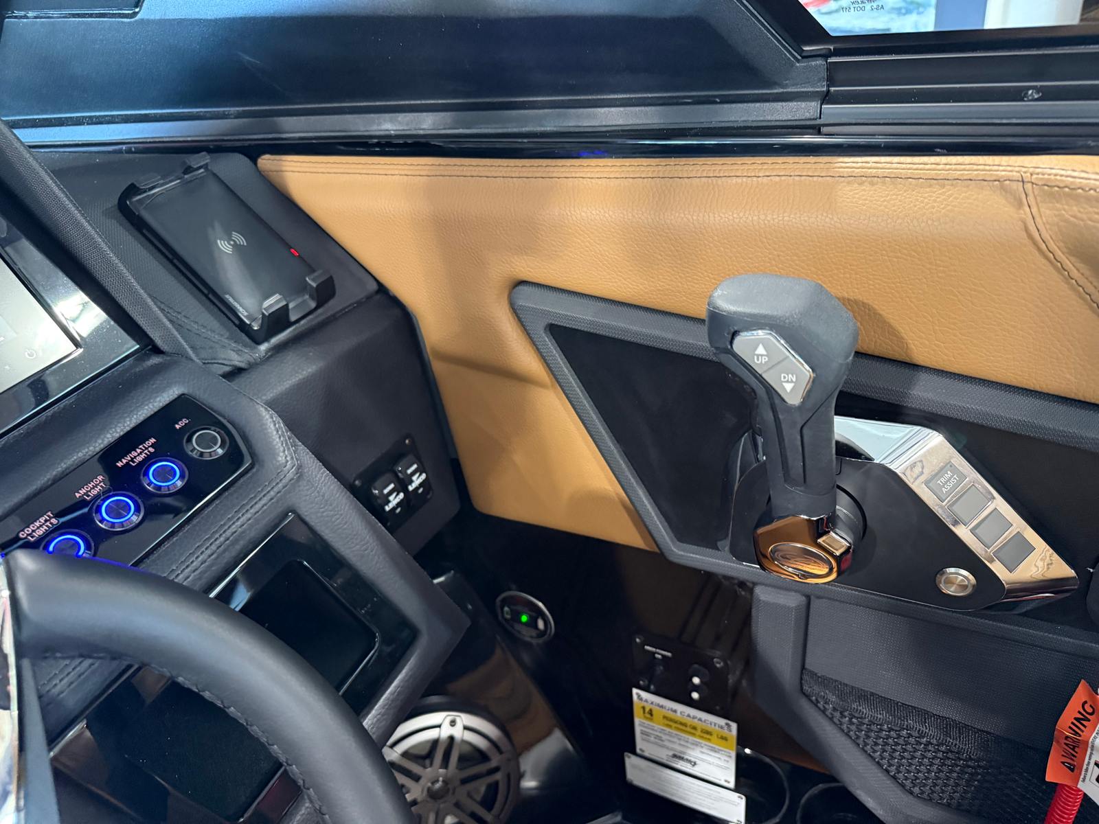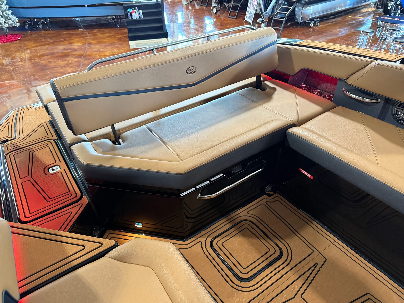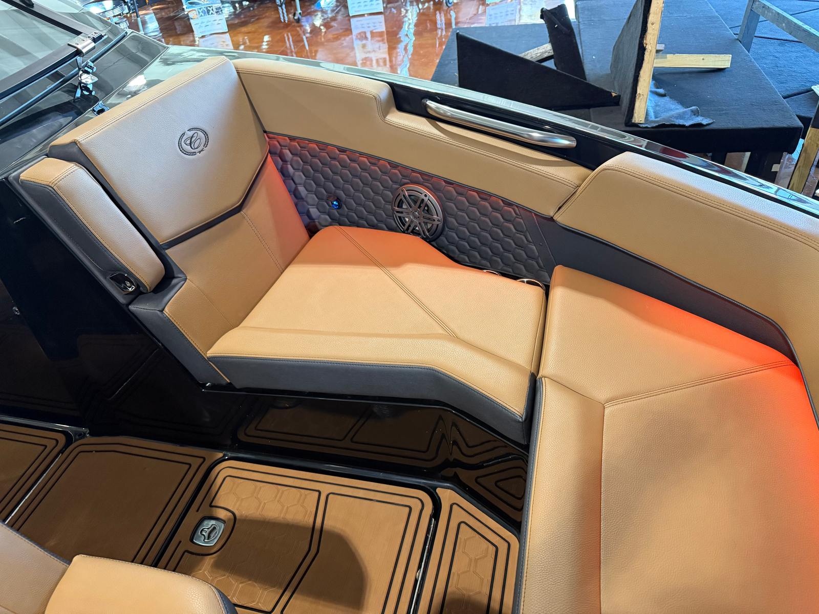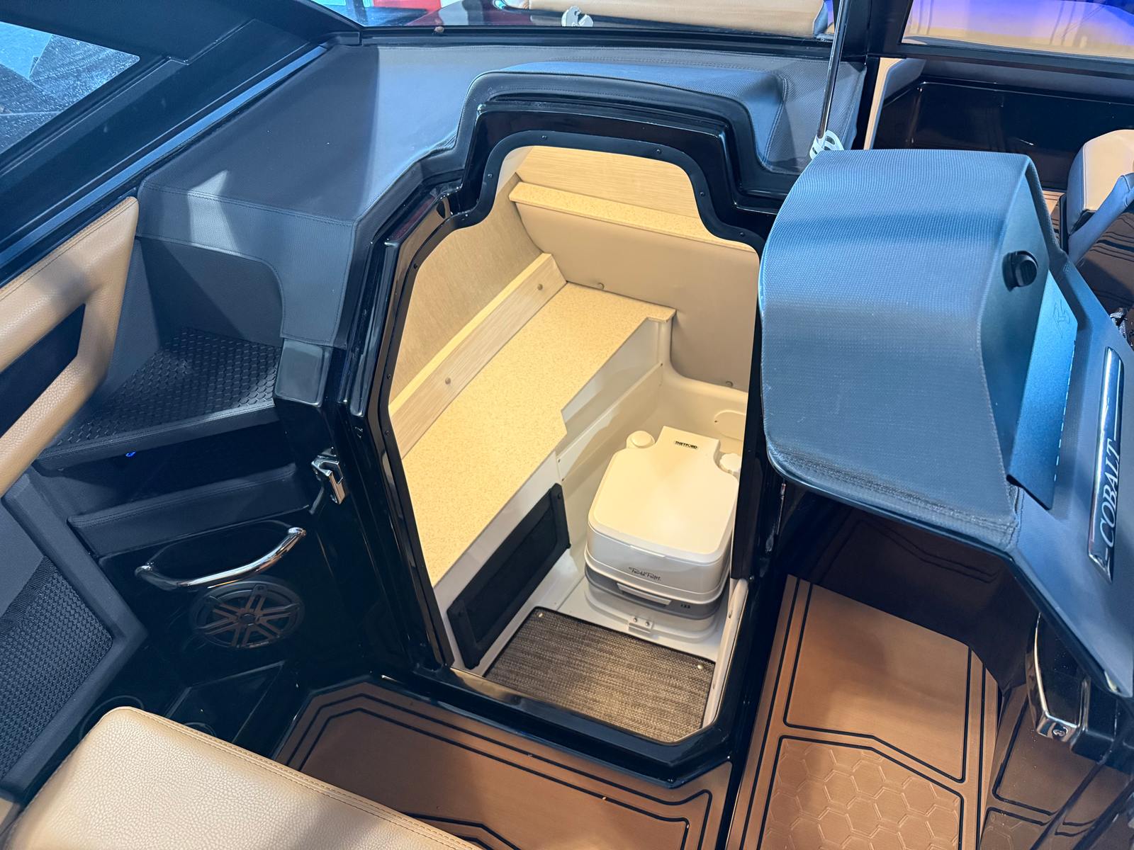 The Cobalt R6 Surf is loaded with premium features that elevate your boating experience to new heights. The dual Garmin 8610 glass cockpit provides intuitive navigation and control, giving you confidence and peace of mind as you explore new destinations. The electric arch in Prisma Black, paired with a stylish Ebony Bimini, offers both shade and a modern aesthetic, while the stainless steel docking lights ensure safe and easy maneuvering during low-light conditions. The boat’s hull bottom and full colored deck, both finished in Rich Ebony, create a bold and cohesive look that is sure to impress.Inside, the R6 Surf boasts a luxurious interior with Caramel, Carbon, and Ebony tones, complemented by Cobalt letters in Black Satin for a refined touch. The battery maintainer/charger keeps your systems powered and ready for action, while the included flagpole with flag adds a classic nautical flair. Every detail is thoughtfully designed to enhance comfort, convenience, and style, making the R6 Surf a standout among bowrider boats for sale.