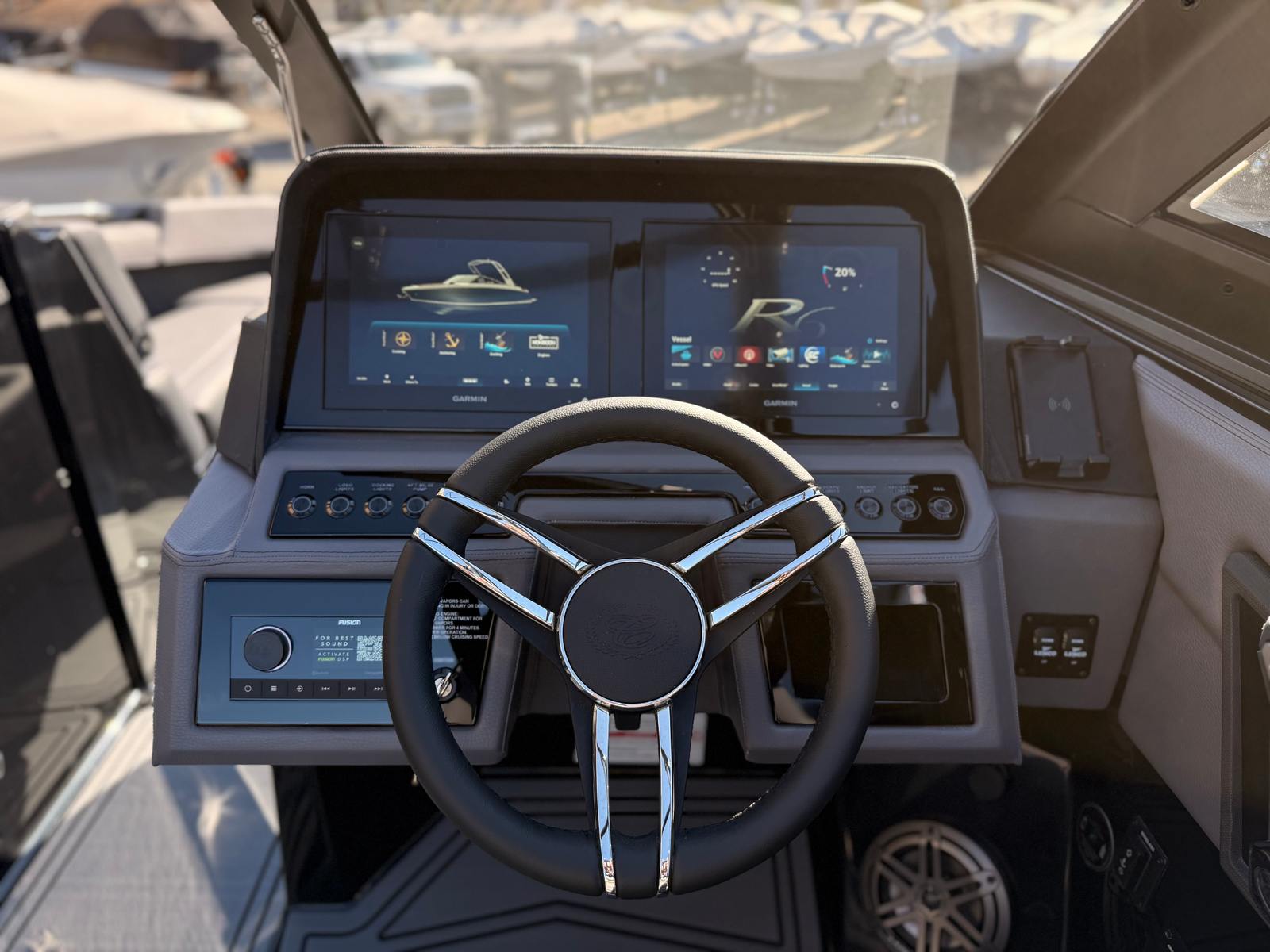 The Cobalt R6 Surf is packed with premium features designed to enhance your boating experience. The electric arch, Prisma - Black (Folding) with Ebony Bimini, offers both style and functionality, providing shade and easy storage when needed. Docking lights in stainless steel ensure safe and effortless docking, even in low-light conditions. The rear-facing camera adds an extra layer of safety and convenience, making maneuvering and watersports activities easier than ever.Enjoy the convenience of a battery maintainer/charger (110V), keeping your boat powered and ready for every adventure. The dual Garmin 8610 glass cockpit delivers state-of-the-art navigation and control, putting advanced technology at your fingertips. The head with pump out porta potti offers comfort and convenience for longer trips, while the flagpole with flag adds a touch of nautical pride to your vessel.