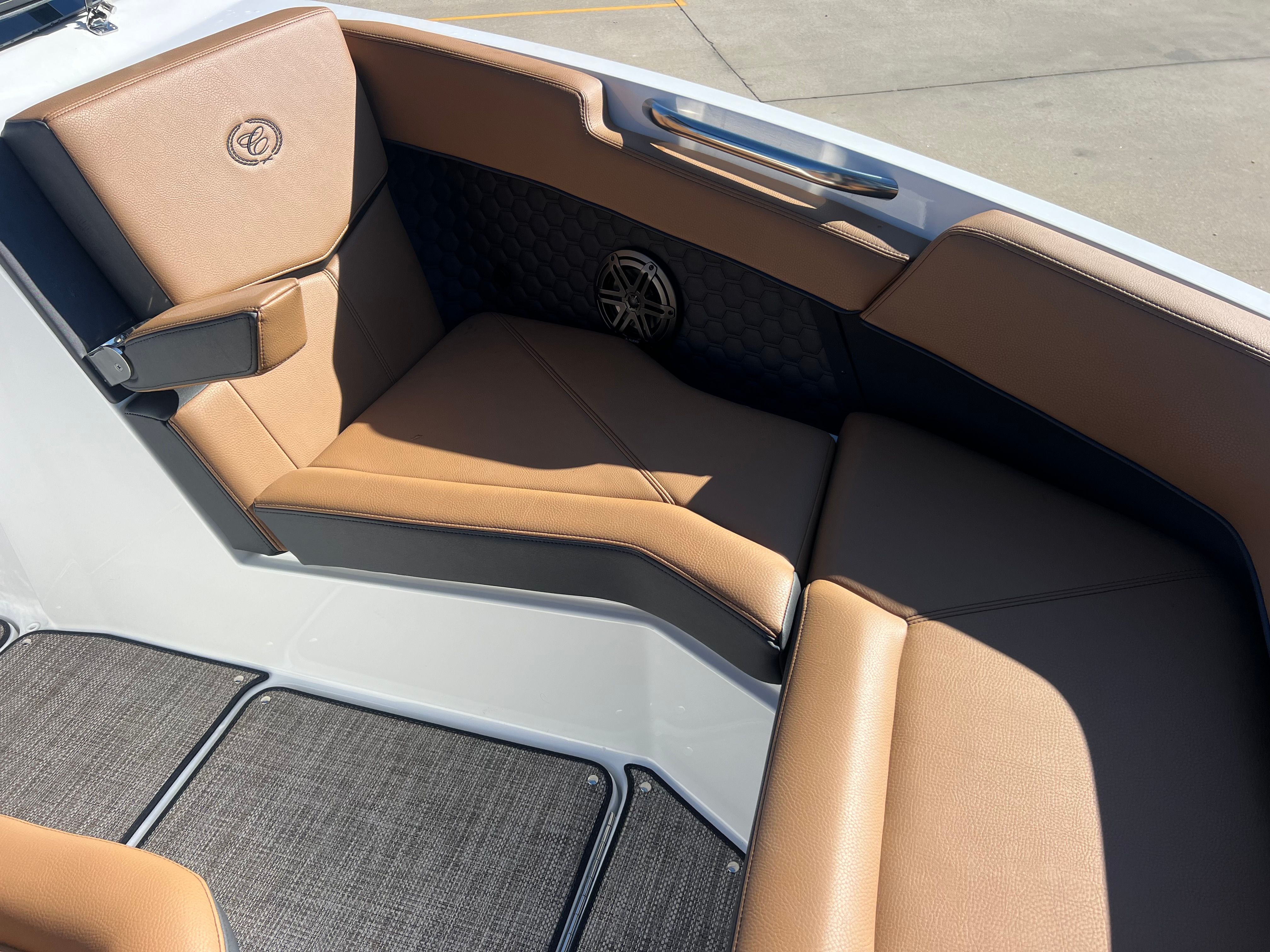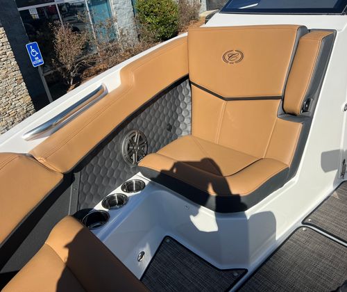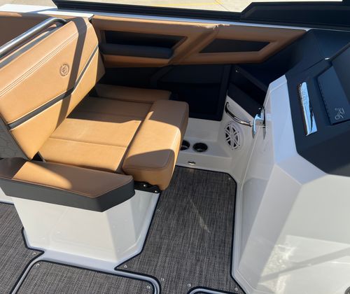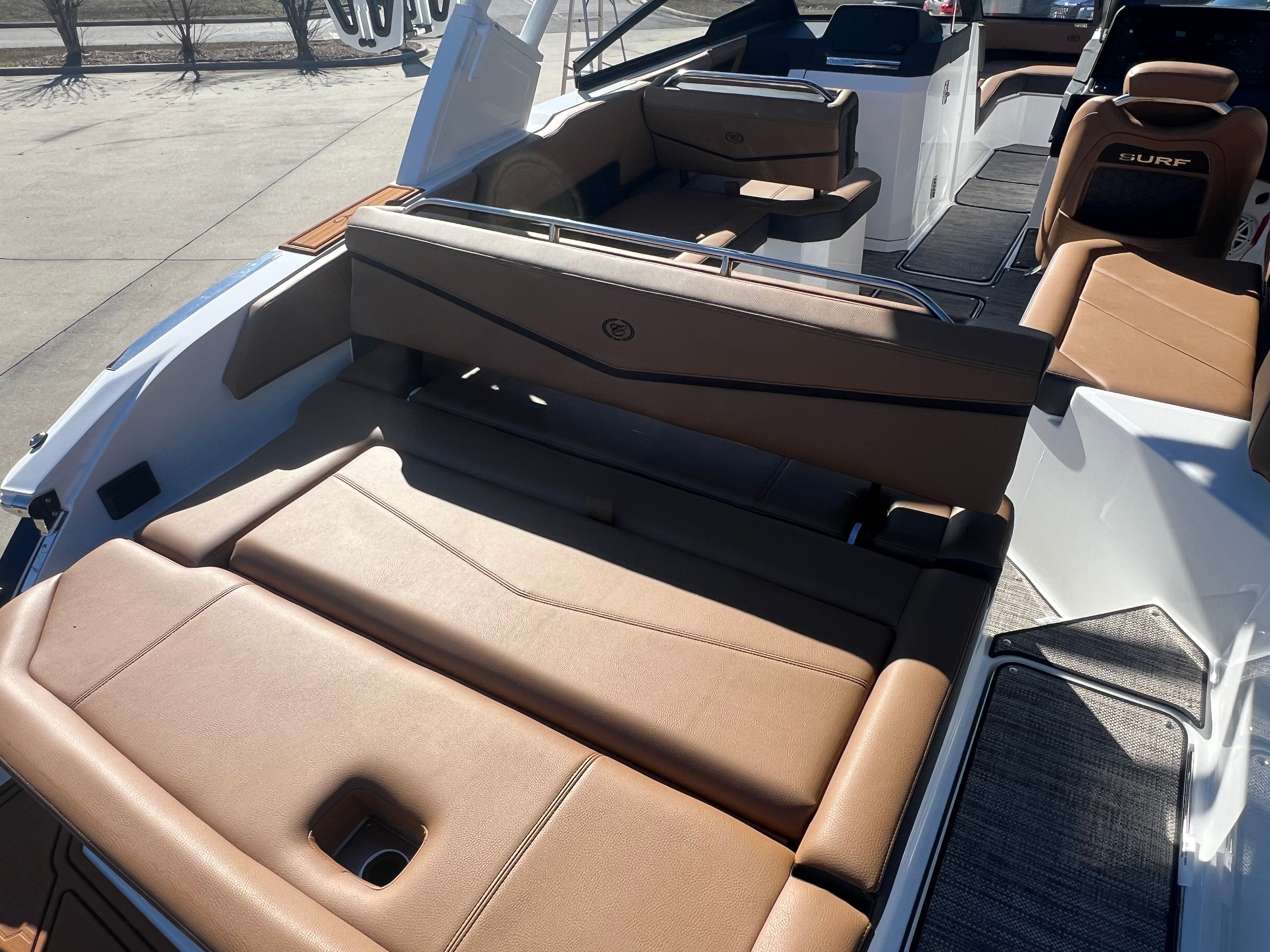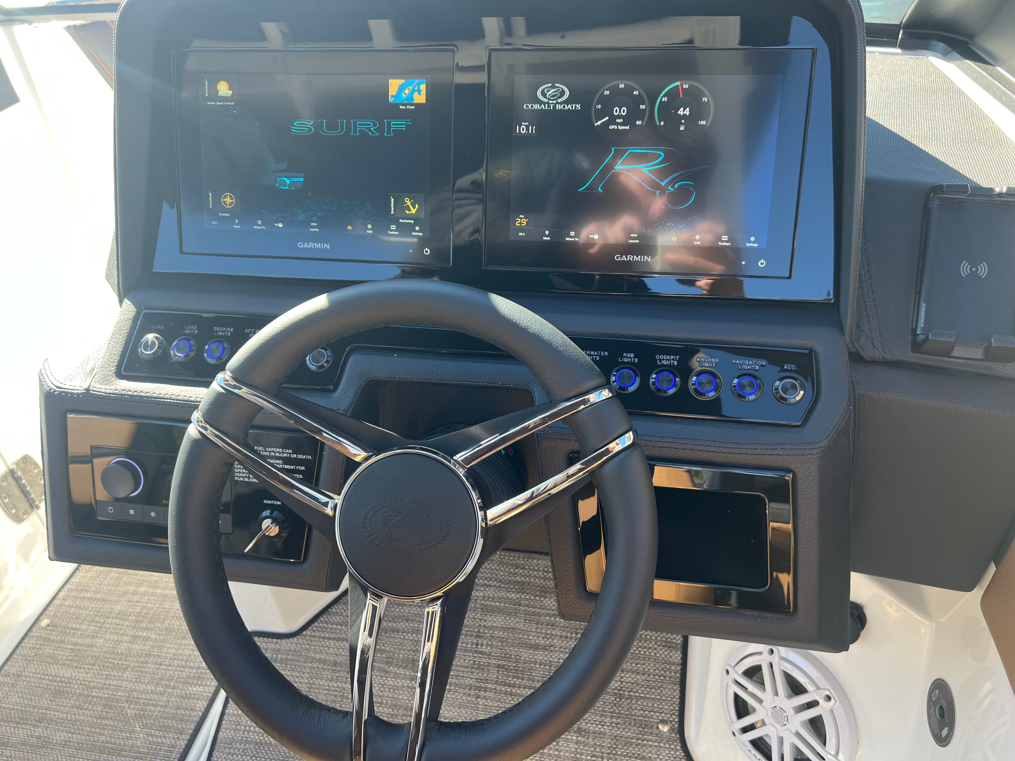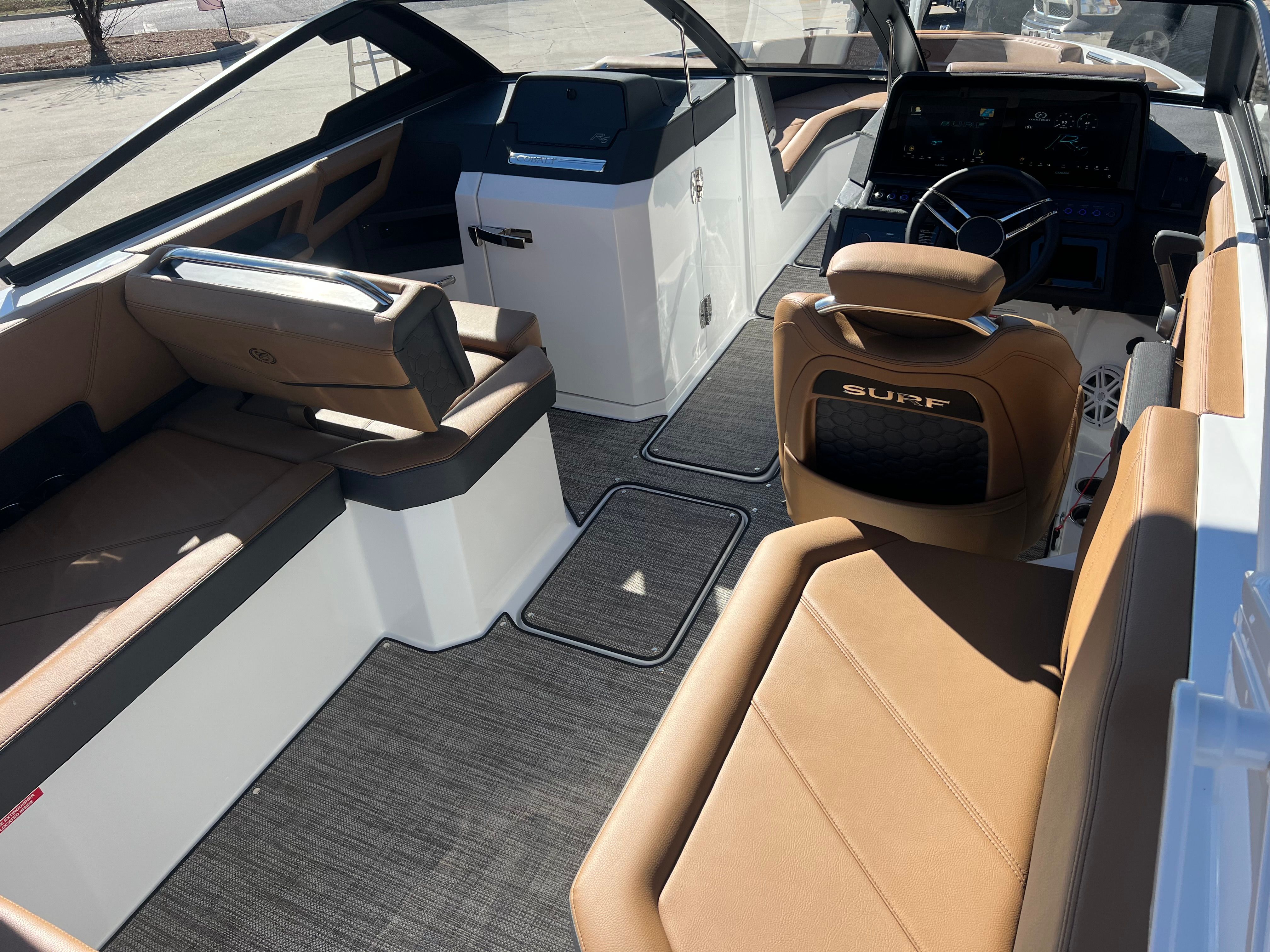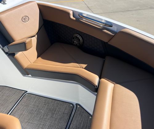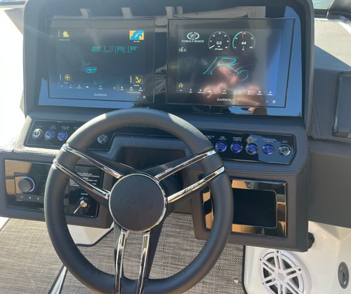The Cobalt R6 Surf is packed with special features that set it apart from other Bowrider boats for sale. The Upper Surf Accent in Navy and Surf Mid Hull Side in White create a dynamic visual appeal, while the Accent Stripe and Hull Bottom in Navy add a touch of sophistication. The interior, finished in Caramel, Carbon, and Ebony, offers plush seating and a stylish environment for passengers.This model is equipped with a Battery Maintainer/Charger, ensuring your boat is always ready for action. Bow Filler Cushions provide additional comfort and flexibility, allowing you to customize the seating arrangement for lounging or socializing. The Rear Facing Camera enhances safety and convenience, giving you a clear view of the action behind the boat—perfect for monitoring surfers or swimmers. Stainless Steel Docking Lights not only add a premium touch but also improve visibility during evening outings or when docking in low-light conditions.