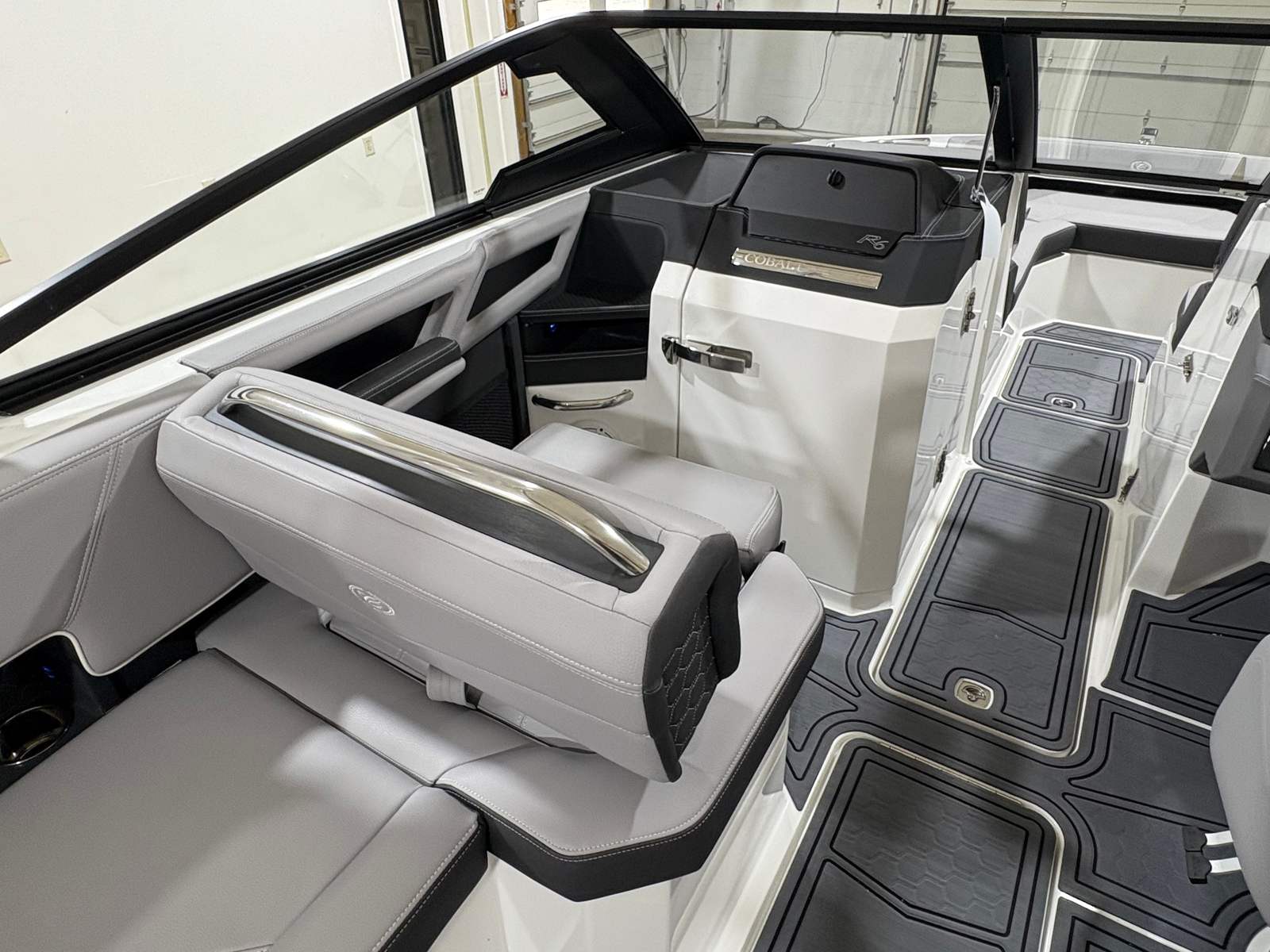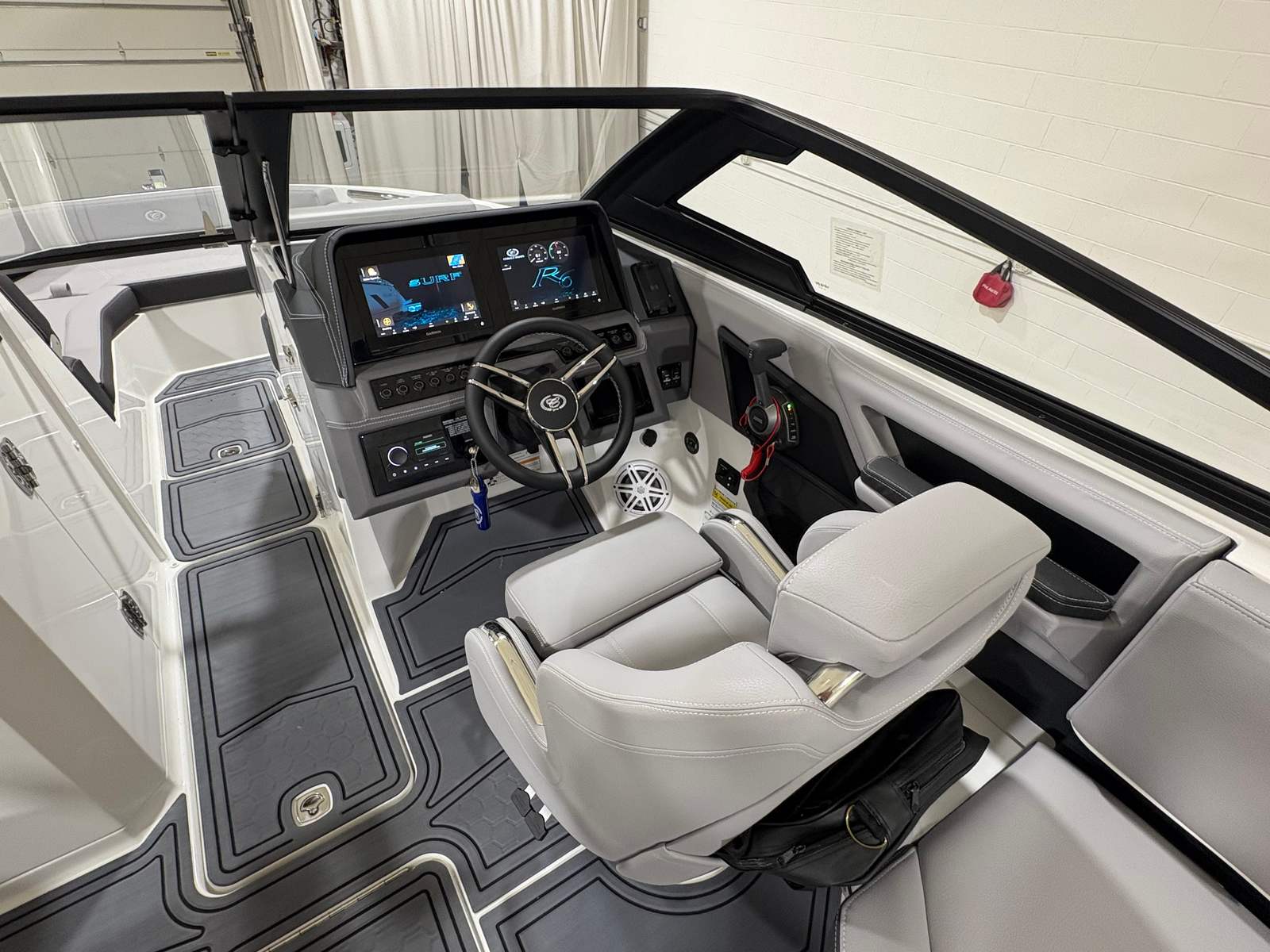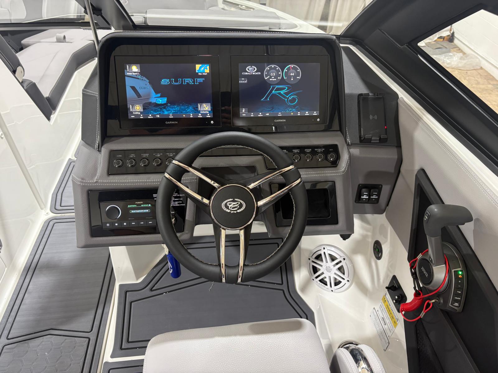The Cobalt R6 Surf is loaded with premium features that elevate your boating experience. The stainless steel docking lights not only add a touch of elegance but also improve visibility during evening arrivals and departures. The electric arch, Prisma - White (folding) with Navy Bimini, provides shade and protection from the sun while maintaining a sleek profile. The glass cockpit, featuring dual Volvo 8610 displays, offers intuitive control and navigation, ensuring you stay informed and in command at all times.Inside, the Frost, Slate, and White interior creates a comfortable and stylish environment for passengers. LED interior accent lighting with R/G/B options allows you to set the mood for any occasion, while the mooring cover with Prisma folding arch protects your investment when the boat is not in use. The premium sound system, complete with transom speakers and remote, delivers crystal-clear audio throughout the vessel, perfect for entertaining guests or enjoying your favorite tunes while cruising. The Sof-Trac mat in the cockpit and bow, finished in Gray/Ebony, provides a soft, non-slip surface for added comfort and safety.