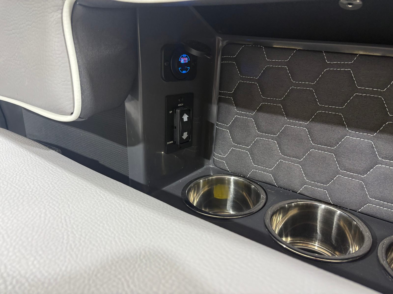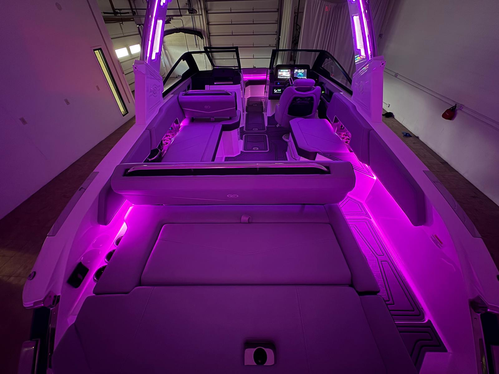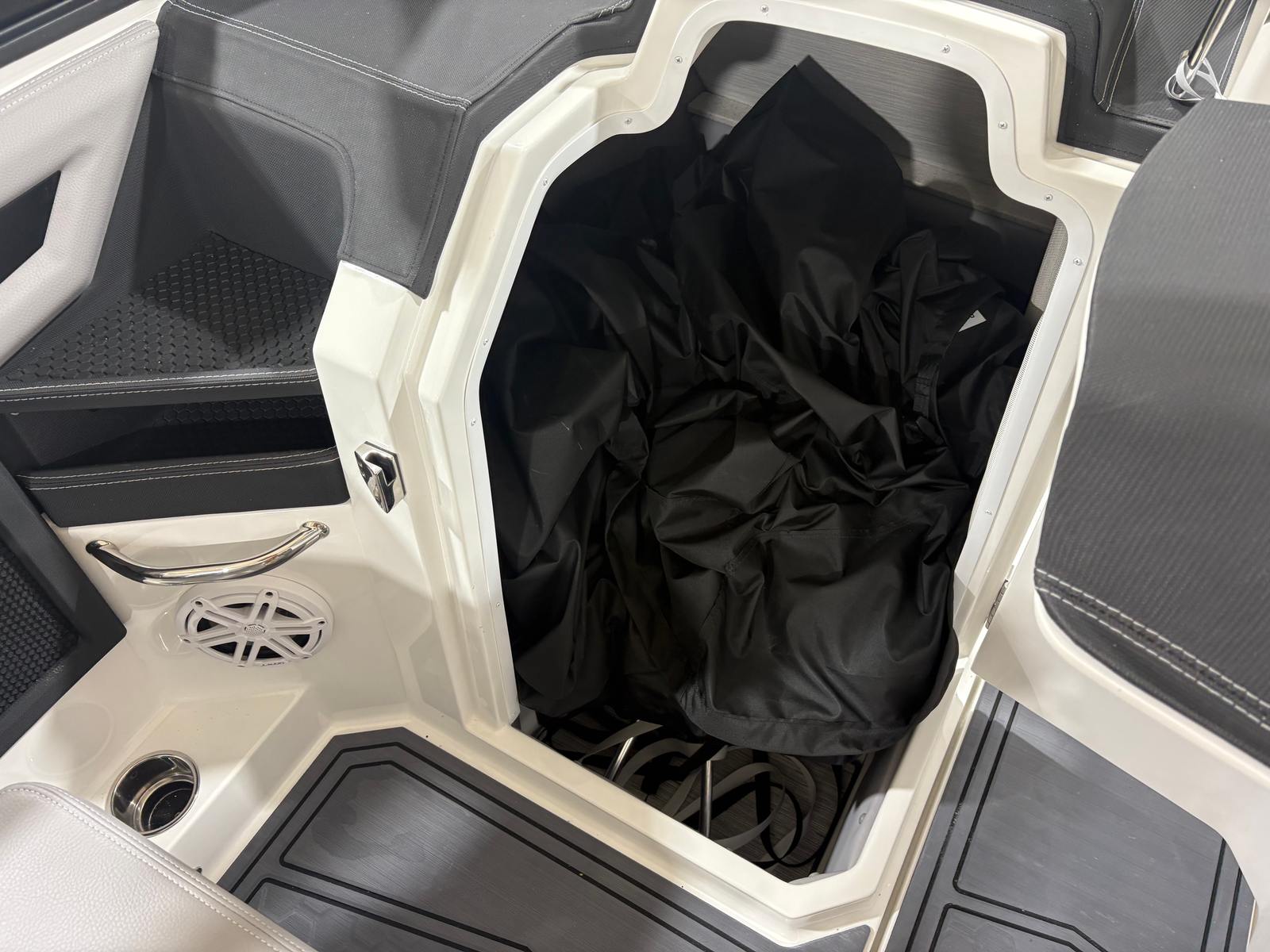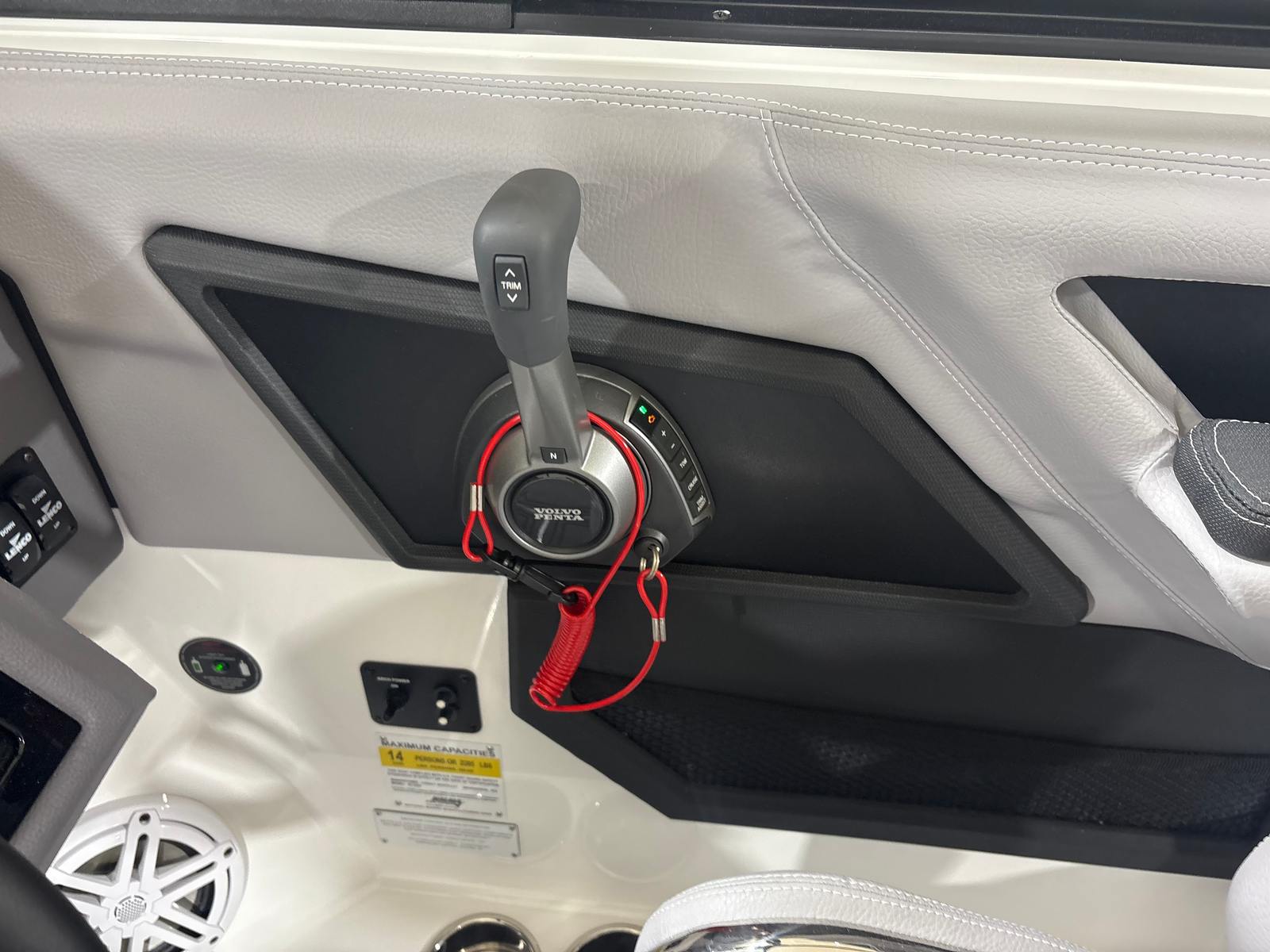 The Cobalt R6 Surf is loaded with premium features that elevate your boating experience. The stainless steel docking lights not only add a touch of elegance but also improve visibility during evening arrivals and departures. The electric arch, Prisma - White (folding) with Navy Bimini, provides shade and protection from the sun while maintaining a sleek profile. The glass cockpit, featuring dual Volvo 8610 displays, offers intuitive control and navigation, ensuring you stay informed and in command at all times.Inside, the Frost, Slate, and White interior creates a comfortable and stylish environment for passengers. LED interior accent lighting with R/G/B options allows you to set the mood for any occasion, while the mooring cover with Prisma folding arch protects your investment when the boat is not in use. The premium sound system, complete with transom speakers and remote, delivers crystal-clear audio throughout the vessel, perfect for entertaining guests or enjoying your favorite tunes while cruising. The Sof-Trac mat in the cockpit and bow, finished in Gray/Ebony, provides a soft, non-slip surface for added comfort and safety.