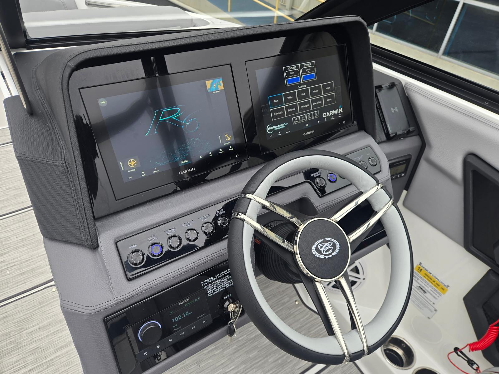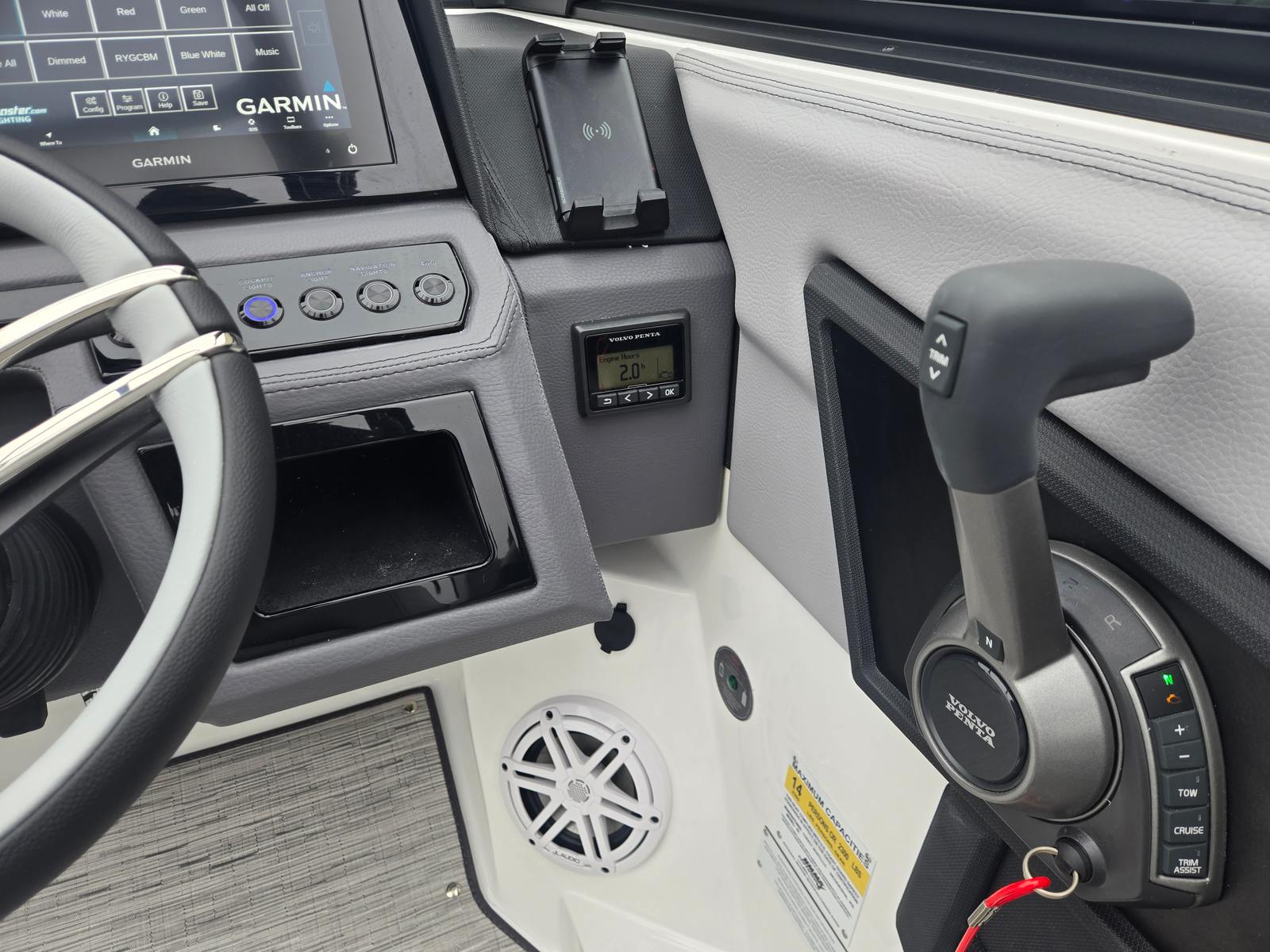 The 2026 Cobalt R6 is loaded with special features that enhance both comfort and convenience. The stylish Arch with Bimini provides shade and protection from the sun, allowing you to enjoy long days on the water in comfort. The integrated battery charger ensures your boat is always ready for action, while the distinctive Cobalt Letters in White Satin add a touch of elegance to the exterior.Docking is made effortless with stainless steel docking lights, offering enhanced visibility and safety during low-light conditions. Step aboard and you’ll be greeted by the plush Floor Covering in Seagrass—Silver Ash, which is both luxurious underfoot and easy to maintain. The Interior in Frost/Slate creates a modern, inviting atmosphere, complemented by the upgraded Leather Steering Wheel in Black/Gray for a premium driving experience.The R6’s Glass Cockpit with Dual Garmin displays puts advanced navigation and system controls at your fingertips, ensuring you stay informed and in command at all times. The striking hull colors—Rich Ebony on the bottom and Deep Teal on the sides—give this Bowrider a distinctive, upscale look that stands out on any waterway.