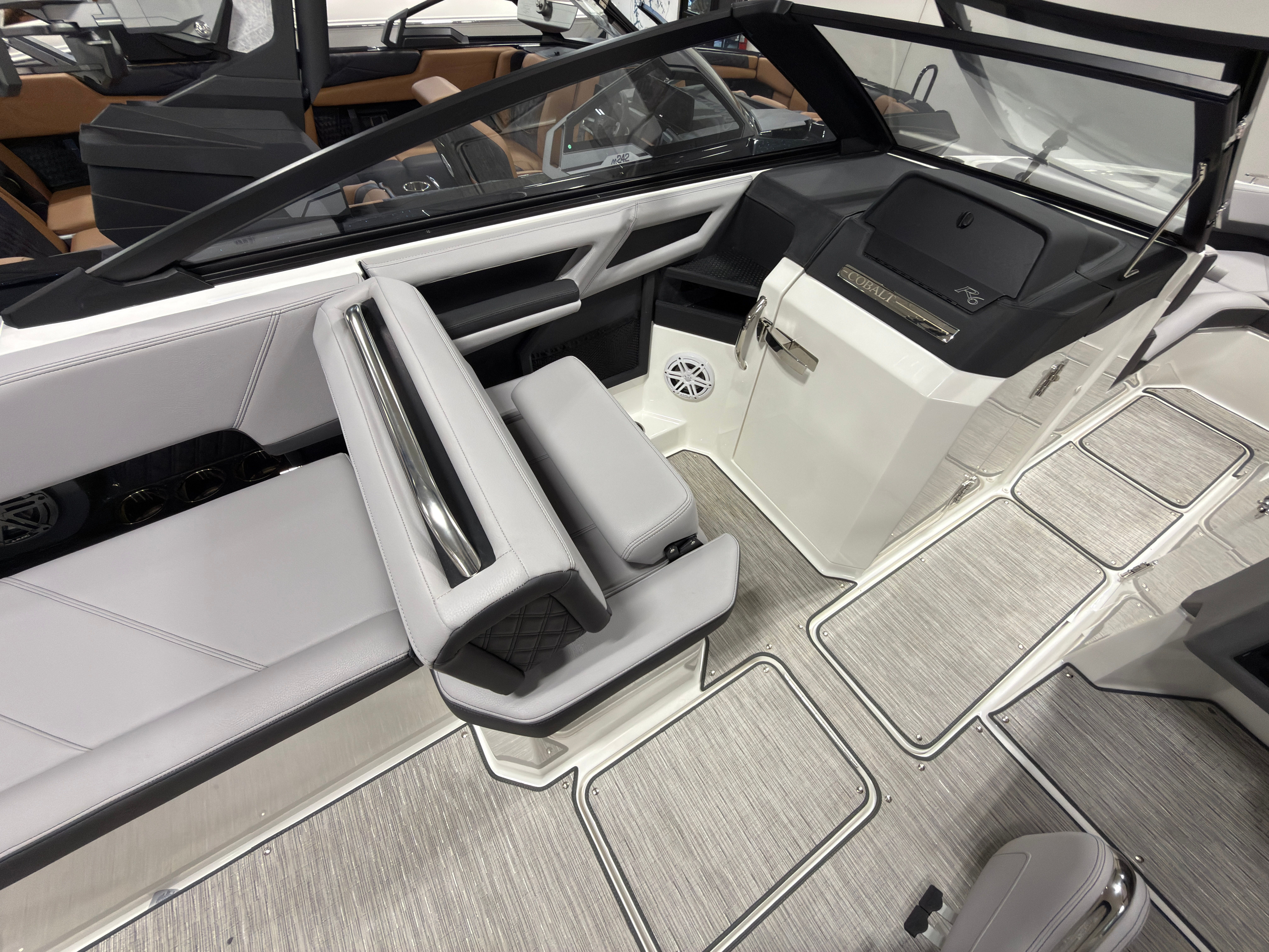 Beyond its luxurious features, the Cobalt R6 is designed with practicality in mind. The folding arch allows for easy storage in garages or boat houses, while the mooring cover helps protect your boat from the elements when not in use. The stainless steel docking lights make nighttime docking safer and more convenient, and the battery maintainer/charger ensures your boat is always ready for spontaneous adventures.The wireless phone charger and holder keep your devices secure and powered, so you can capture memories, navigate, or stay in touch without worry. The spacious interior offers plenty of room for gear, coolers, and water toys, making it easy to prepare for a full day of fun on the water. With its efficient hull design and powerful engine, the R6 delivers an optimal balance of performance and fuel economy, so you can spend more time enjoying the water and less time at the pump.