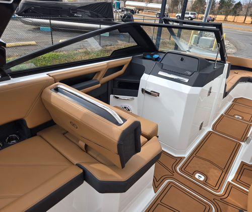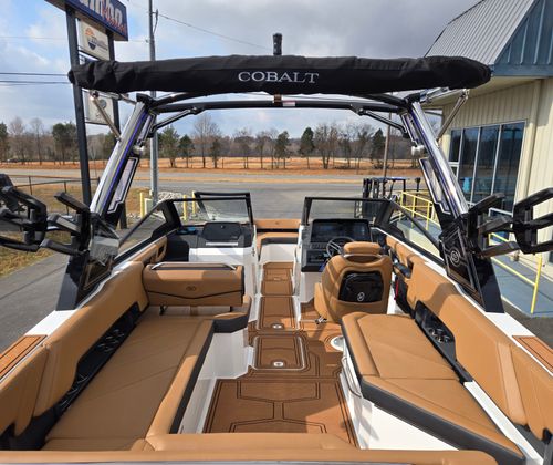 The 2026 Cobalt R8 Surf is loaded with premium features that set it apart from other bowriders. The interior showcases a sophisticated palette of Caramel, Carbon, and Ebony, creating a warm and inviting atmosphere for you and your guests. The Cobalt Letters in White Satin add a touch of elegance and brand distinction. Stainless steel docking lights enhance visibility and safety during evening outings, while the Black EL Arch, Prisma (Folding) with Ebony Bimini, provides both style and shade for sunny days.The glass cockpit is equipped with dual Garmin 8610 displays, offering state-of-the-art navigation and control at your fingertips. The head with pump-out porta potti adds convenience for longer trips, ensuring comfort for everyone on board. LED interior accent lighting in customizable red, green, and blue hues sets the perfect mood for any occasion. The mooring cover, paired with the Prisma folding arch, protects your investment and makes storage a breeze. A battery maintainer/charger (110V) ensures your boat is always ready for action, keeping your systems powered and reliable.