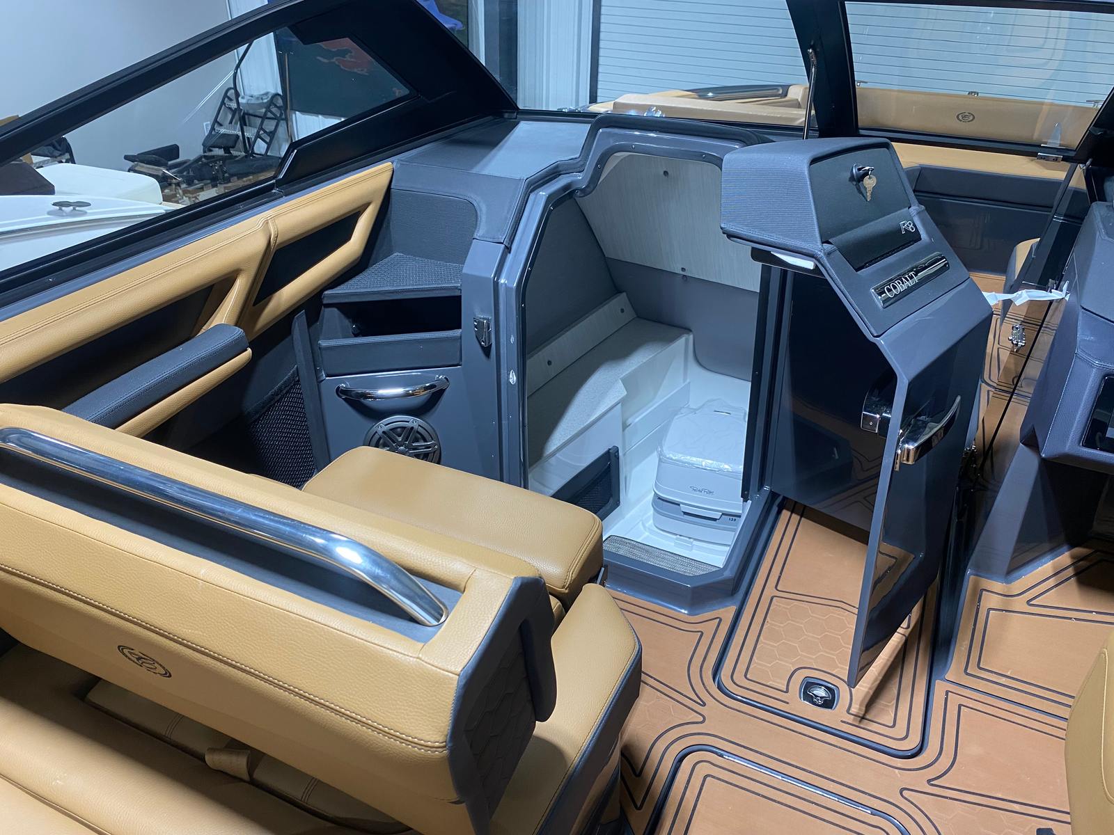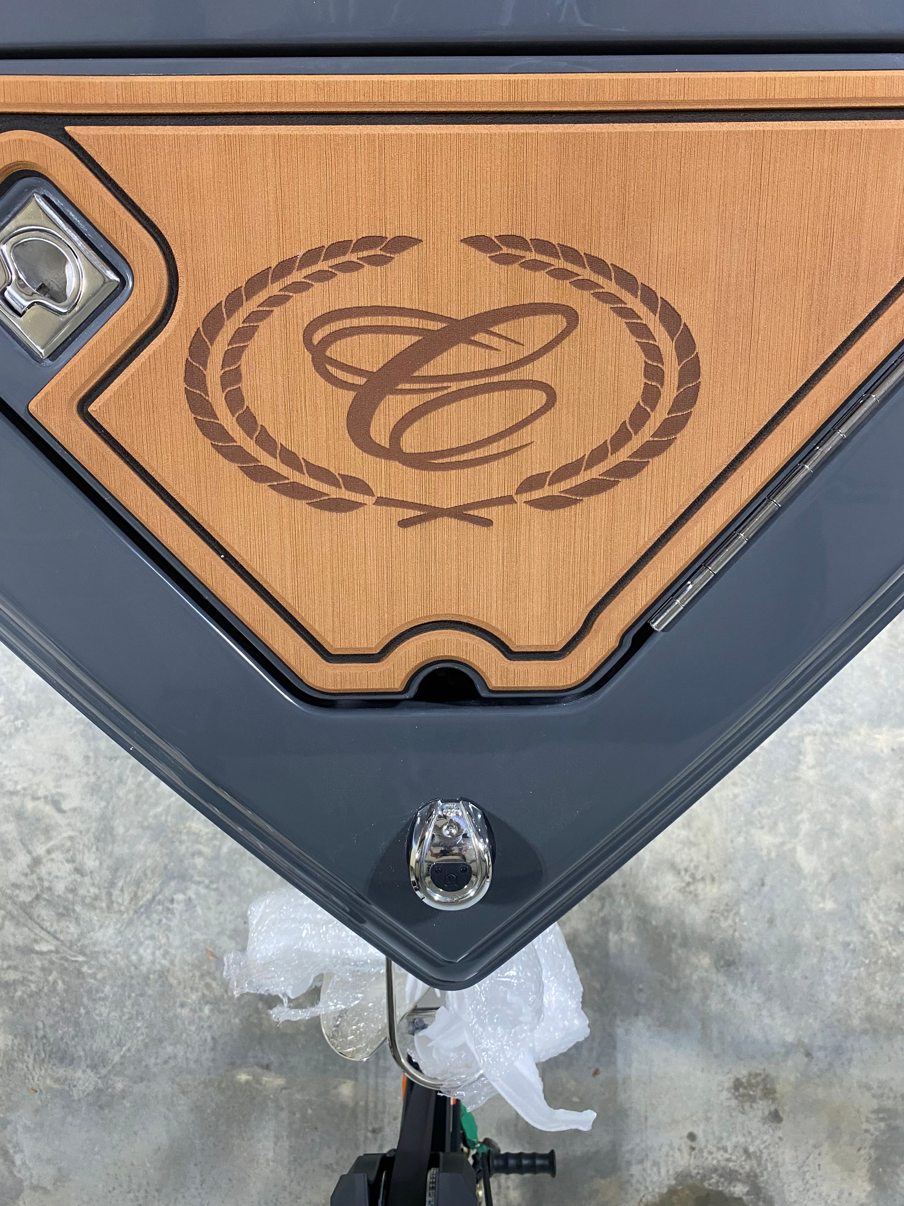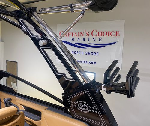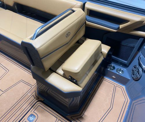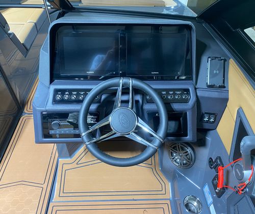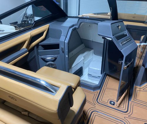 The Cobalt R8 Surf is loaded with premium features that enhance both its aesthetic appeal and functionality. The interior is finished in a sophisticated combination of Caramel, Carbon, and Ebony, creating a warm and inviting atmosphere. Black Satin Cobalt letters add a touch of elegance to the exterior, while the full-colored deck in Graphite Gray and a rich Ebony hull bottom showcase the boat’s modern style.For those who appreciate advanced technology, the R8 Surf features a Glass Cockpit with dual Volvo 8610 displays, providing intuitive control and comprehensive information at your fingertips. Stainless steel docking lights ensure safe and stylish arrivals, while the EL Arch in Prisma Black (folding) with an Ebony Bimini offers both shade and a striking visual statement. LED interior accent lighting with customizable R/G/B colors allows you to set the perfect mood for any occasion. To protect your investment, a mooring cover is included, designed specifically for use with the Prisma folding arch.