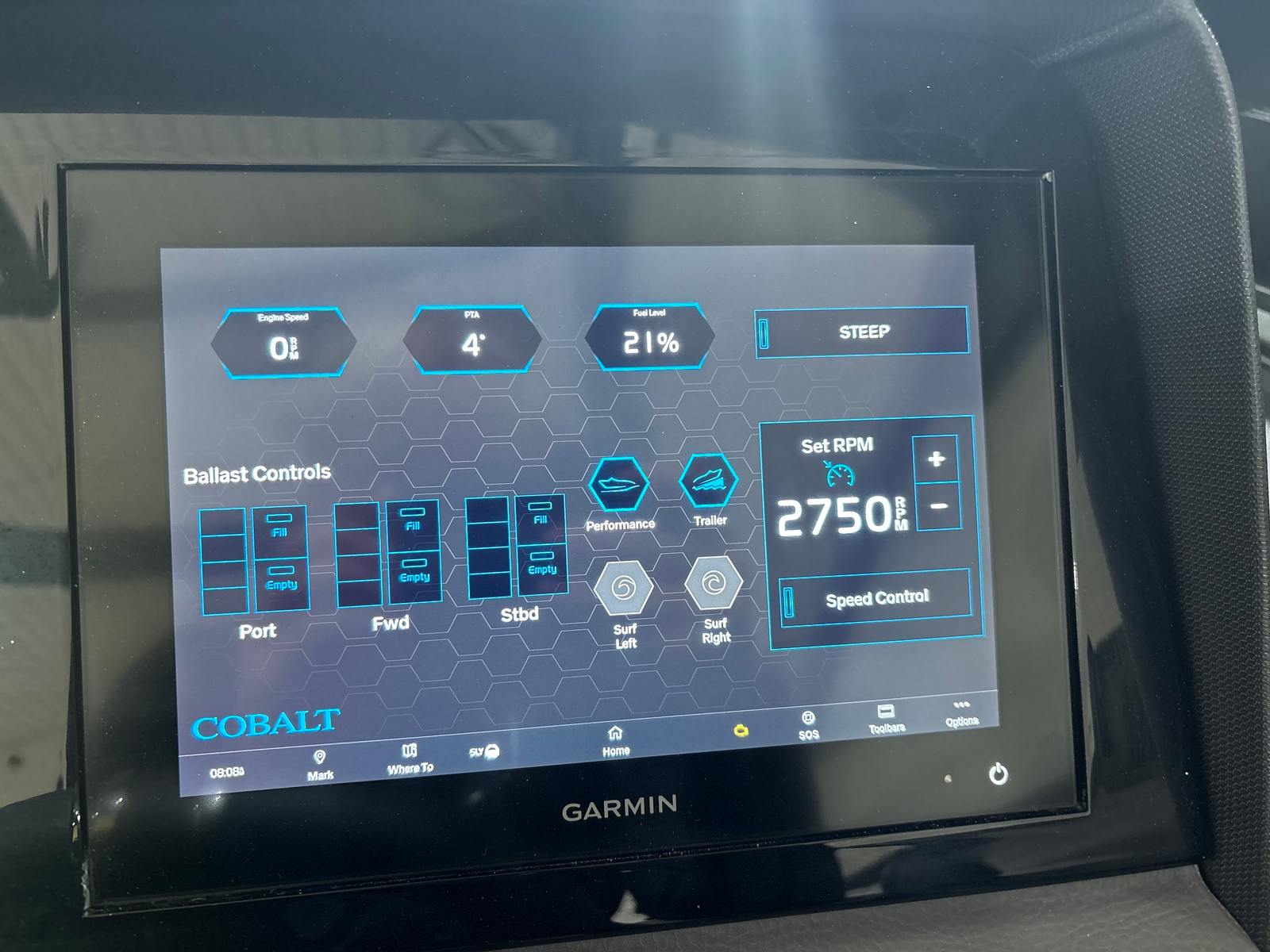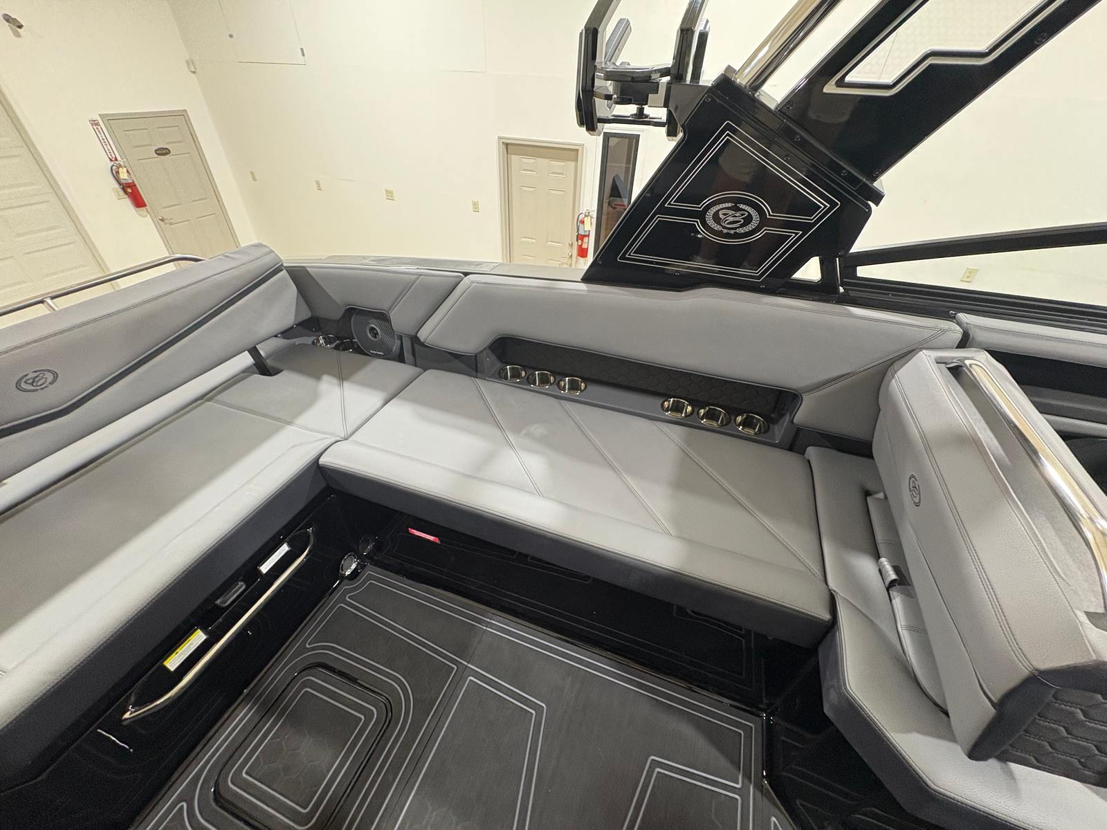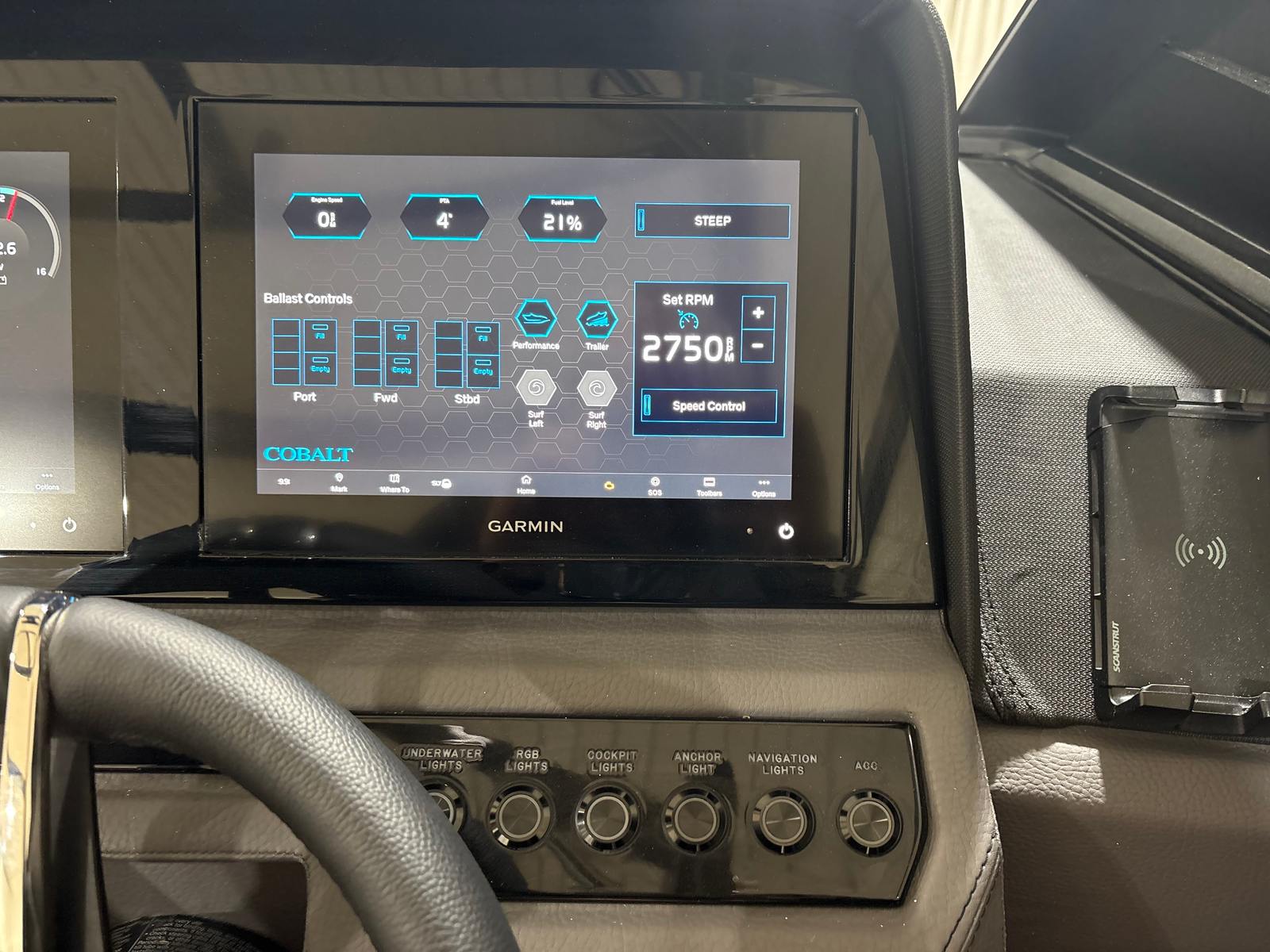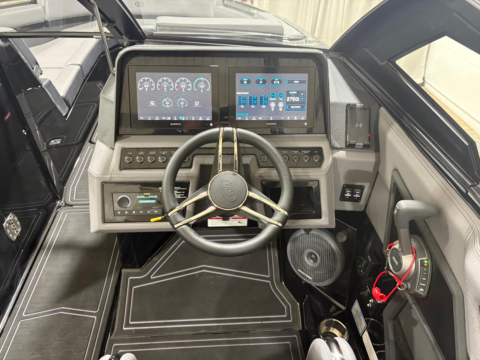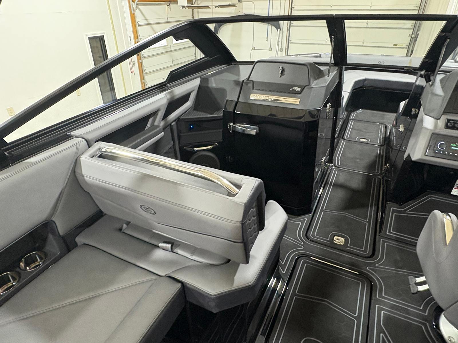The Cobalt R8 Surf is designed with practicality in mind, making ownership a breeze. The Gunwale Step simplifies boarding, especially when carrying gear or assisting children and guests. The four Fender Clips with Line make docking quick and hassle-free, reducing stress and protecting your investment.The SP BLK Alum Windshield with Model DES offers excellent visibility and protection, ensuring a comfortable ride in varying weather conditions. The Reaview Mirror, PTM with Custom Cover, enhances safety during water sports, allowing the captain to keep an eye on riders at all times.The wireless phone charger/holder adds a modern touch, keeping your devices charged and within reach. The underwater lighting not only enhances the boat’s aesthetic appeal but also improves visibility during nighttime outings, making evening cruises safer and more enjoyable.
