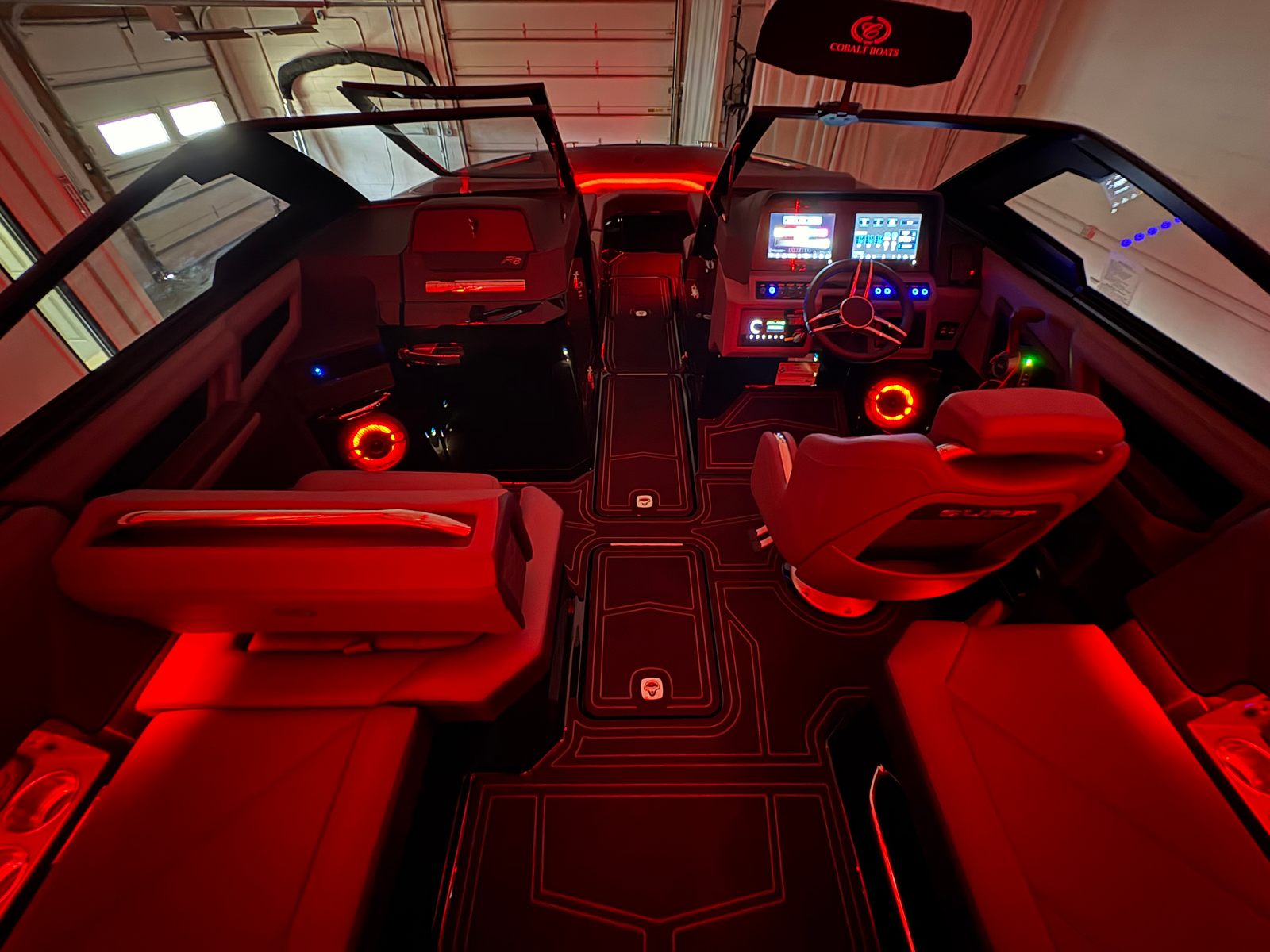 The 2026 Cobalt R8 Surf Bowrider is packed with premium features designed to enhance comfort, convenience, and safety. The Sof-Trac Mat provides a plush, non-slip surface throughout the boat, including the helm footrest in Ebony and Gray, ensuring a secure and comfortable experience for everyone on board. The Gunwale Step makes boarding and disembarking effortless, while the SP BLK Alum Windshield with Model DES offers protection from the elements and adds a sleek, modern touch.For added convenience, the boat is equipped with four Fender Clips with Line, making docking and mooring simple and stress-free. The Reaview Mirror, PTM with Custom Cover, ensures optimal visibility for the captain, enhancing safety during water sports and navigation. The wireless phone charger/holder keeps your devices powered and accessible, so you can stay connected while enjoying your time on the water.Underwater lighting in red, green, and blue creates a captivating ambiance during evening cruises, adding a touch of luxury to your boating experience. The thoughtful design and high-quality materials used throughout the R8 Surf reflect Cobalt’s commitment to excellence and innovation.
