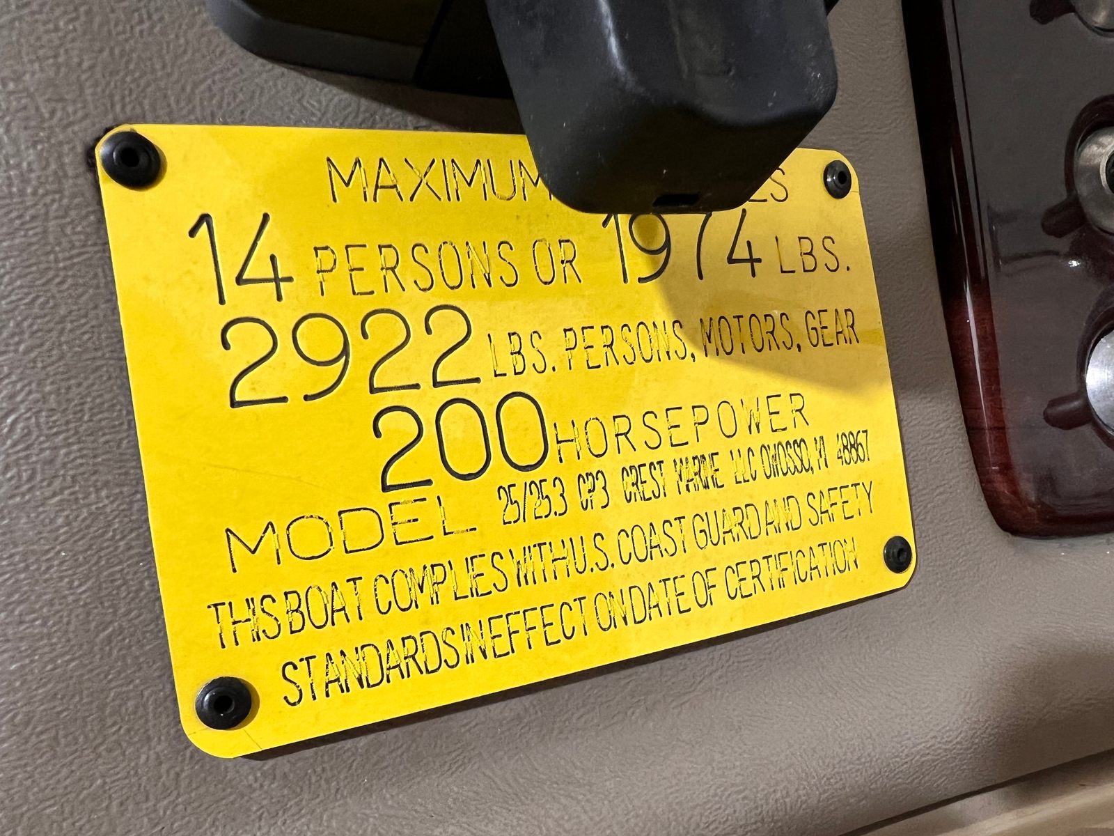 The 2013 Crest Classic 250 is a spacious 26-foot pontoon boat designed to maximize your enjoyment on the water. With its generous length and thoughtful layout, this Crest boat for sale offers ample room for relaxation, socializing, and adventure. The Classic 250 is built to accommodate up to 14 persons with a total capacity of 1,974 lbs., making it ideal for large groups or family outings. Its used condition ensures you get exceptional value, while still benefiting from Crest’s reputation for durability and quality construction.