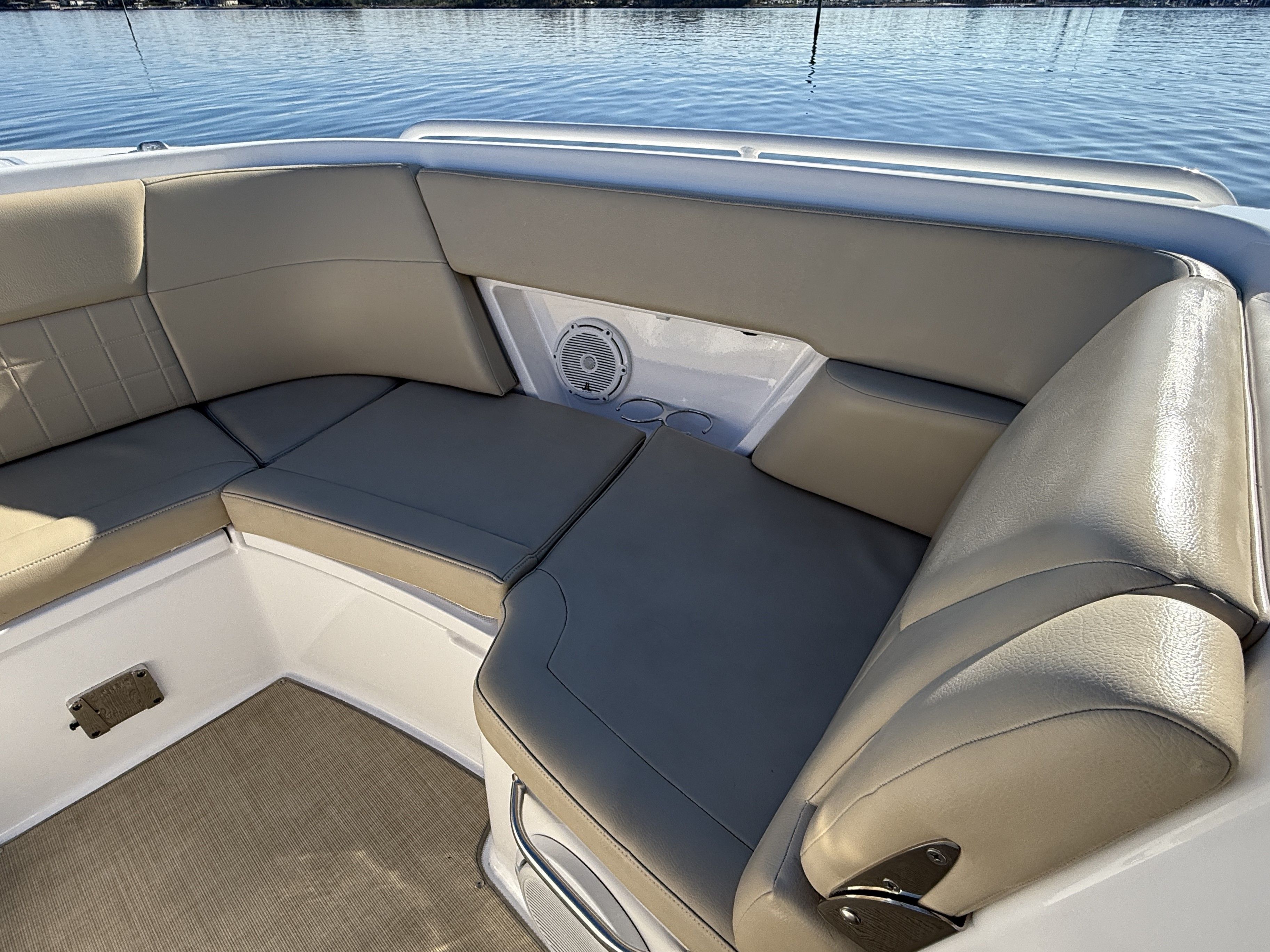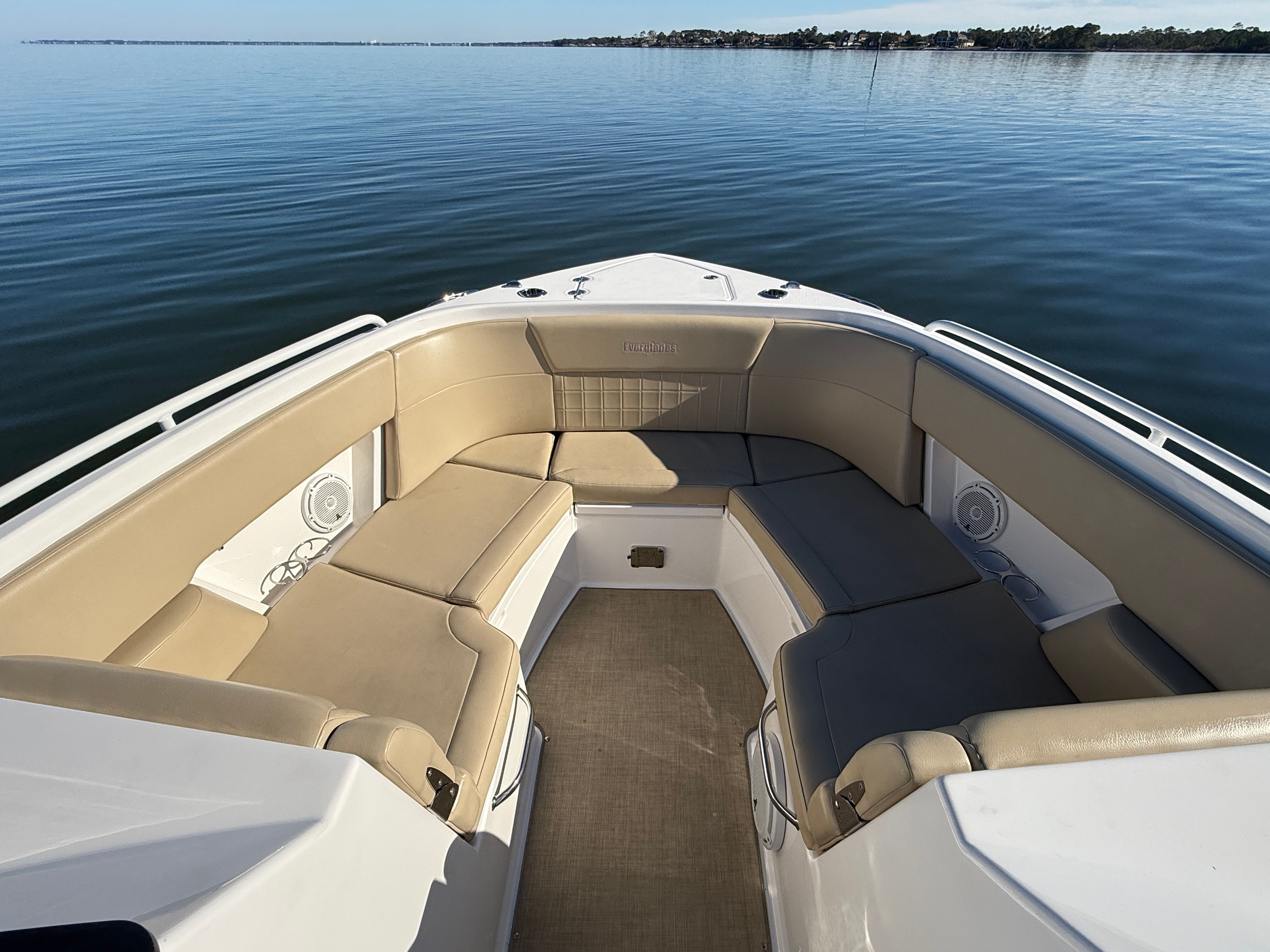 The Everglades 340 DC is loaded with features that enhance both your boating experience and your time on the water. The dual console design provides separate helm and passenger areas, ensuring comfort and convenience for everyone on board. The spacious cockpit and bow seating areas are perfect for socializing, sunbathing, or simply enjoying the view. The high-quality construction and attention to detail are evident throughout, from the premium upholstery to the thoughtfully designed storage compartments. With a length of 33.5 feet, this boat offers generous deck space, making it easy to move around and accommodate guests. The Everglades 340 DC is designed for both relaxation and adventure, with features that cater to a wide range of activities.