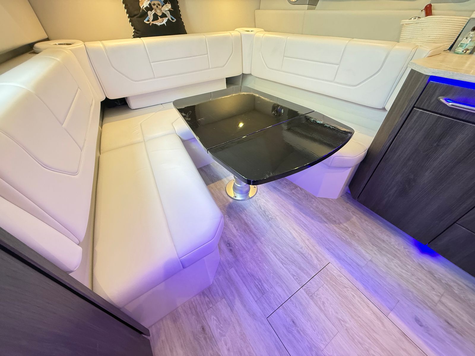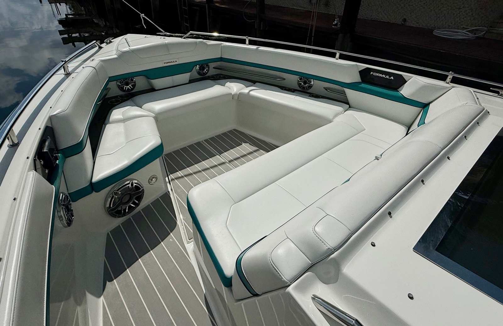 Woodgrain vinyl decking on swim platform and throughout the cockpit