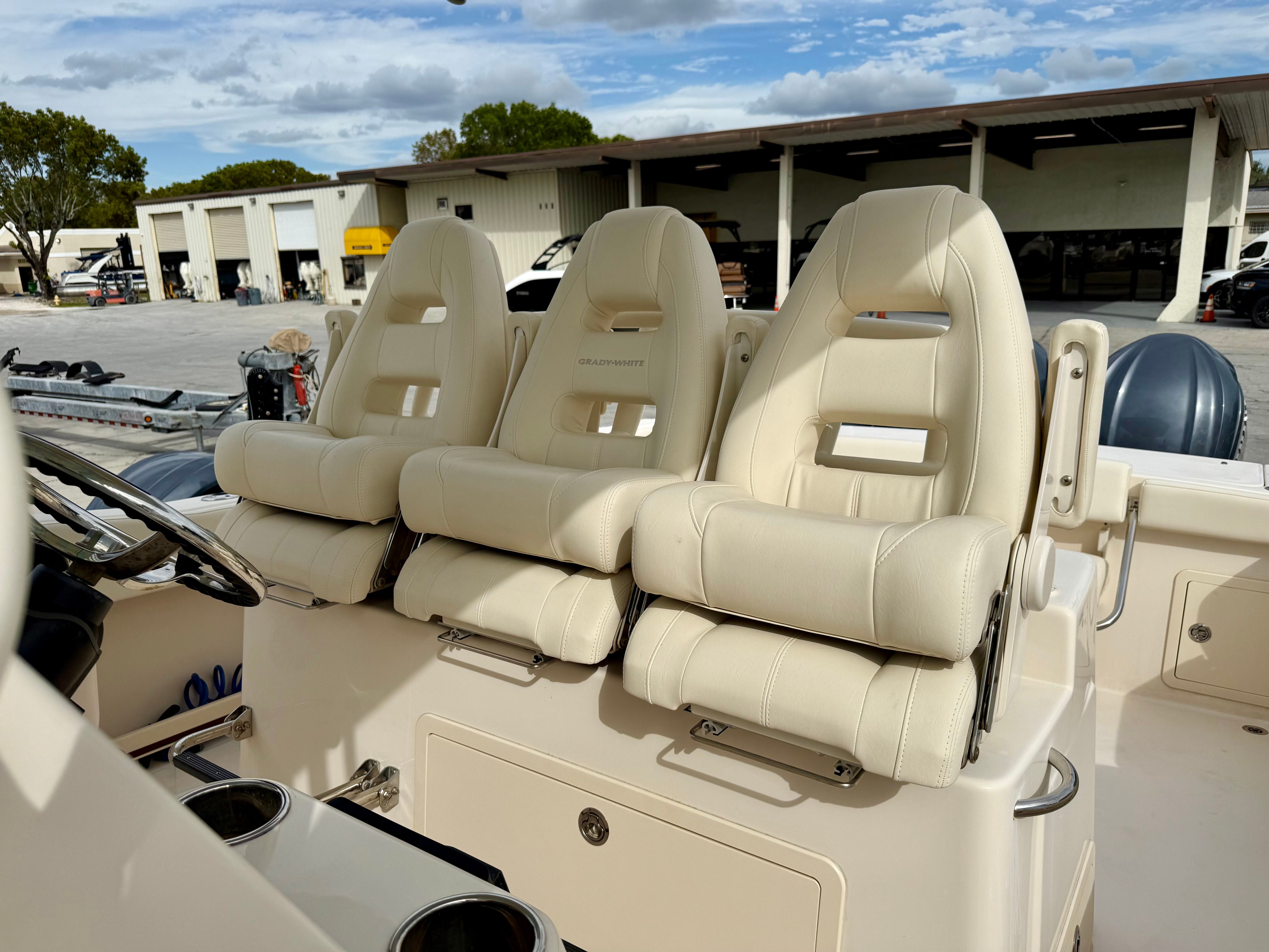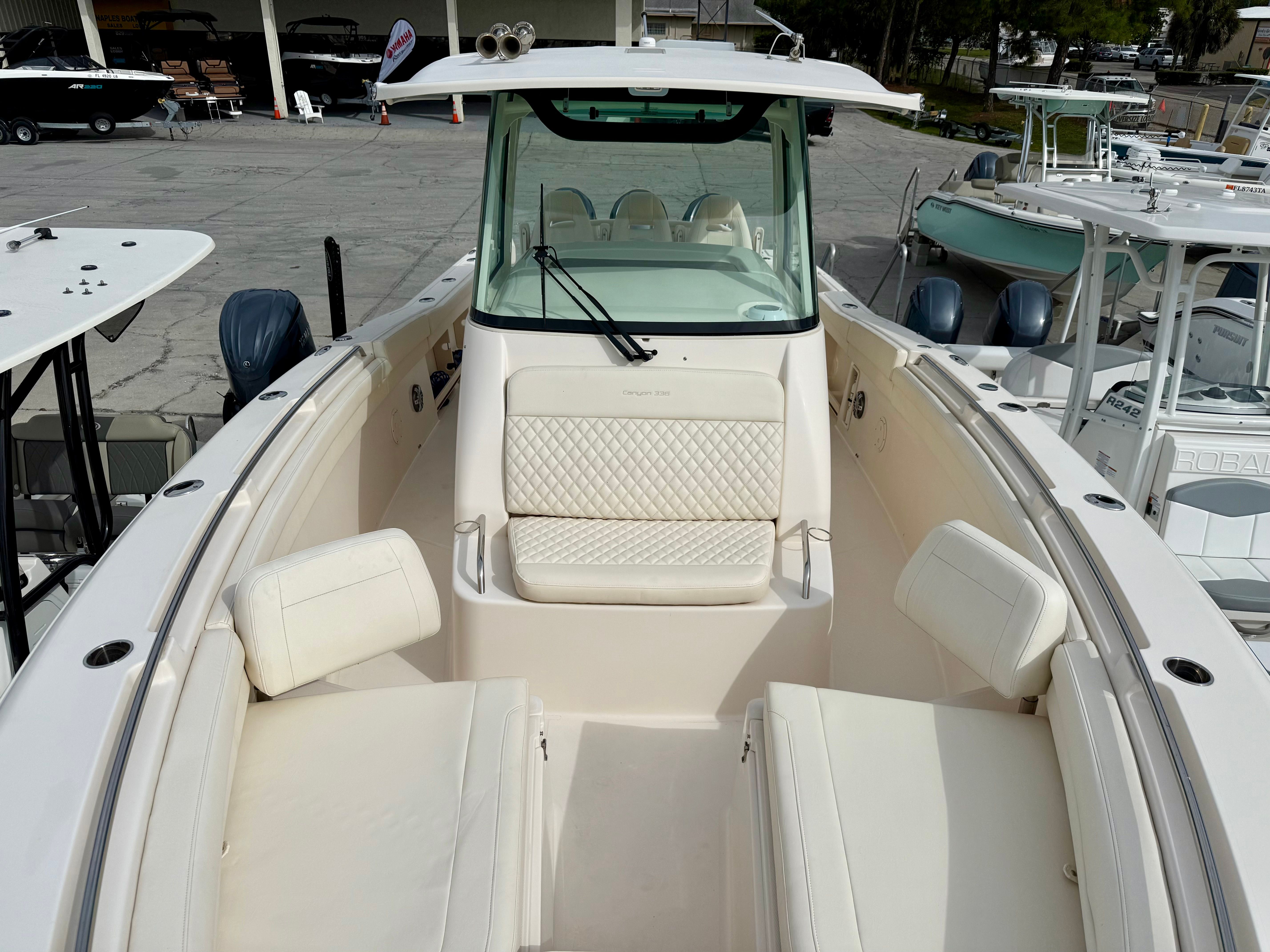 Consigned from a local customer, this impressive 2023 Grady-White Boats 336 Canyon has just been professionally cleaned and serviced, making it fully prepared for its next owner. Powered by triple Yamaha 300HP outboards with only 84 hours of use, this vessel combines power, reliability, and performance. A fresh 100-hour service has just been completed, ensuring that all systems are ready for the water. This 336 Canyon is equipped with twin Garmin 16-inch navigation displays featuring sonar for precise charting and fish finding, a Fusion stereo system for premium sound, Yamaha autopilot, Garmin VHF radio, trim tabs, a fully equipped marine head, and abundant seating from bow to stern for comfort and versatility. The layout is designed for both serious offshore fishing and leisurely family cruising. A fresh coat of bottom paint has also just been applied, adding to the vessel’s turnkey readiness. Call us today to schedule your private viewing. All preowned boat pricing includes financing through Naples Boat Mart with approved credit.