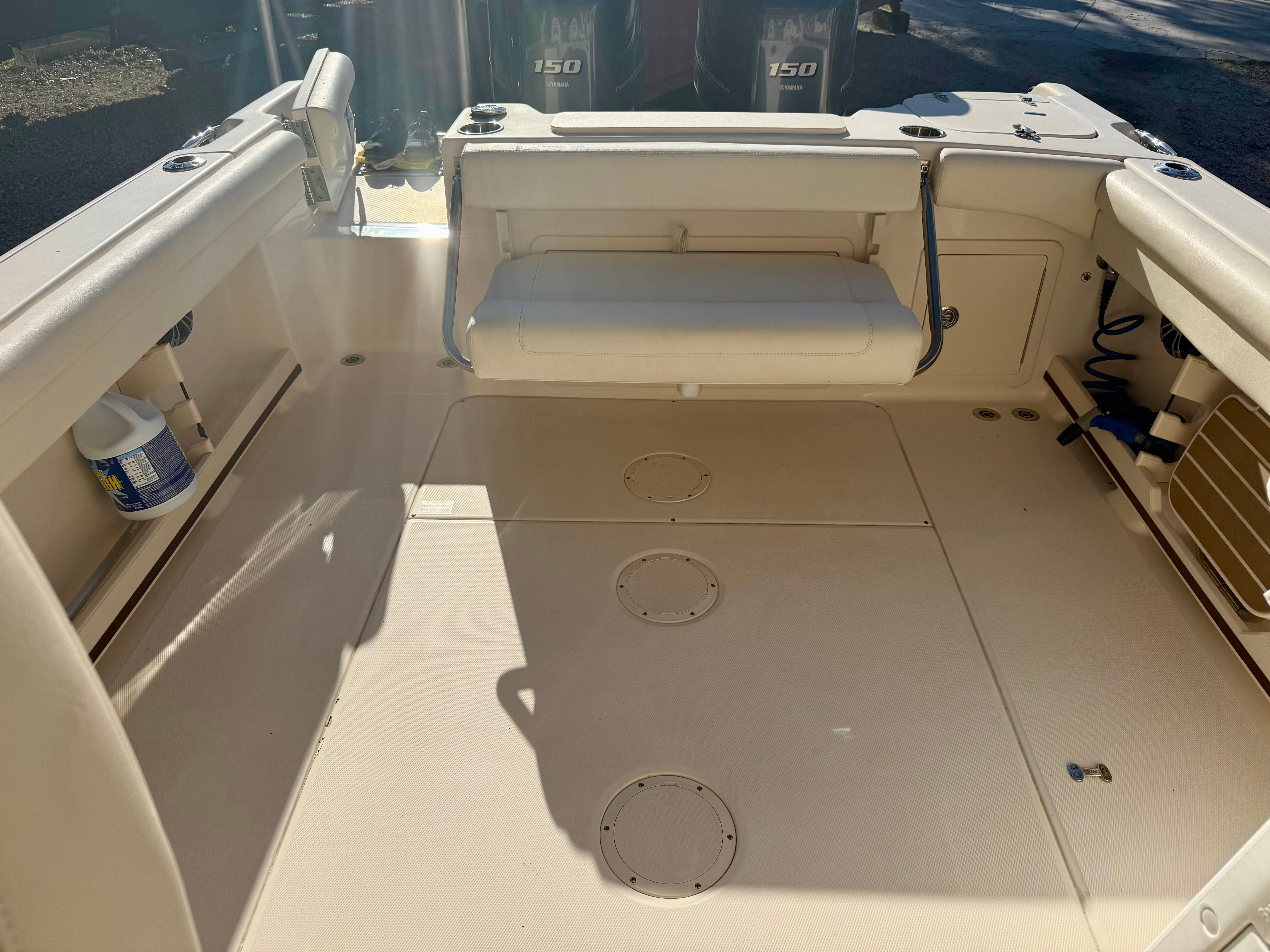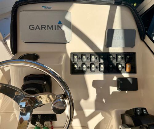 Powering this boat are twin Yamaha F150 four-stroke outboards with only 237 hours, delivering reliable performance, excellent fuel efficiency, and smooth, quiet operation. At the helm, the boat is equipped with a Garmin 9-inch navigation display with sonar, providing clear, easy-to-read charting and depth information for confident navigation inshore or offshore. Yamaha CL5 digital gauges offer real-time engine data and system monitoring at a glance, keeping the operator fully informed at all times.