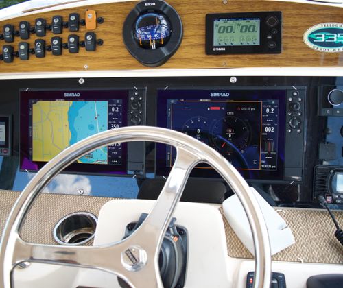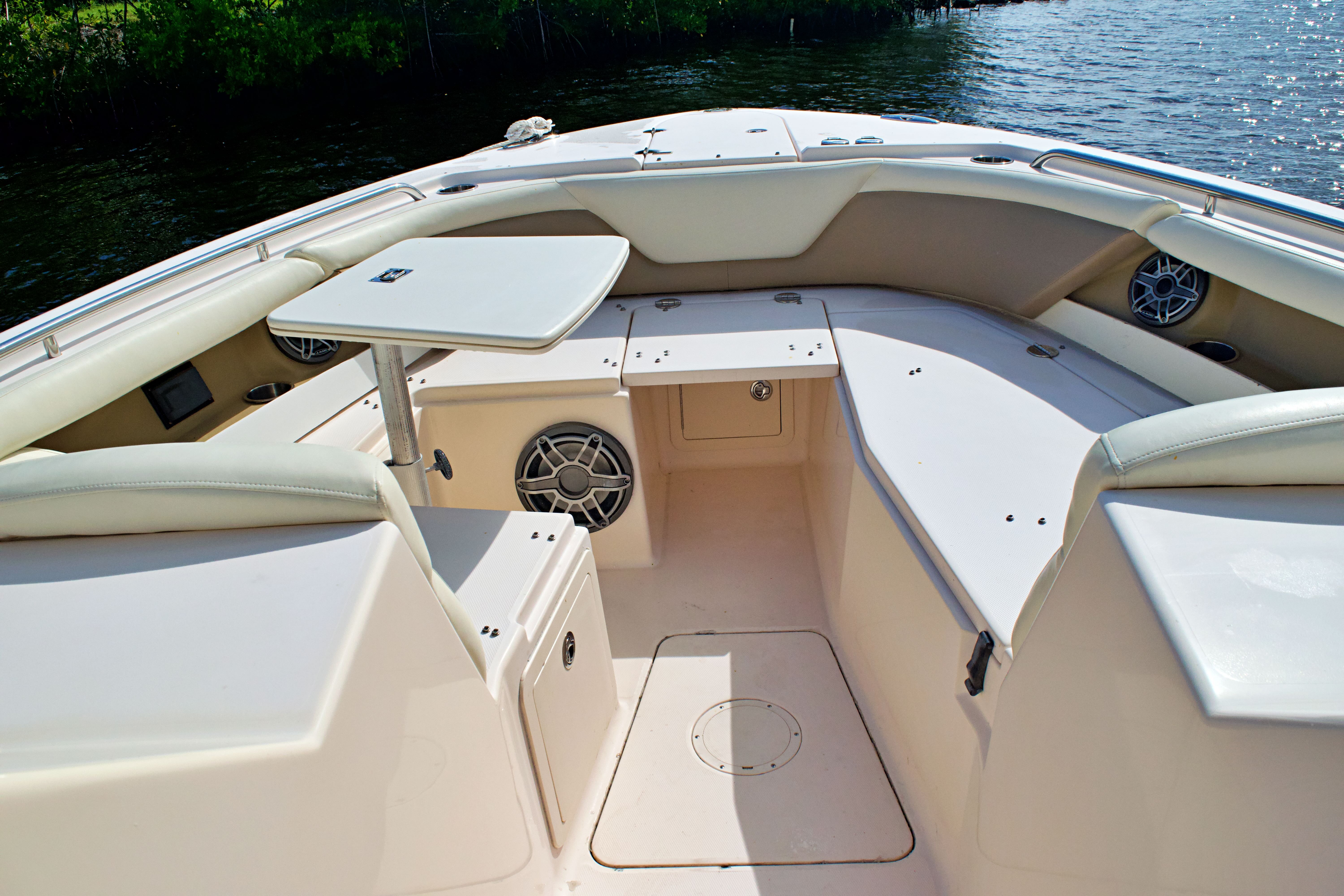 The Grady-White 335 Freedom is as practical as it is enjoyable. Its thoughtful design includes ample storage for gear, water toys, and personal items, keeping the deck clutter-free and organized. The dual console layout makes docking and maneuvering easier while using the joy-stick controlled bow thruster giving you confidence in tight marinas or when approaching the dock after a day on the water. Fuel efficiency is another highlight, thanks to the advanced engineering of the twin Yamaha engines. You can spend more time exploring and less time refueling, making every outing more enjoyable. The boat’s robust construction and quality materials ensure durability and low maintenance, so you can focus on making the most of your time on the water.