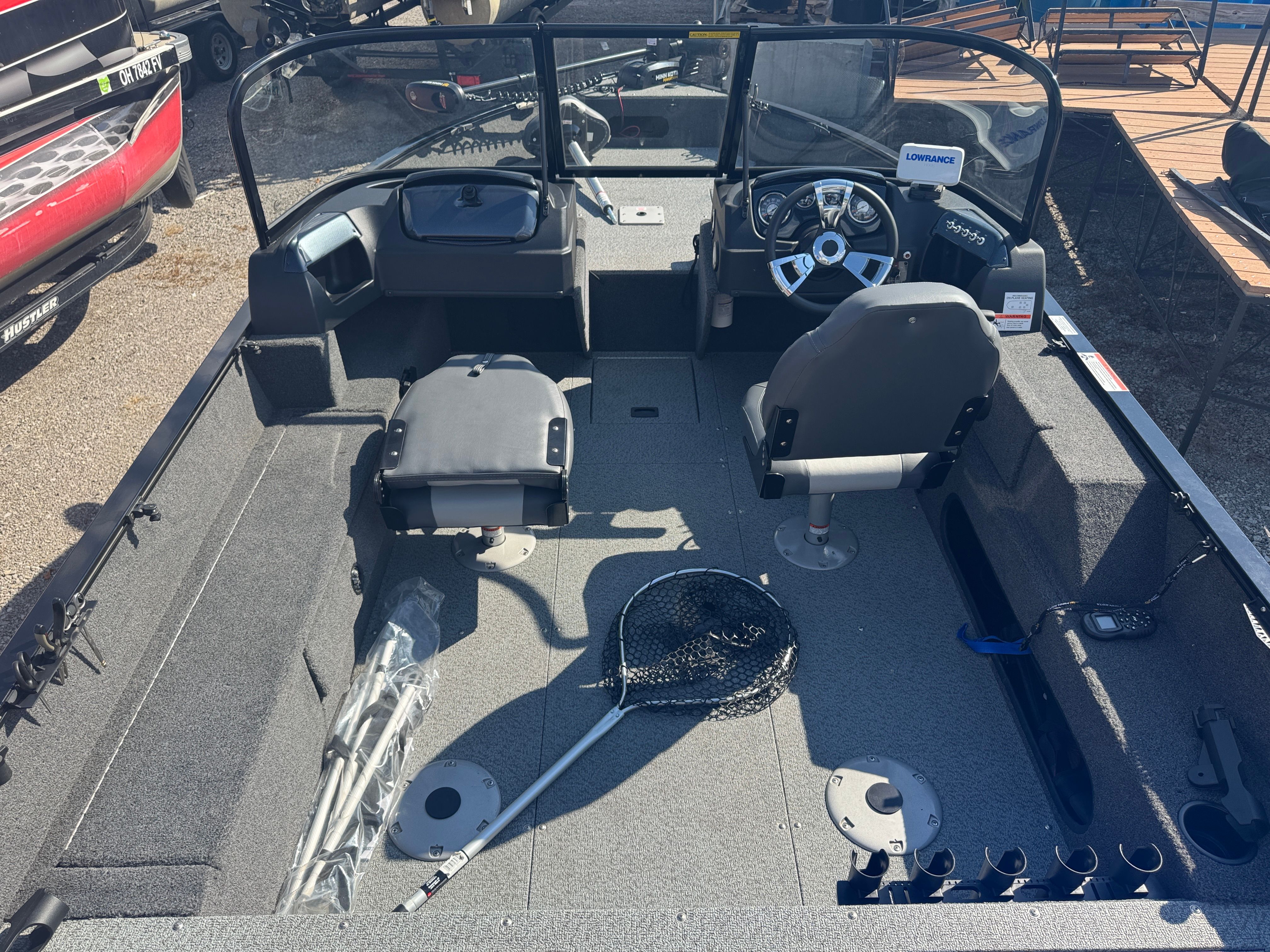 The walk-through windshield offers excellent protection from wind and spray, while the spacious cockpit and wide beam provide plenty of room for family or fishing partners. You’ll find multiple casting decks, livewells, and ample storage for rods and tackle—everything you need for a productive day on the lake.
